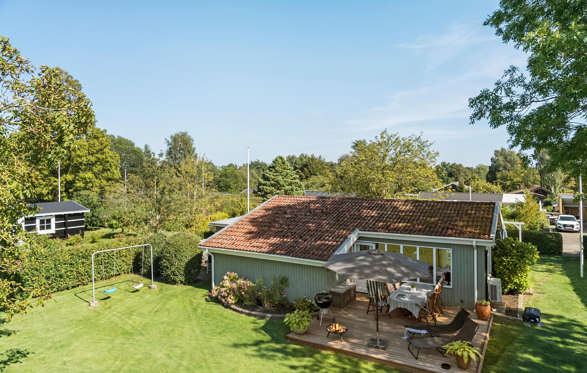 På træterrassen er der både sol og skygge, så her kan I nyde alle de dejlige sommerdage. Fyr op i grillen, når I vender hjem efter dagens eventyr eller hyg jer med at riste skumfiduser ved bålpladsen. Der er god plads til boldspil i haven, og de små vil sikkert kaste sig over gyngerne, så snart de ankommer.