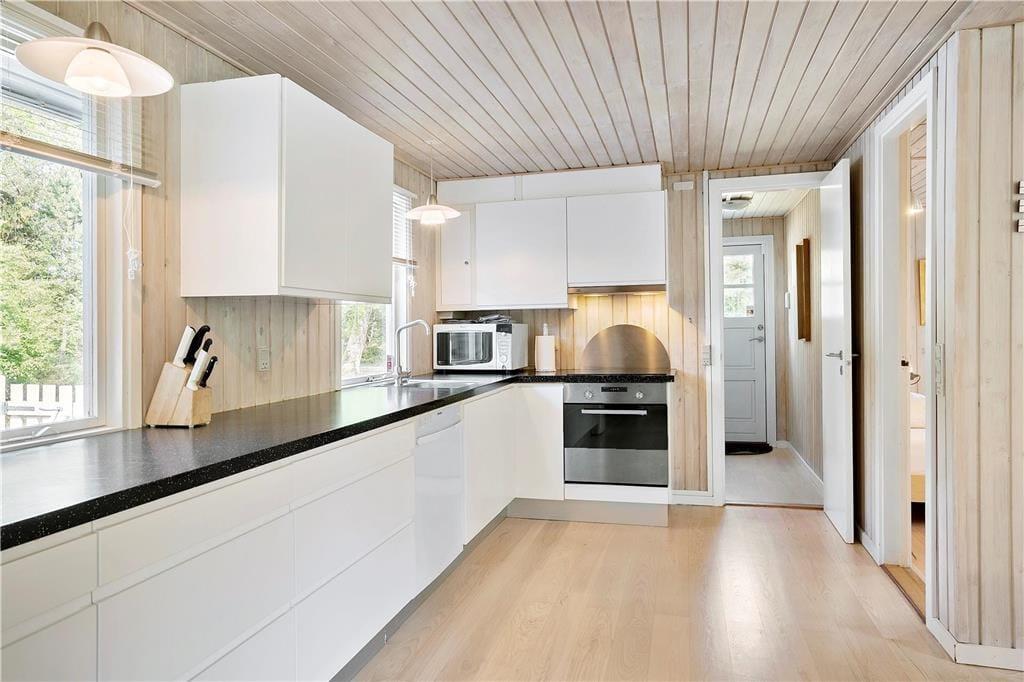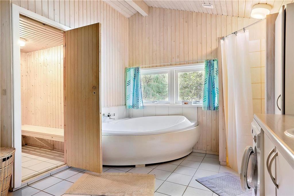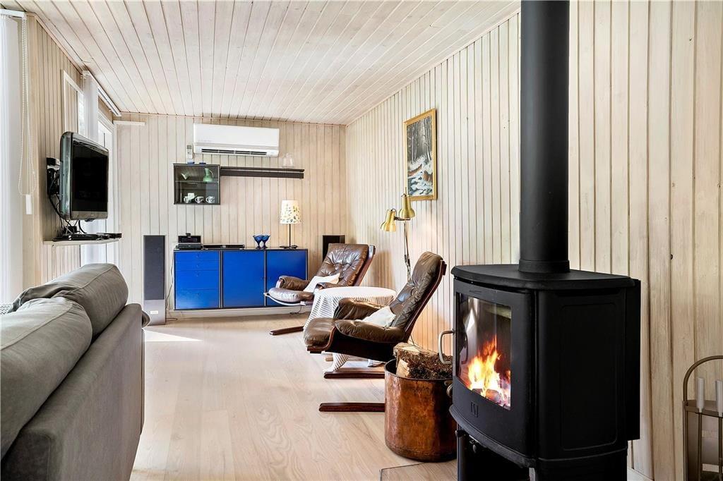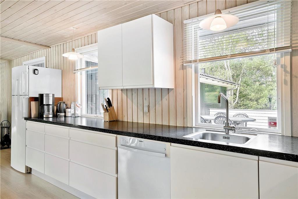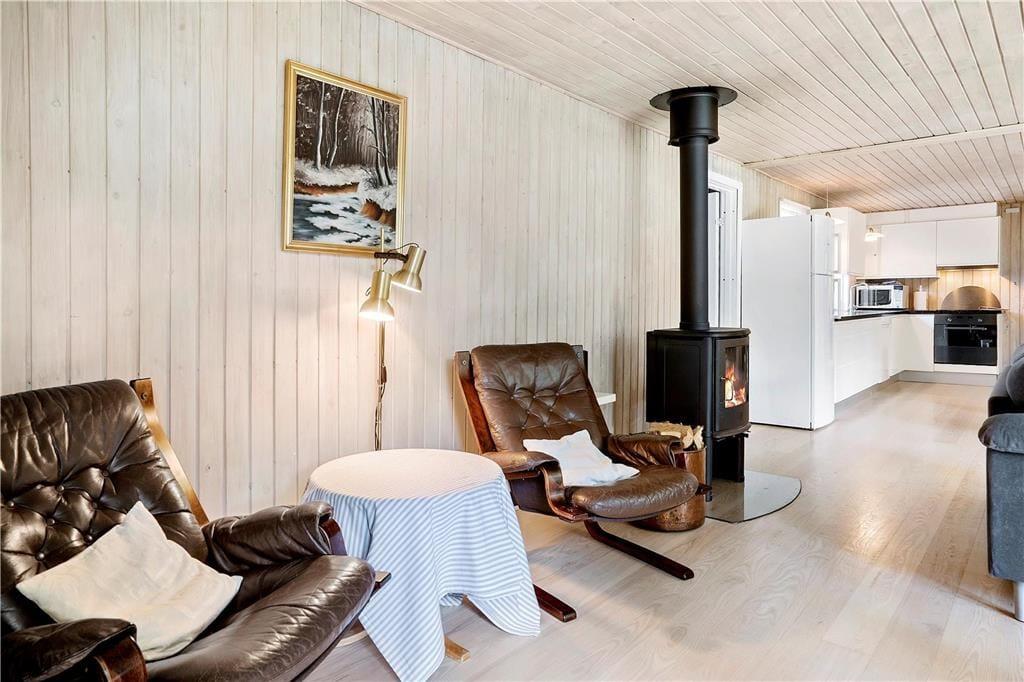 I dette flotte og moderne sommerhus kan hele familien være sikker på en vellykket ferie med fokus på at være sammen og udnytte pausen fra hverdagens høje tempo. Køkken, spiseafdeling og stue er samlet i ét stort og lyst rum, her kan I være sammen om alle aktiviteter fra måltider og ludospil, til afslapning foran tv’et efter en lang og aktiv dag. Med ild i brændeovnen og en kop varm kakao i hånden er sommerhuset også velegnet til ferie udenfor sommersæsonen, og fylder I spabadet med varmt vand og tænder op i saunaen har I jeres egen lille wellnessafdeling på det største af de to badeværelser.