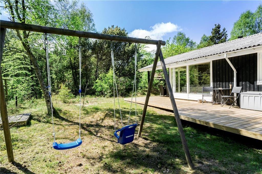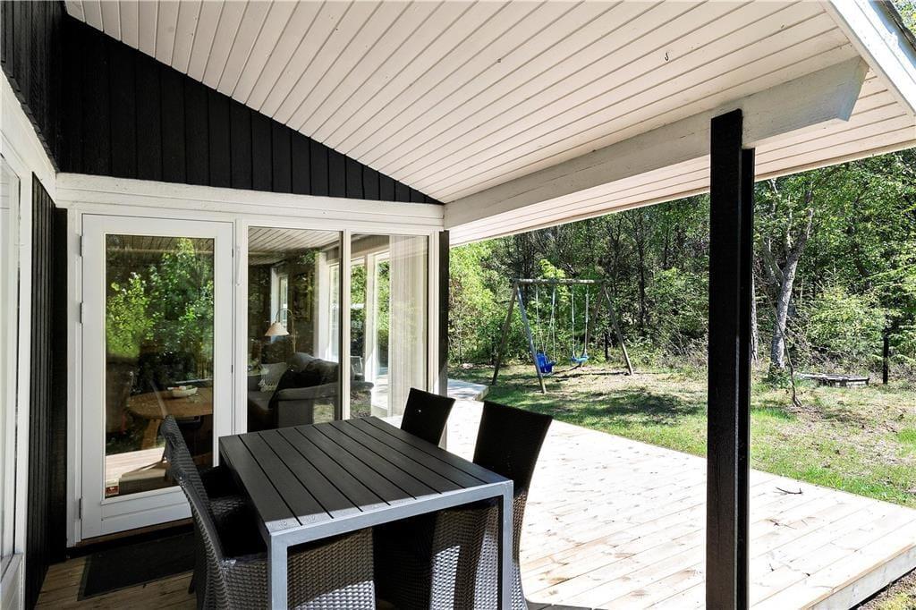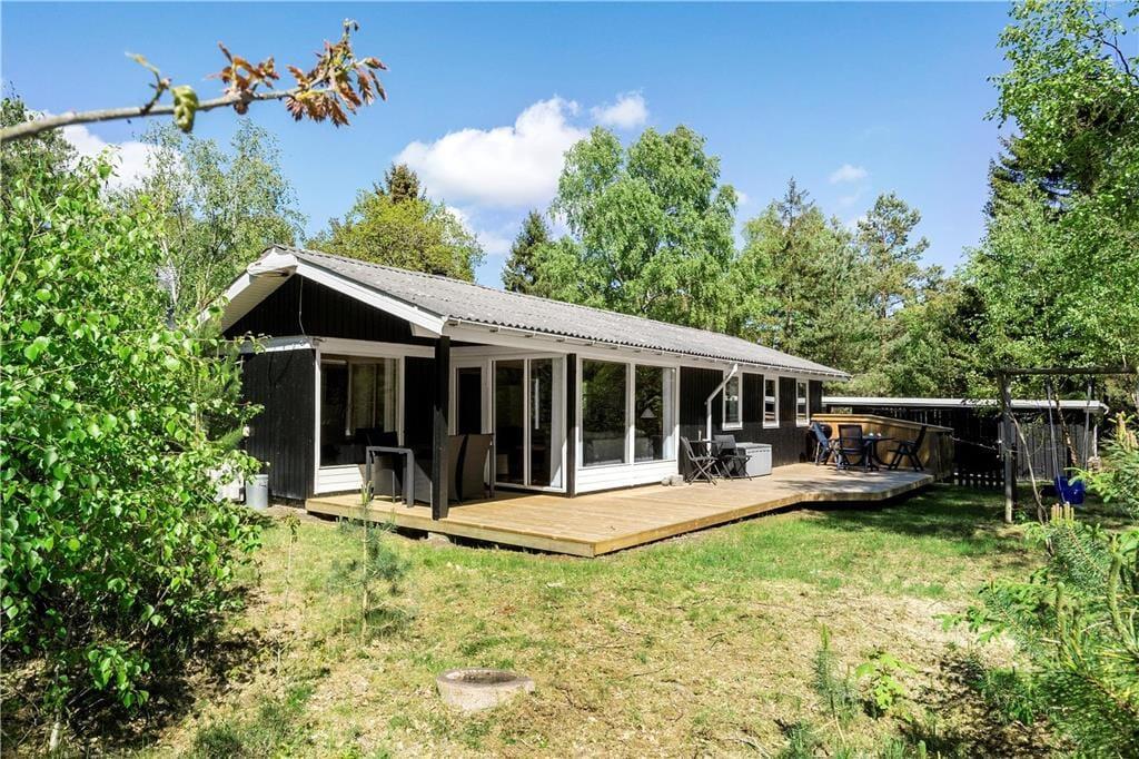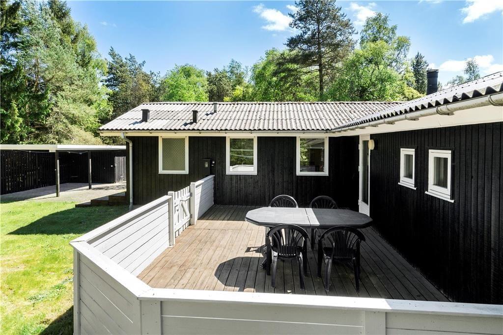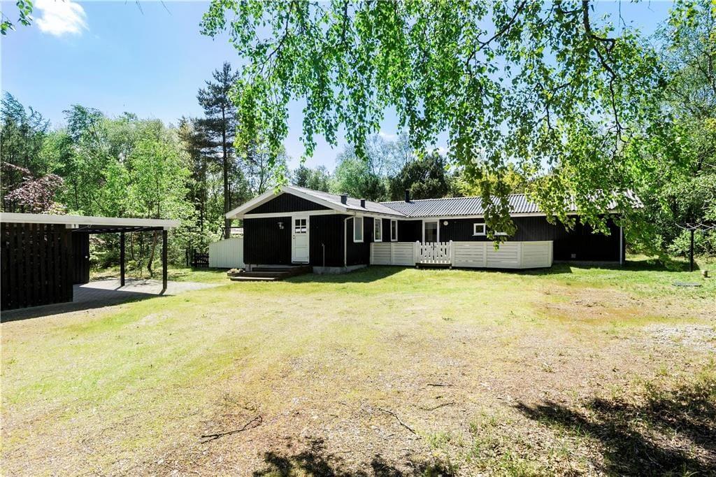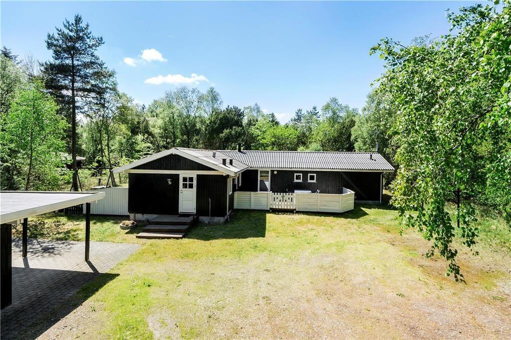 Sommerhuset ligger inde i skoven og er derfor omgivet af den smukkeste natur: høje træer, buske, vildt græs; en lille og fredfyldt oase. På terrasserne kan I hele dagen nyde sommerens gode vejr, og om senere er det godt at trække ind under den overdækkede del og udnytte de lange og lune aftentimer. Til børnene er her gynge og sandkasse, og bilen kan stå godt og trygt i carporten.