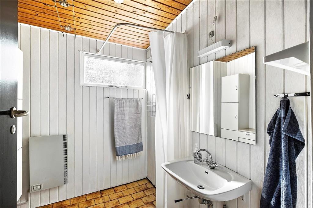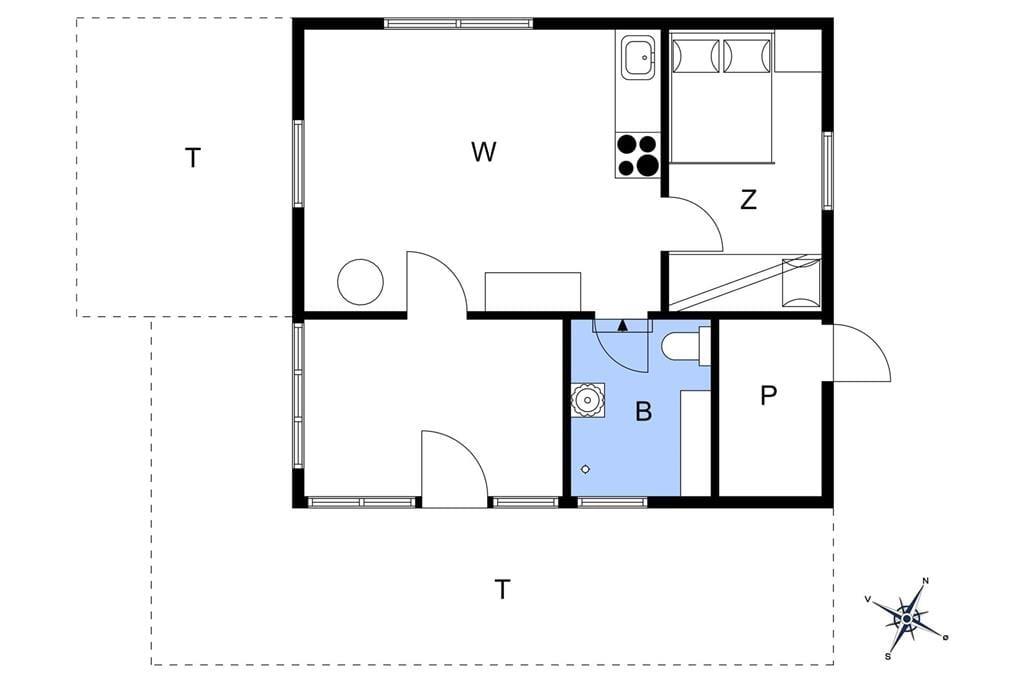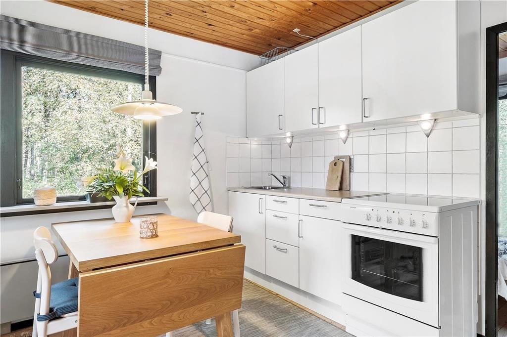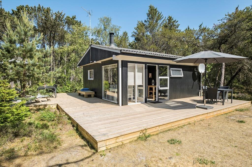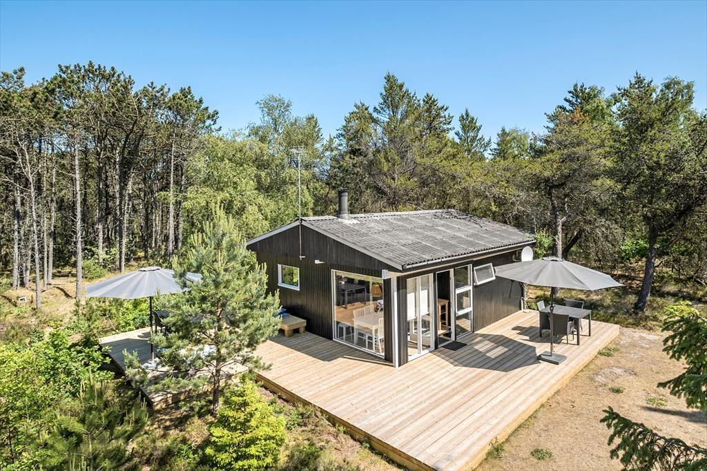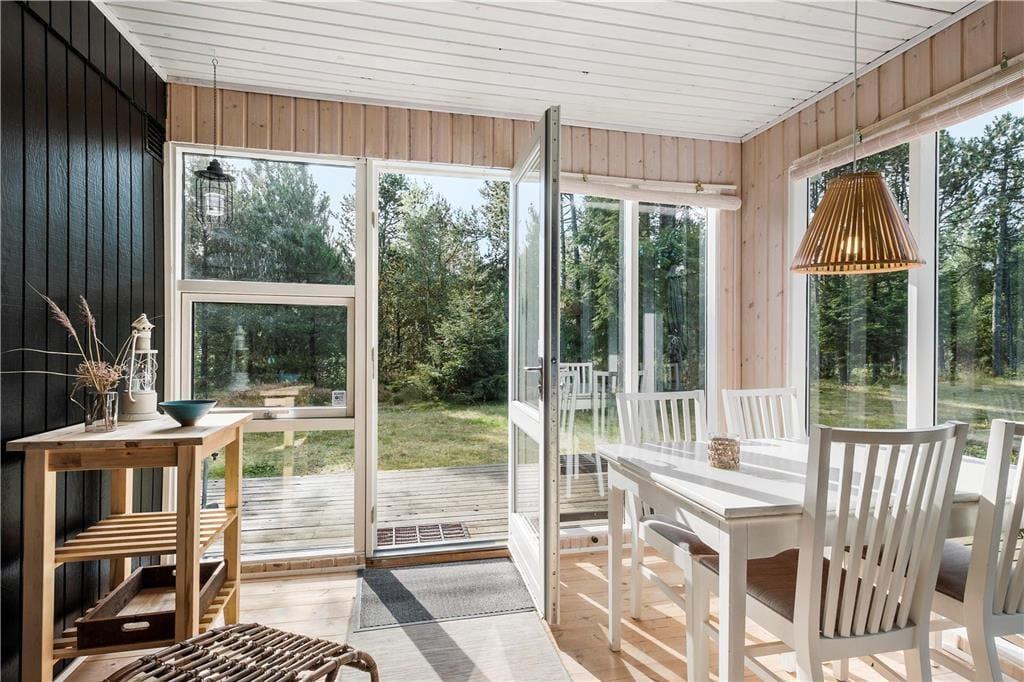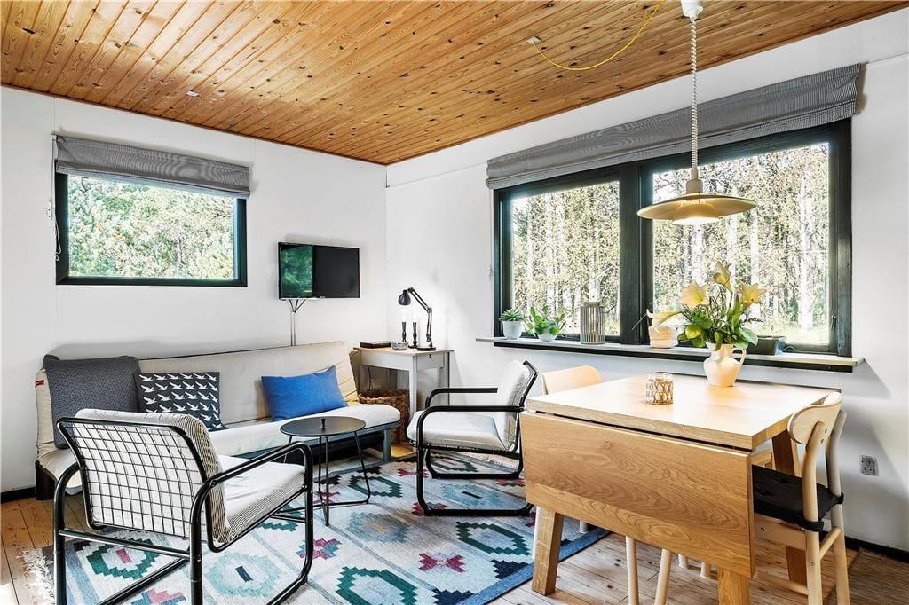 På papiret har dette klassiske, danske sommerhus ikke lige så mange m2 at prale af som de nye og topmoderne huse; til gengæld fungerer det helt perfekt for den lille familie med et eller to børn eller for parret, som trænger til at komme hjemmefra og have tid til hinanden. Det åbne opholdsrum består af køkken og stue med tv og brændeovn, og herfra har man adgang til en dejlig udestue med store vinduespartier, hvor man kan sidde og betragte den smukke natur og dyre-og fuglelivet med dådyr, pindsvin, egern, fugle og andre af skovens vilde dyr, som ofte kommer helt tæt på. På soveværelset er både en dobbeltseng og en køjeseng, og badeværelset er udstyret med bruser. Velfungerende og absolut hyggelige rammer for en skøn ferie i det nordjyske.