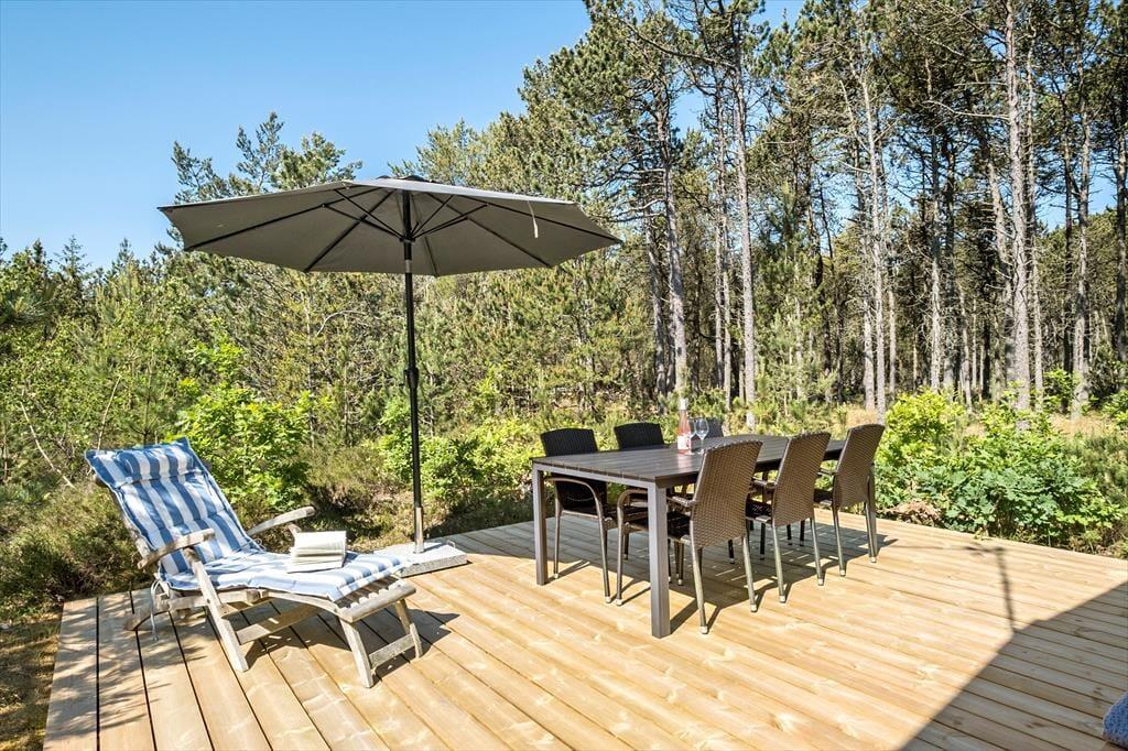 Sommerhuset ligger på en dejlig naturgrund omgivet af høje træer og mindre buske, her kan man være i fred og ro og nyde skovens idyl. Mod syd og vest er to skønne terrasser, hvor man rigtig kan nyde solen og varmen og hygge med grillmåltider og et godt glas vin om aftenen.