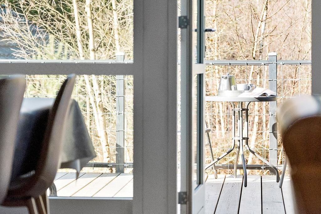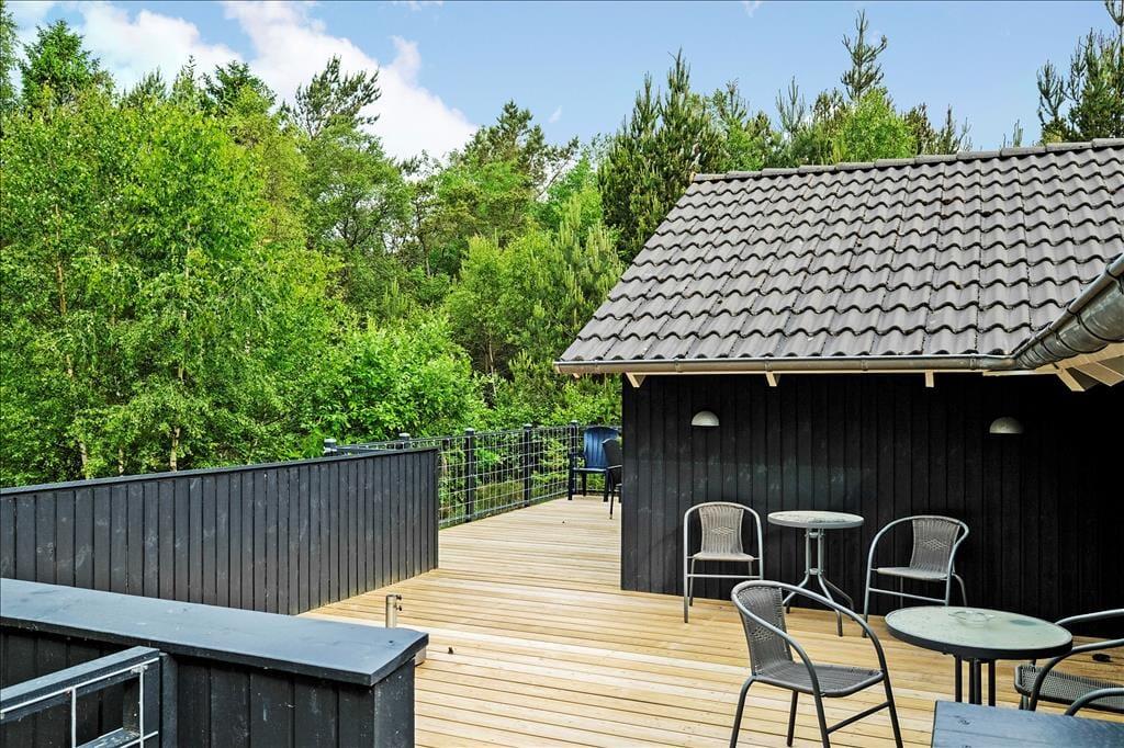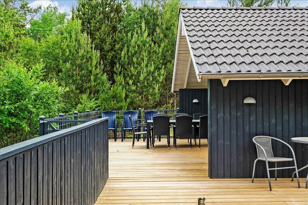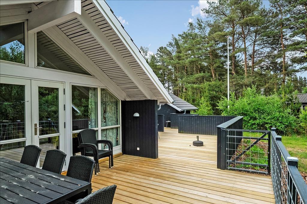 Den store grund er delvist indhegnet og dermed meget hundevenlig, og på alle sider har I en skøn udsigt til den omgivende natur. Sommerhuset har flere gode terrasser; åbne, hvor I kan nyde solens stråler og tilberede lækre måltider på grillen, og en overdækket del, som ligger i forlængelse af stuen og derfor er god til de lange og lune aftener.