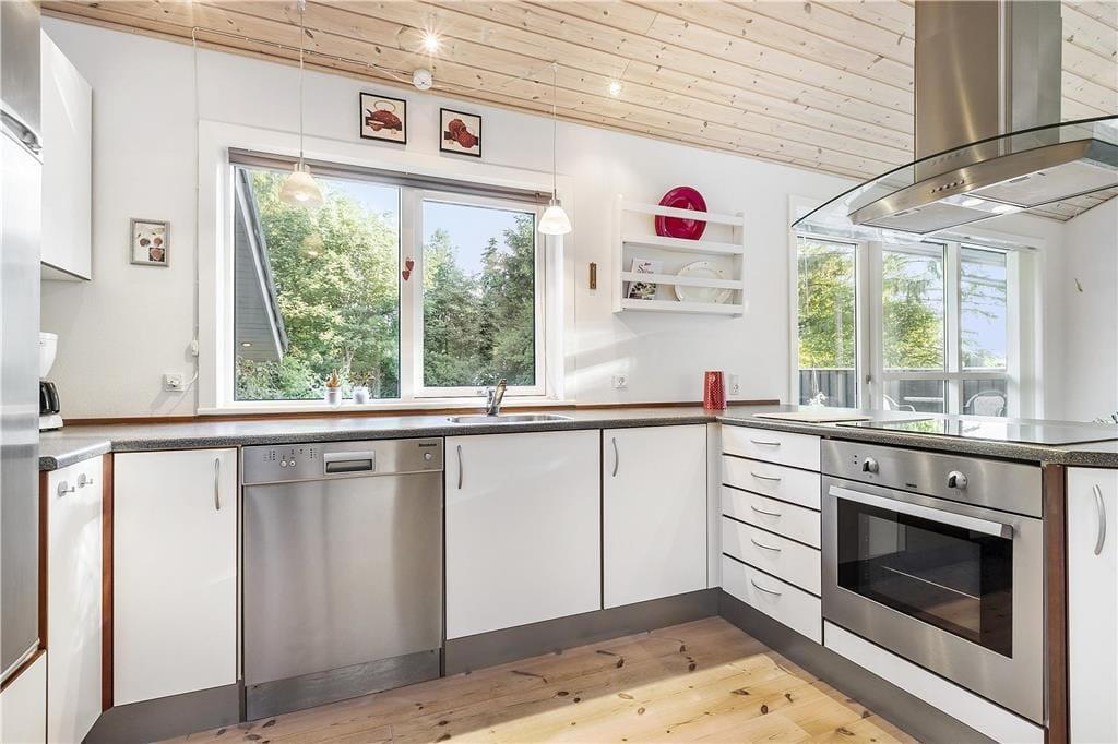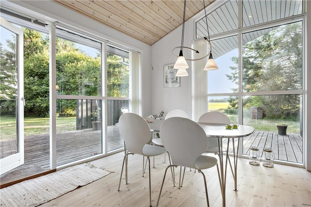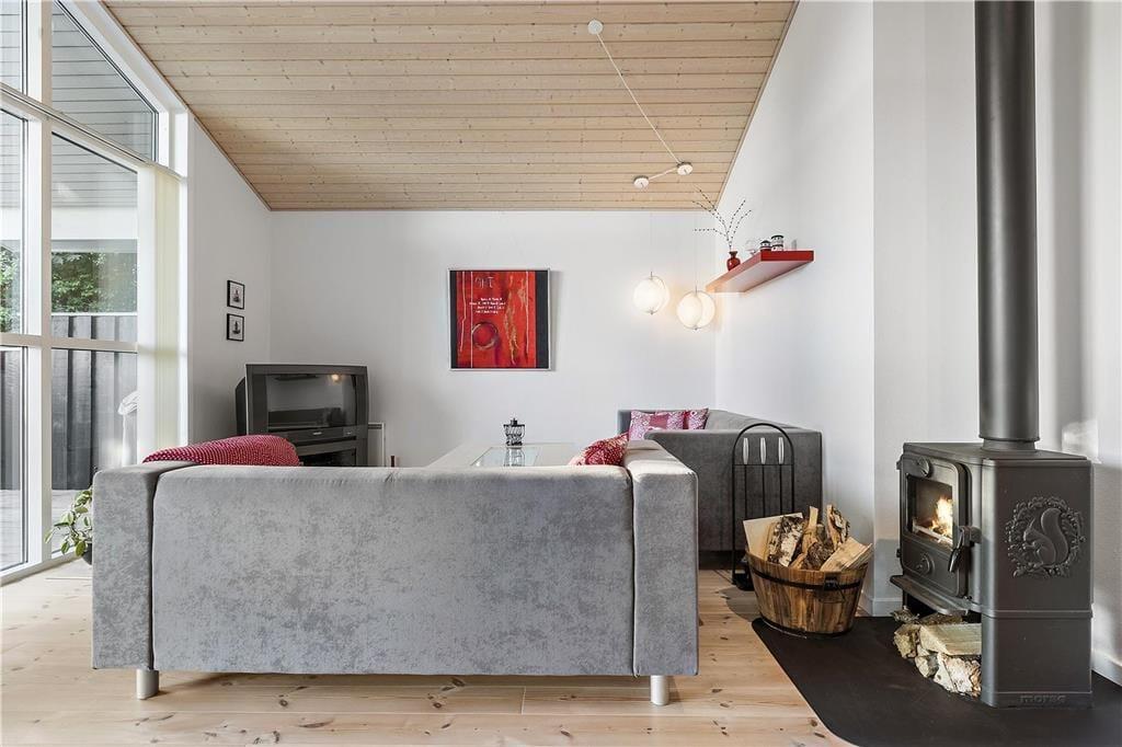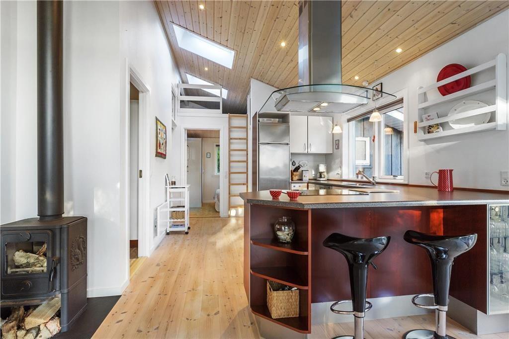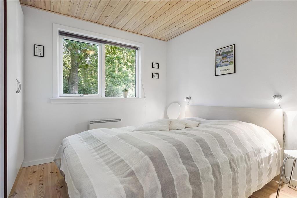 Kvadratmeterne er godt udnyttede i huset, der byder på tre soveværelser, et bryggers med vaskefaciliteter, et lækkert badeværelse og en stor stue med integreret køkken, hems og brændeovn. Indretningen er lys og indbydende i alle rum, og de store vinduespartier sørger for et godt lysindfald, der også bidrager til den dejlige atmosfære. Vinduerne åbenbarer også udsigten til den grønne have, og i stuen kan I endda skue ud over det åbne marklandskab fra det høje gavlvindue. Stuen er et herligt sted at hygge sig med brætspil, film og lækre måltider. Og har I brug for at skrue ekstra op for velværen og afslapningen, kan I tænde for saunaen og gøre spabadet klar på badeværelset.