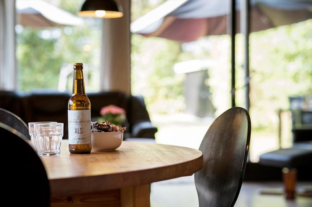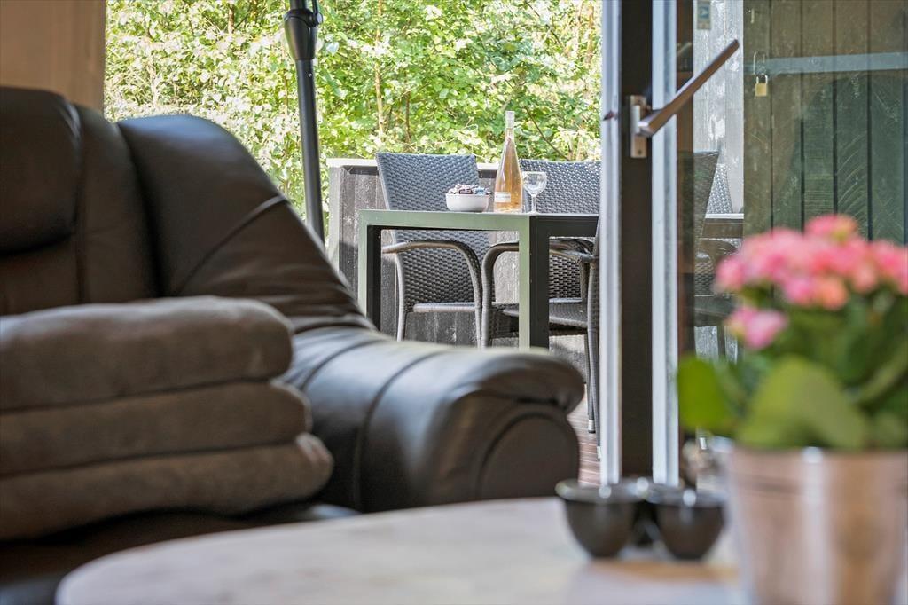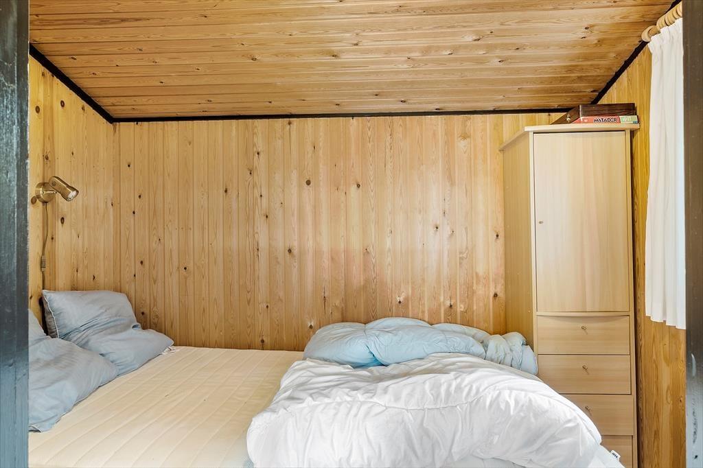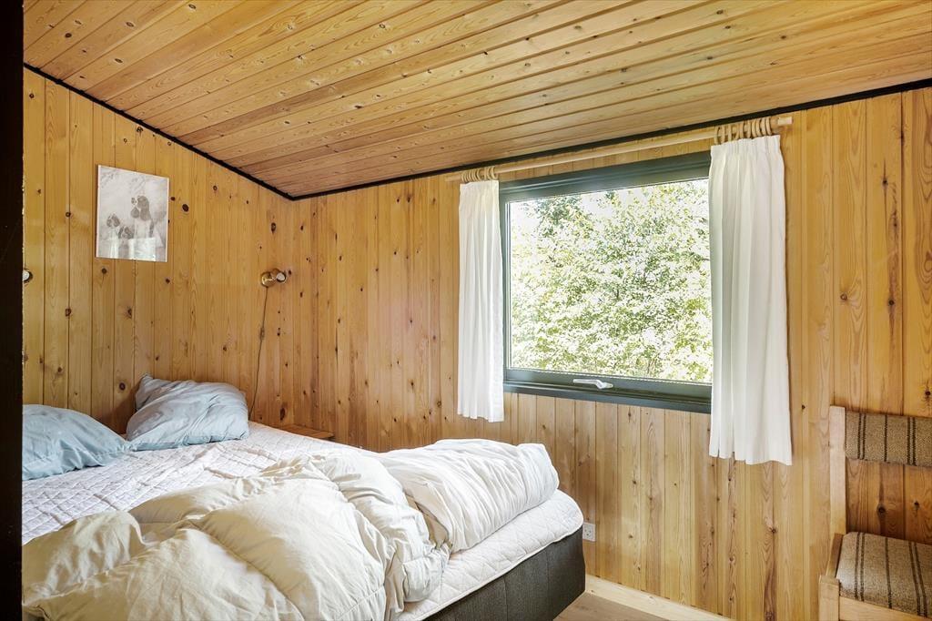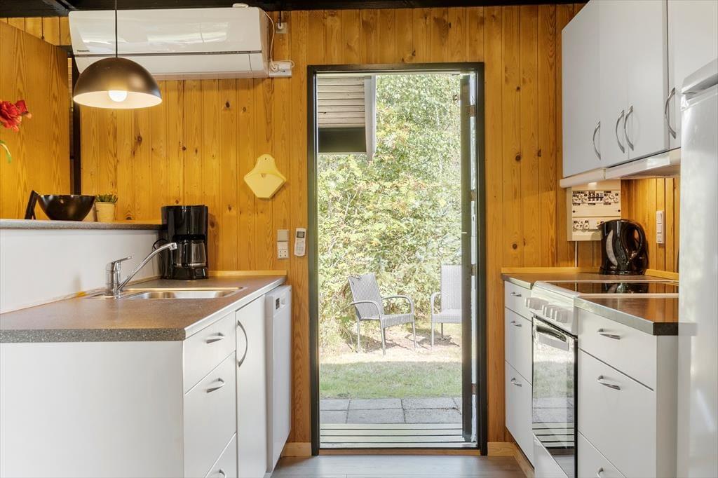 Husets køkkenalrum er i åben forbindelse med stuen. Her kan man rigtig nyde naturen og haven udenfor, gennem de store panoramavinduer. Køkkenet er fint udstyret, så man kan kreér lækkert mad til hele familien. Hvis det bliver køligt kan man tænde op i pejsen og nyde ilden knitre og feriestemningen. Huset har plads til familien eller vennerne der gerne vil på tur sammen. Her er tre soverum; alle med dobbeltsenge