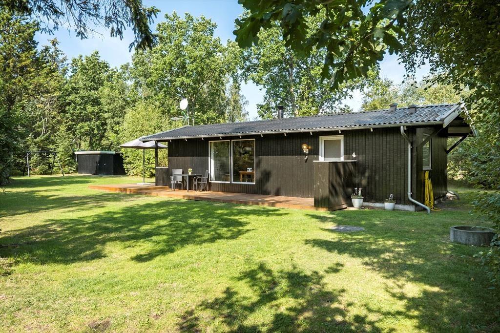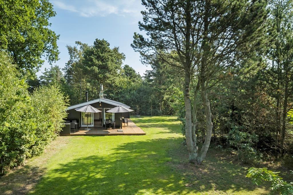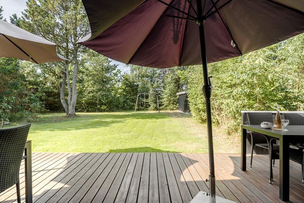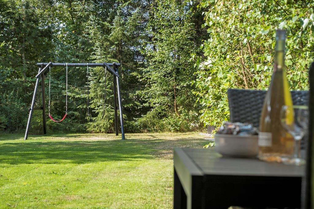 Haven er omkranset af buske og træer. Så det er nemt at finde en hyggelig krog. Hvor man kan nyde solen og følelsen af at have fri. Der er god plads, hvis man får lyst til at spille fodbold eller lege tagfat. Børnene kan også bruge gyngerne og sandkassen som hører til huset. Haven har to fine terrasser, så man kan nyde udelivet. Havens hyggeligste sted er bænken som er placeret under træet, her er det oplagt at nyde den dejlige natur som omkranser sommerhuset.