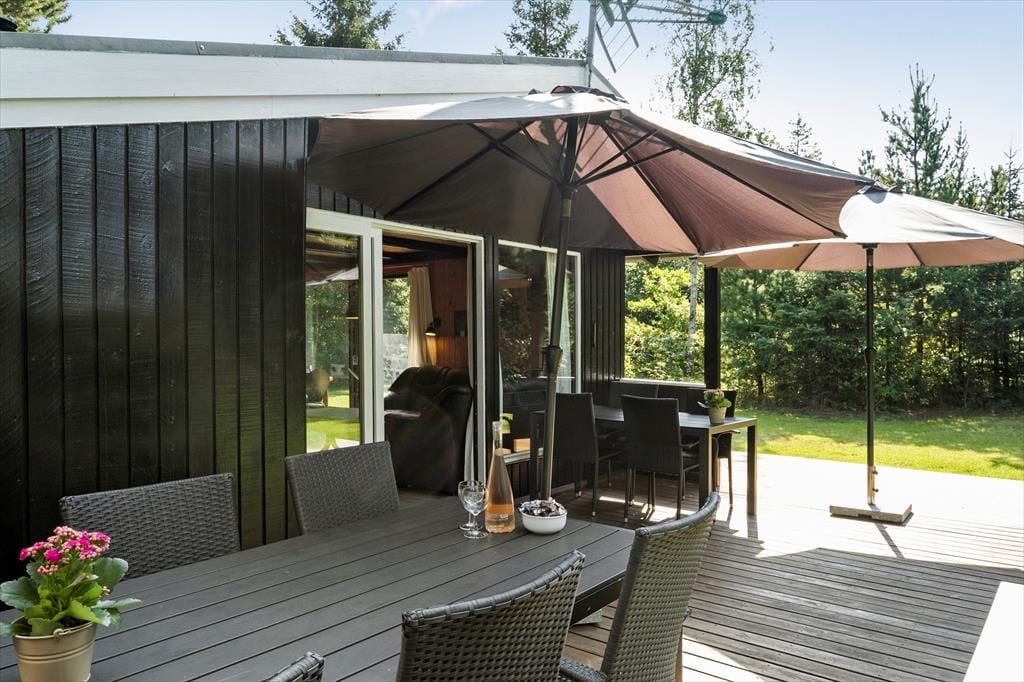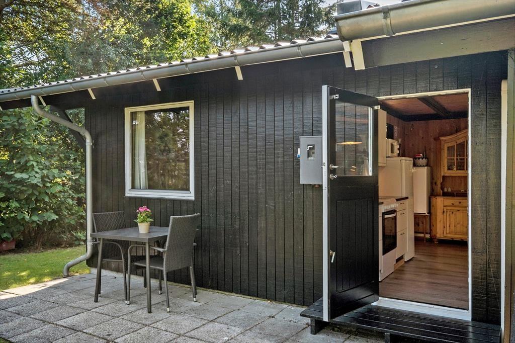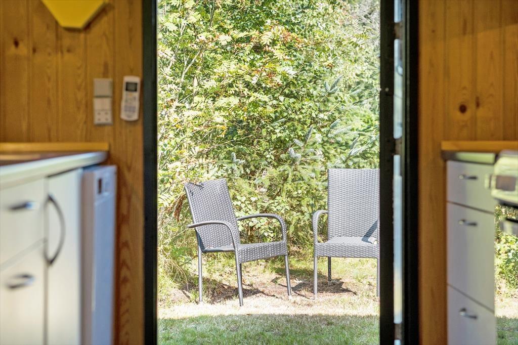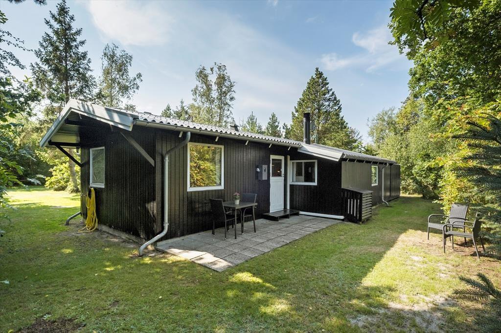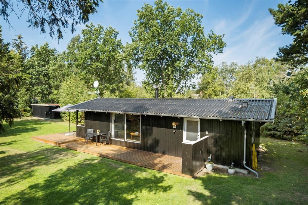 Haven er omkranset af buske og træer. Så det er nemt at finde en hyggelig krog. Hvor man kan nyde solen og følelsen af at have fri. Der er god plads, hvis man får lyst til at spille fodbold eller lege tagfat. Børnene kan også bruge gyngerne og sandkassen som hører til huset. Haven har to fine terrasser, så man kan nyde udelivet. Havens hyggeligste sted er bænken som er placeret under træet, her er det oplagt at nyde den dejlige natur som omkranser sommerhuset.