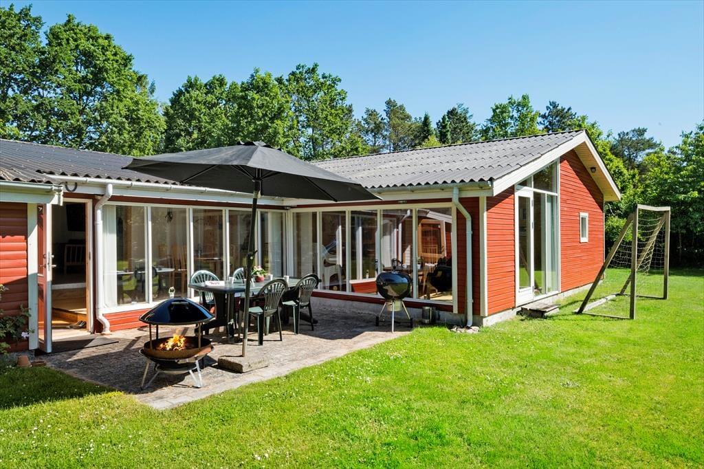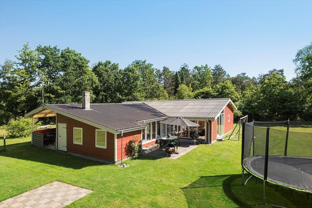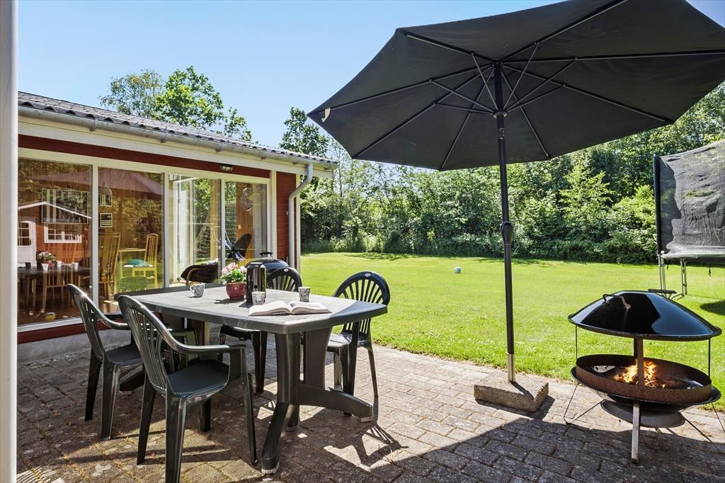 Grunden måler intet mindre end 2477 m2, og takket være den frodige randbeplantning er det en skøn og ugeneret ferieoase. Der er en overdækket terrasse mod vest og en helt åben mod syd, og så er der bålfad, fodboldmål, trampolin og gyngestativ foruden en dejligt stor græsplæne at løbe og lege på.