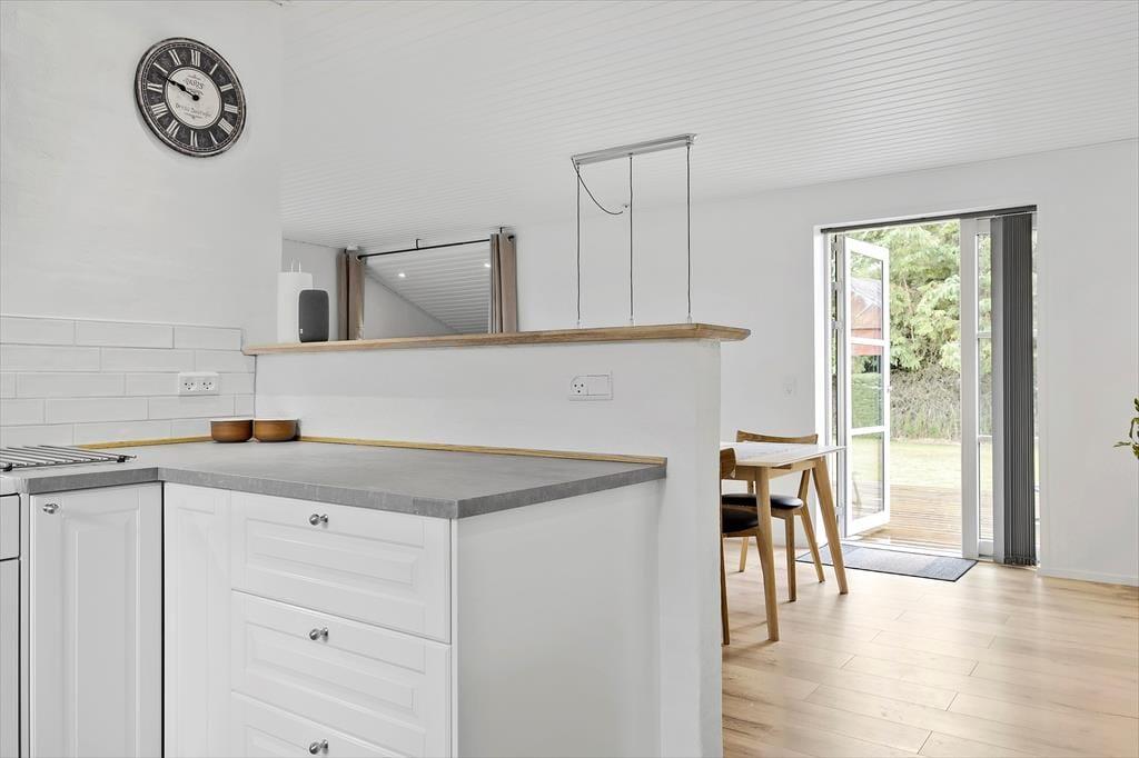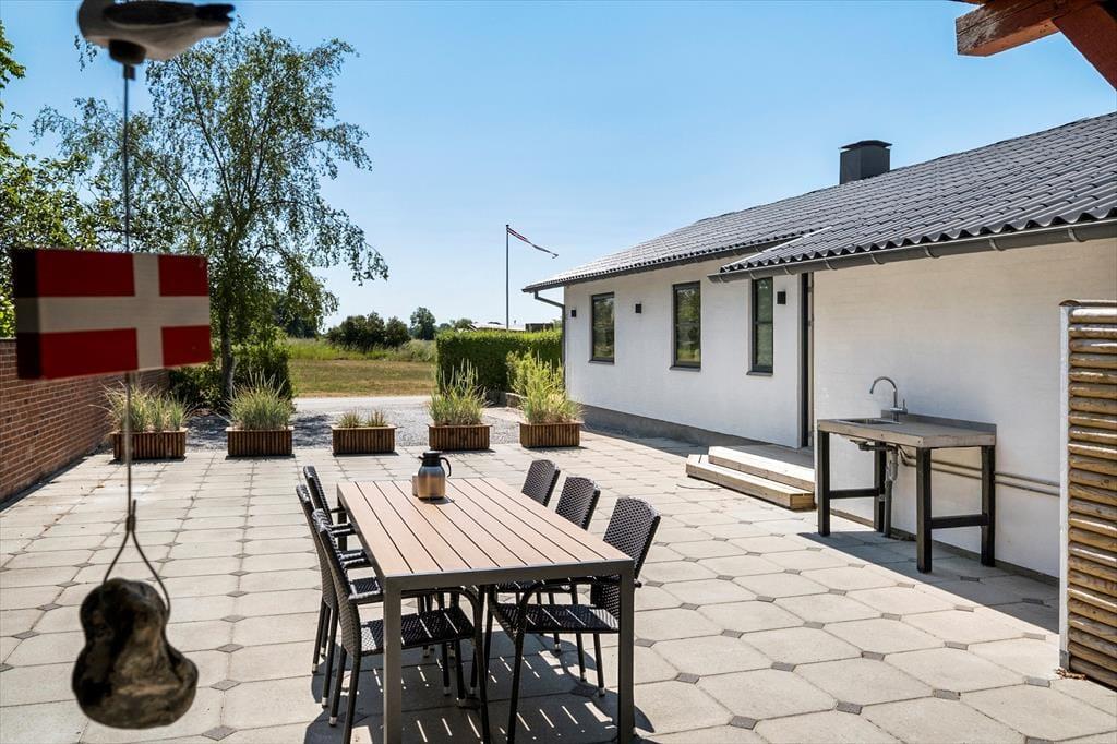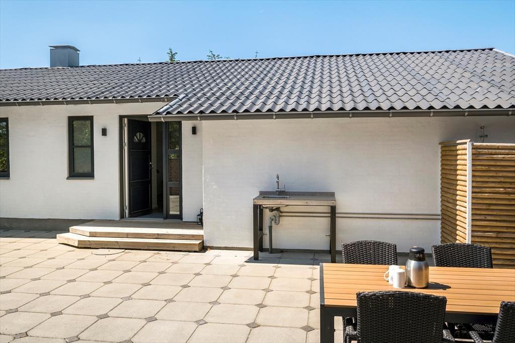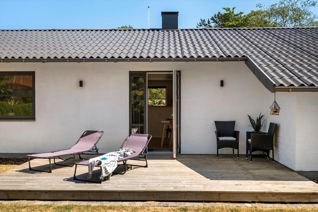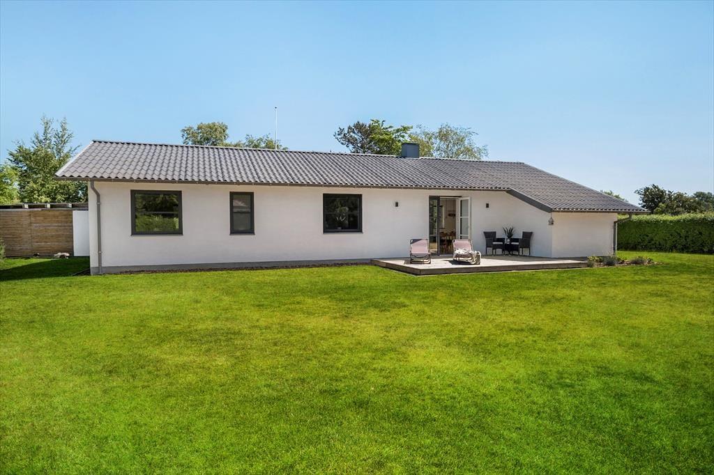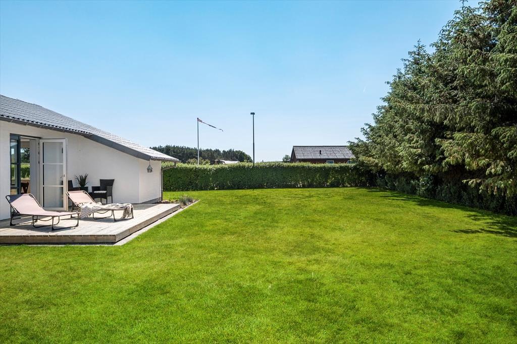 Fra stuen kan I træde lige ud på en vestvendt træterrasse og videre ned på havens gode græsplæne. På den anden side af hækken breder et åbent marklandskab sig, så I har noget kønt at kigge på, mens I slapper af i havestolene eller griller. Øst for sommerhuset kan I også slå jer ned på den store fliseterrasse, og ud mod vejen er der et grusareal til parkering.