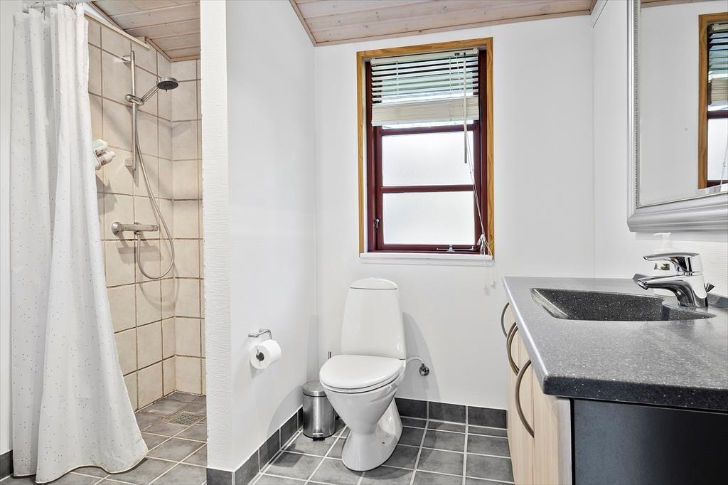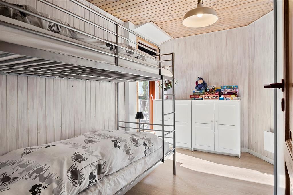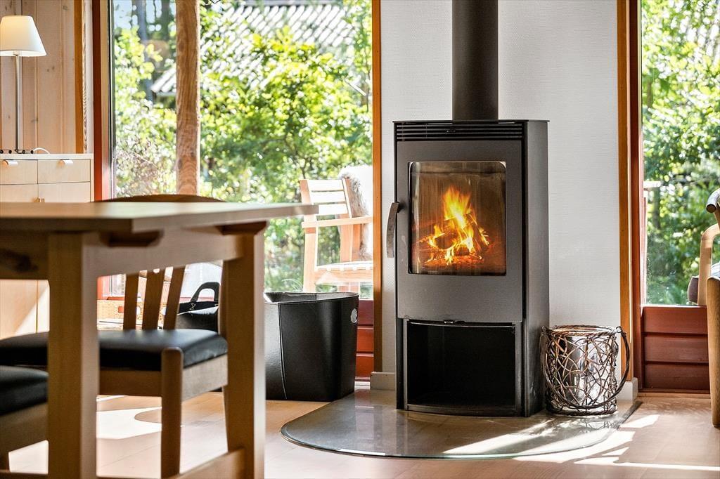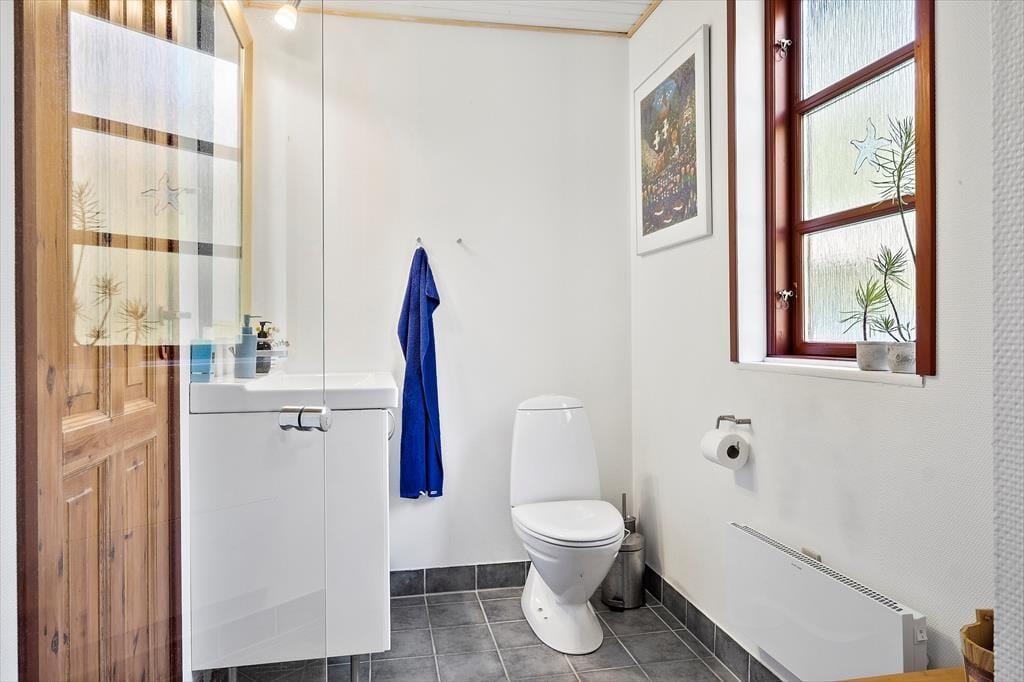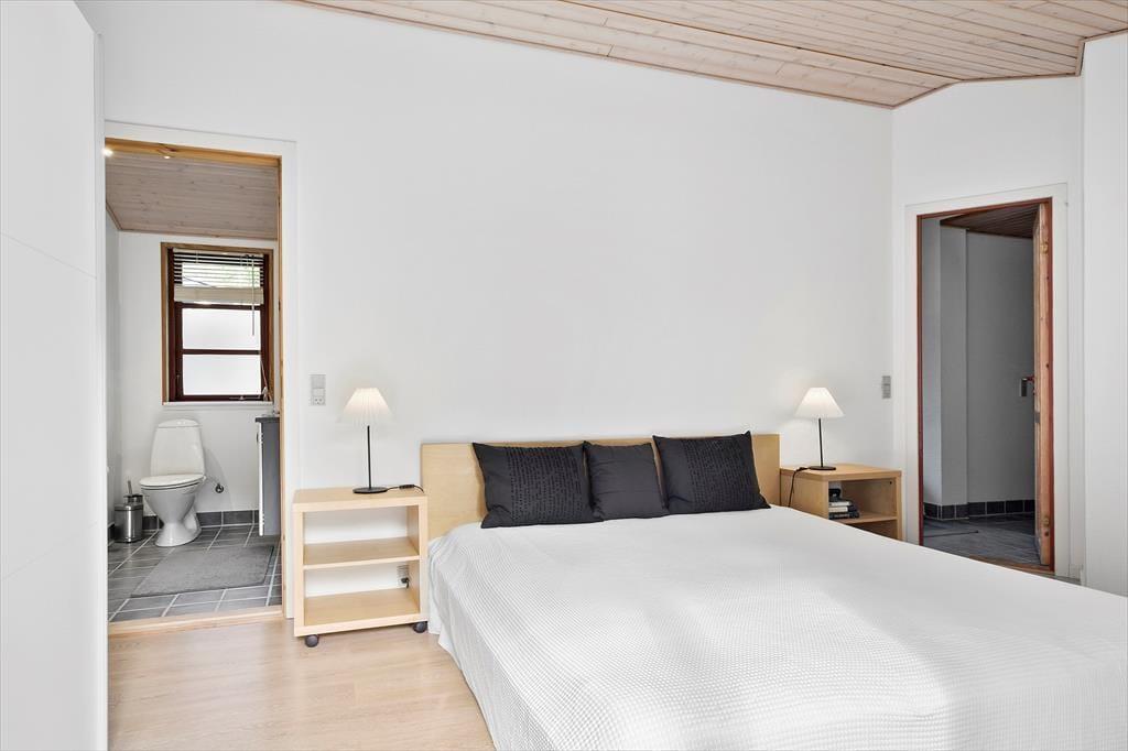 Det 114 m2 store sommerhuset ligger bare 300 meter fra strandengen i Helberskov, og fra stuen kan I se ned for enden af vejen, hvor havet viser sig i åbningen mellem træerne. Stuens høje vinduer sørger samtidig for et godt lysindfald, og både brændeovnen og det pæne møblement bidrager til den rare atmosfære. Et veludstyret køkken er integreret med stuen, mens tre soveværelser, to badeværelser og et bryggers udgør resten af planløsningen. Det ene badeværelse ligger privat i forlængelse af det største soveværelse, mens det andet er praktisk placeret ved entréen.