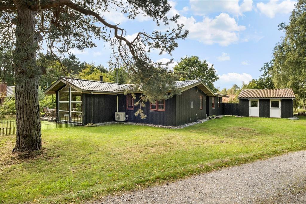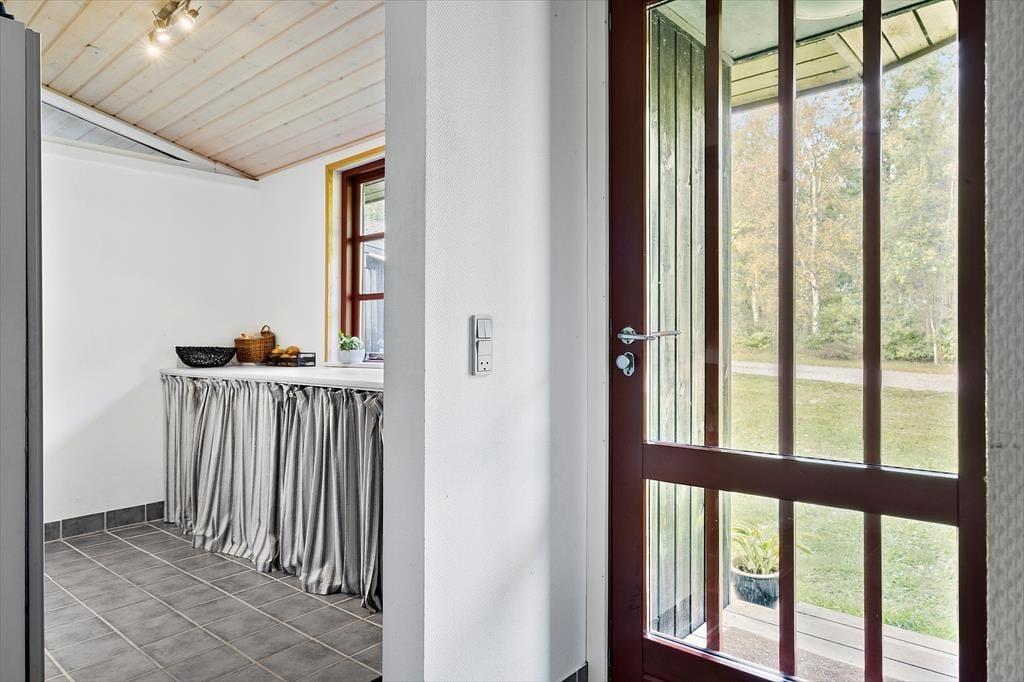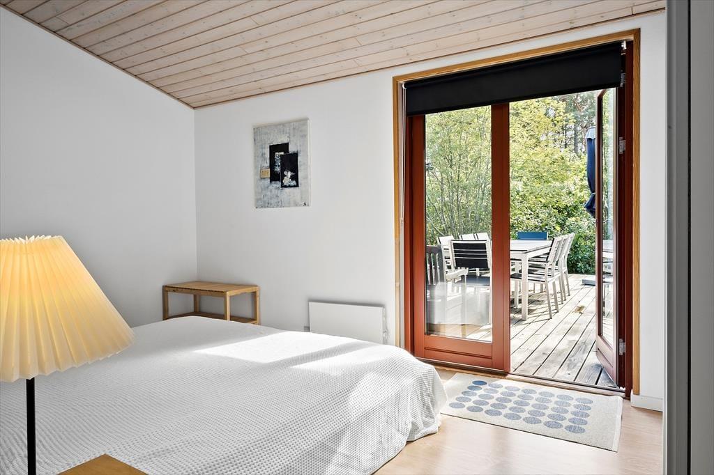 Fra stuen og to af soveværelserne har I direkte adgang til det store og skønne terrassemiljø, der breder sig syd for sommerhuset. Her får I glæde af solen det meste af dagen, og der er også et overdækket areal, hvor I kan rykke ind, hvis en lille byge skulle passere over Helberskov. Baghaven er for øvrigt aflukket, så hunde kan gå frit, og foran huset er der god plads til at parkere.