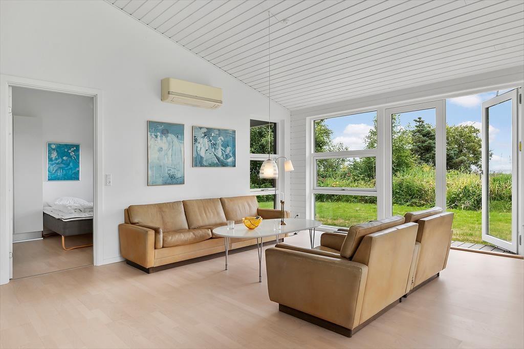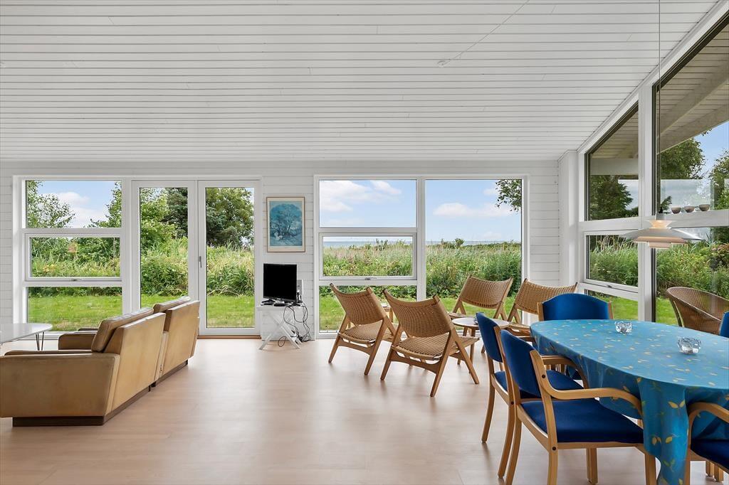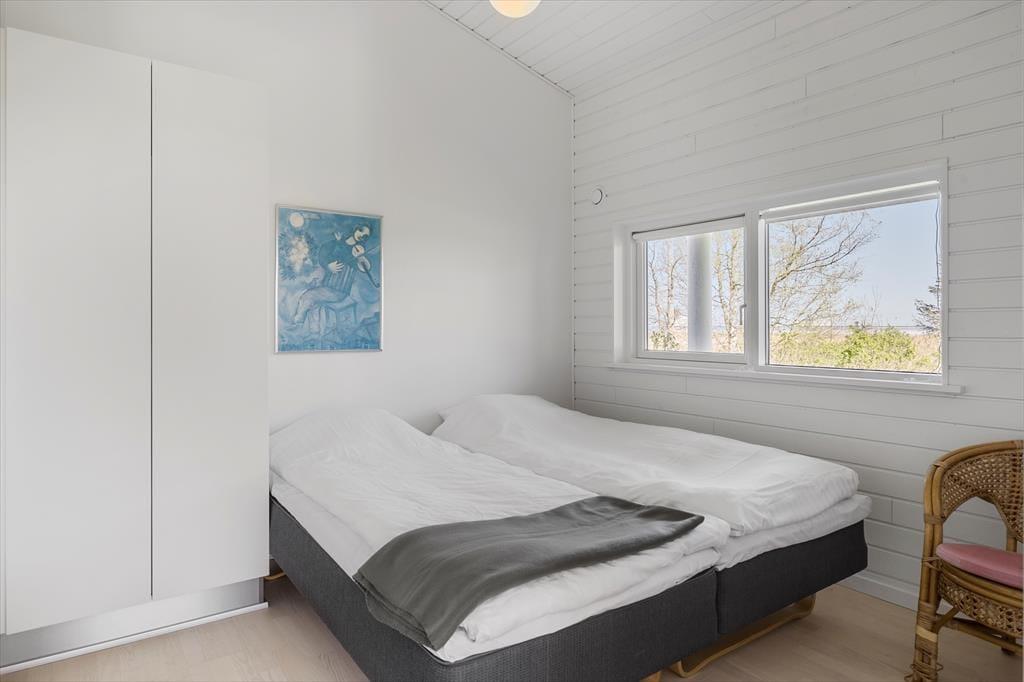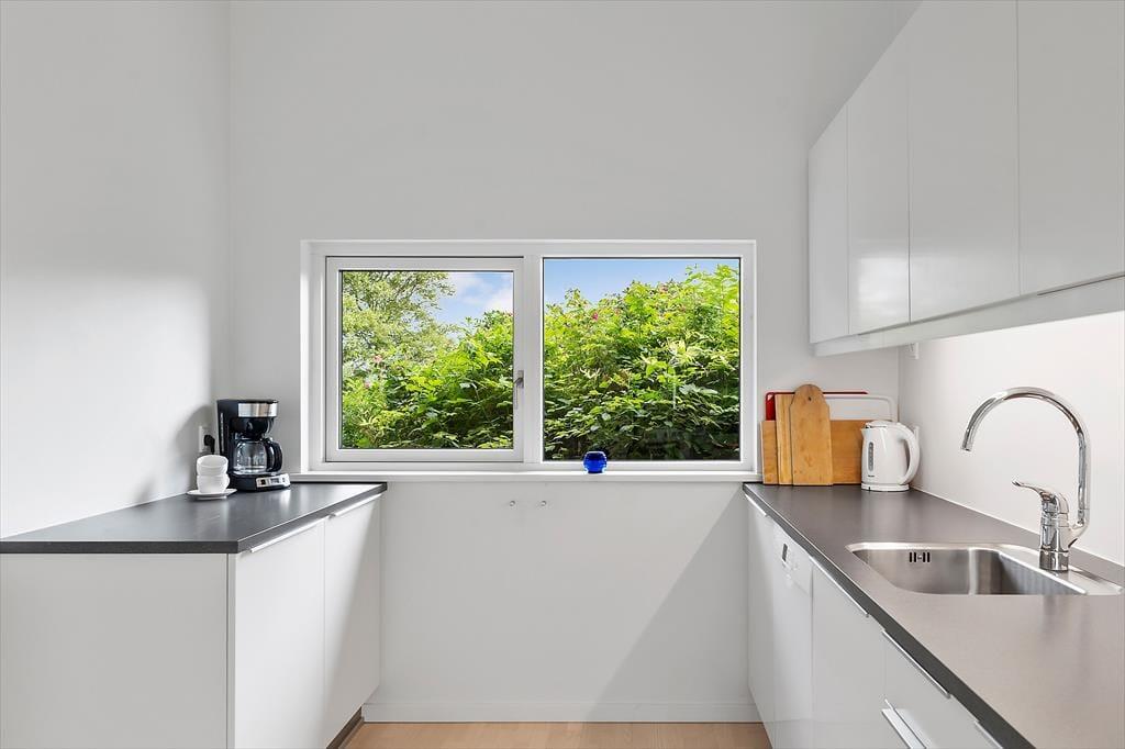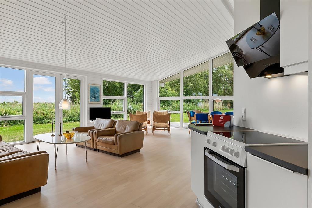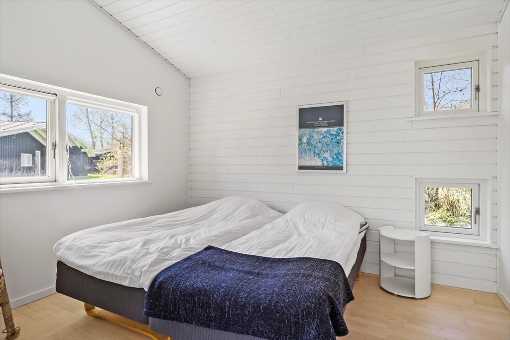 Da sommerhuset blev opført i 2015, blev det selvfølgelig udstyret med store glaspartier i stuen, så du kan mærke nærheden til naturen og få glæde af det smukke sollys – selv på de dage, hvor du har mest lyst til at hygge inden døre. Hvis du kan løsrive blikket fra Kattegat, er der fladskærms-tv i stuen, og en brændeovn står klar til at sprede både varme og hygge, når vejret indbyder til det. Et veludstyret køkken ligger i åben forbindelse med stuen, og ikke bare her, men også på badeværelset og de to soveværelser er indretningen lys og let, så rummene emmer af sommerlig feriestemning.