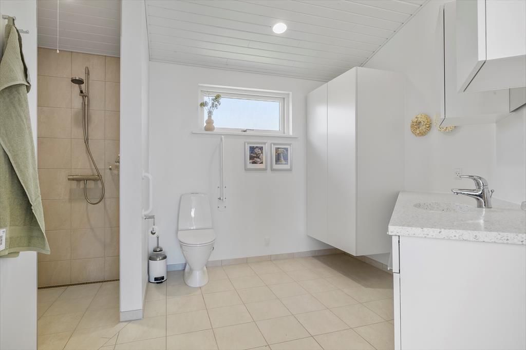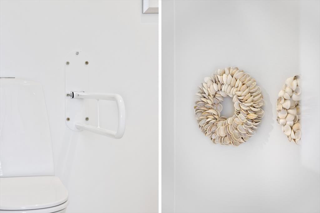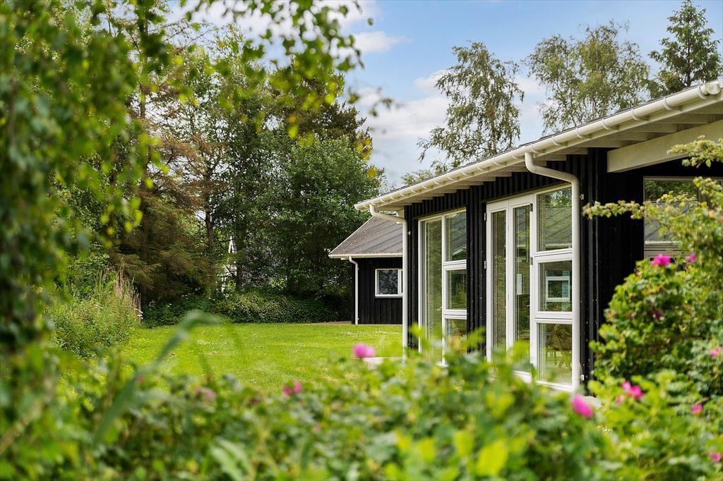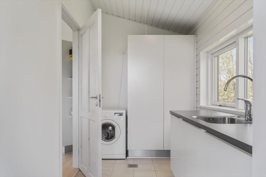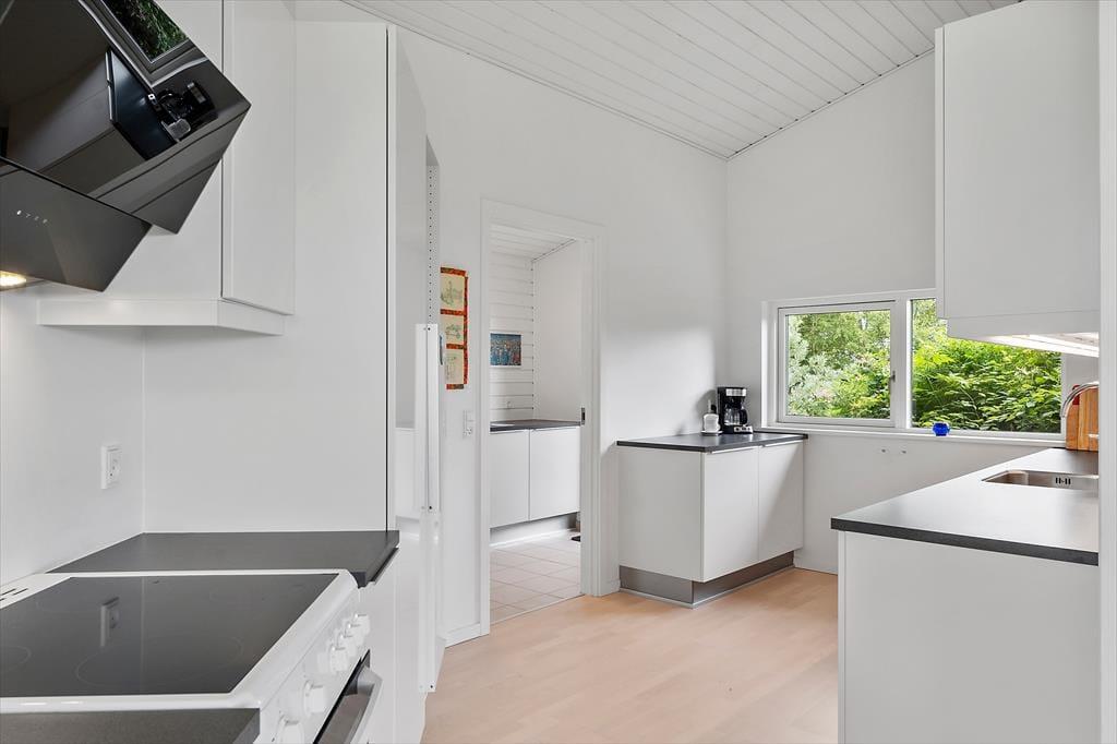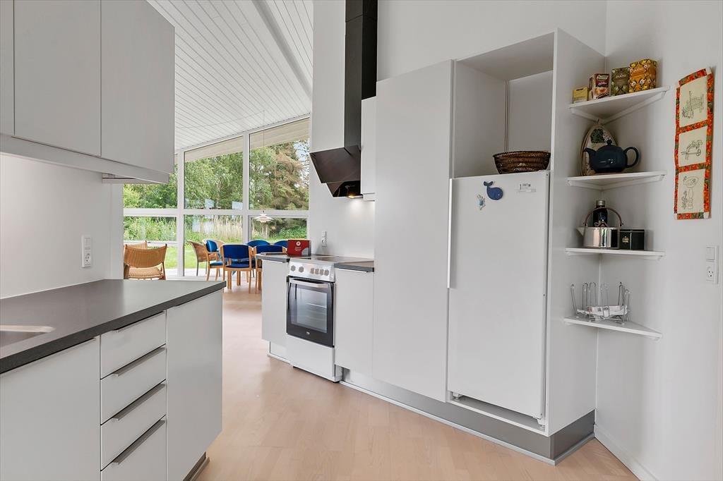 Da sommerhuset blev opført i 2015, blev det selvfølgelig udstyret med store glaspartier i stuen, så du kan mærke nærheden til naturen og få glæde af det smukke sollys – selv på de dage, hvor du har mest lyst til at hygge inden døre. Hvis du kan løsrive blikket fra Kattegat, er der fladskærms-tv i stuen, og en brændeovn står klar til at sprede både varme og hygge, når vejret indbyder til det. Et veludstyret køkken ligger i åben forbindelse med stuen, og ikke bare her, men også på badeværelset og de to soveværelser er indretningen lys og let, så rummene emmer af sommerlig feriestemning.