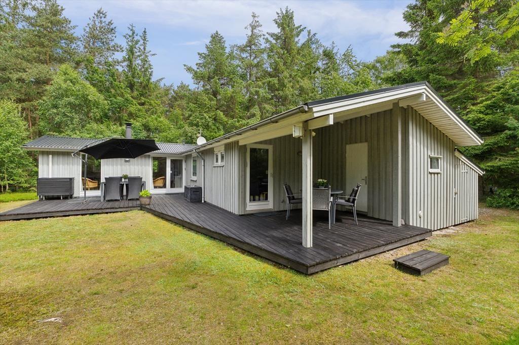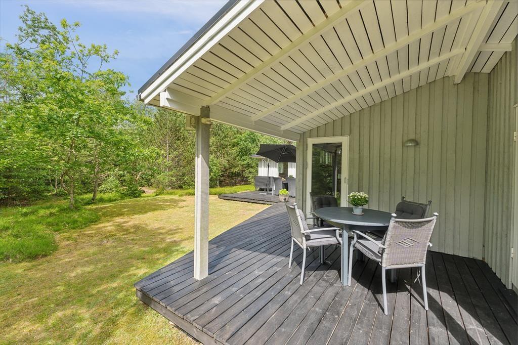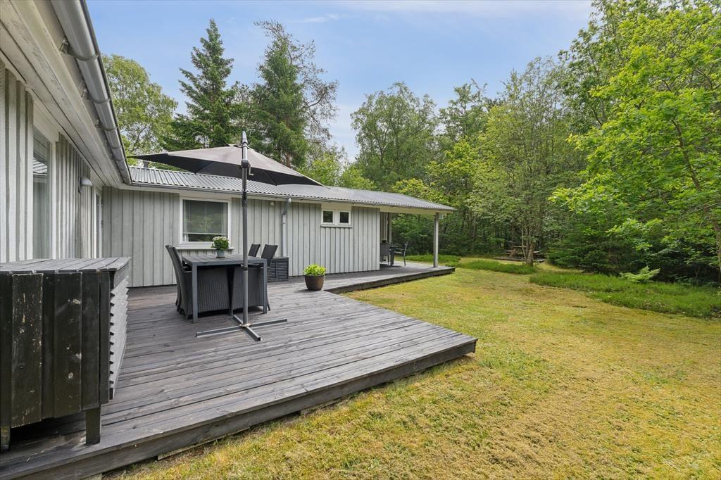 Udenfor venter en stor terrasse, hvor du kan nyde både sol og skygge alt efter tid på dagen. Terrassen er perfekt til både hyggelige måltider, afslapning i solen og måske en god middag, hvor du griller på den medfølgende grill. Den store naturgrund giver både plads til at udforske området og til leg for både børn og voksne, og den frodige beplantning omkring huset sikrer, at du er omgivet af naturens ro. Efter en dejlig dag ude kan du sidde på terrassen og nyde aftensolen, mens dagen langsomt går på hæld.