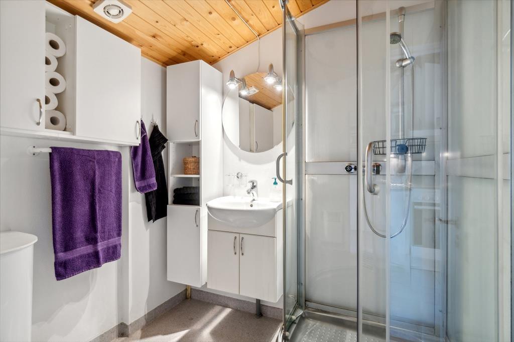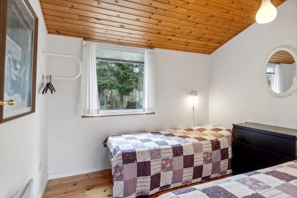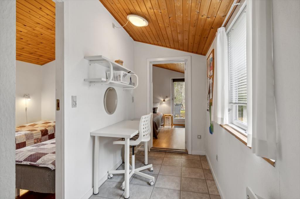 Sommerhuset byder på en lys og indbydende atmosfære, hvor den åbne planløsning skaber et rummeligt opholdsmiljø. Indretningen er både funktionel og hyggelig, og med store vinduer er der masser af naturligt lys, der fylder rummene med varme og liv. Stuen og køkkenet smelter sammen til et dejligt samlingspunkt, hvor du kan nyde fællesskabet – hvad enten du er i gang med at tilberede en lækker middag eller bare slapper af med en god bog ved brændeovnen. Her er der plads til både afslapning og samvær, og den lyse indretning gør det let at føle sig hjemme.