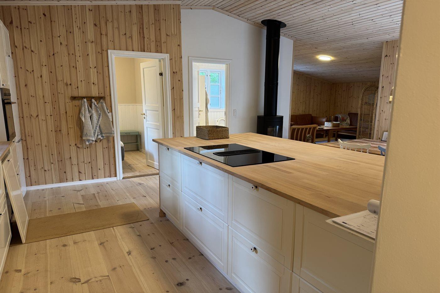 Køkkenet er udstyret med 1 køleskab. Der er 4 induktionskogeplader, varmluftovn, mikrobølgeovn samt opvaskemaskine.