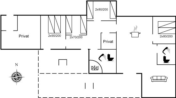 Der er 2 badeværelser med bruseniche og 2 toiletter. Der er gulvvarme på 2 badeværelser.