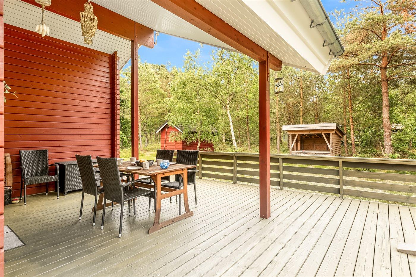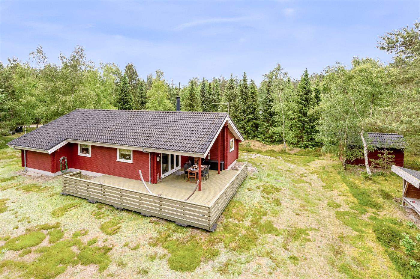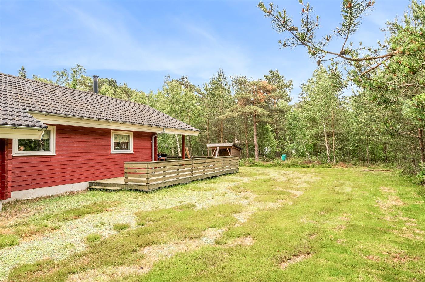 Ferieboligen er beliggende på en 2512 m² stor naturgrund. Der er 200 m til havet. Nærmeste forretning er beliggende i en afstand af 3100 m. Der er en golfbane i en afstand af 13250 m. Til ferieboligen hører 40 m² terrasseareal. Desuden er der 15 m² overdækket terrasse. Shelter. Grill til rådighed. Parkering ved ferieboligen.
