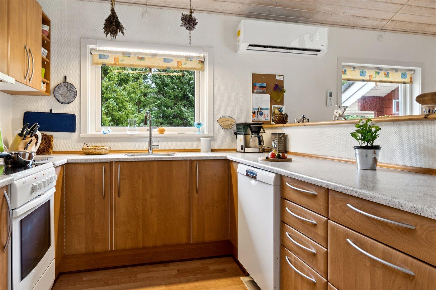 Køkkenet er udstyret med 1 køleskab. Der er 4 keramiske kogeplader, varmluftovn samt opvaskemaskine.