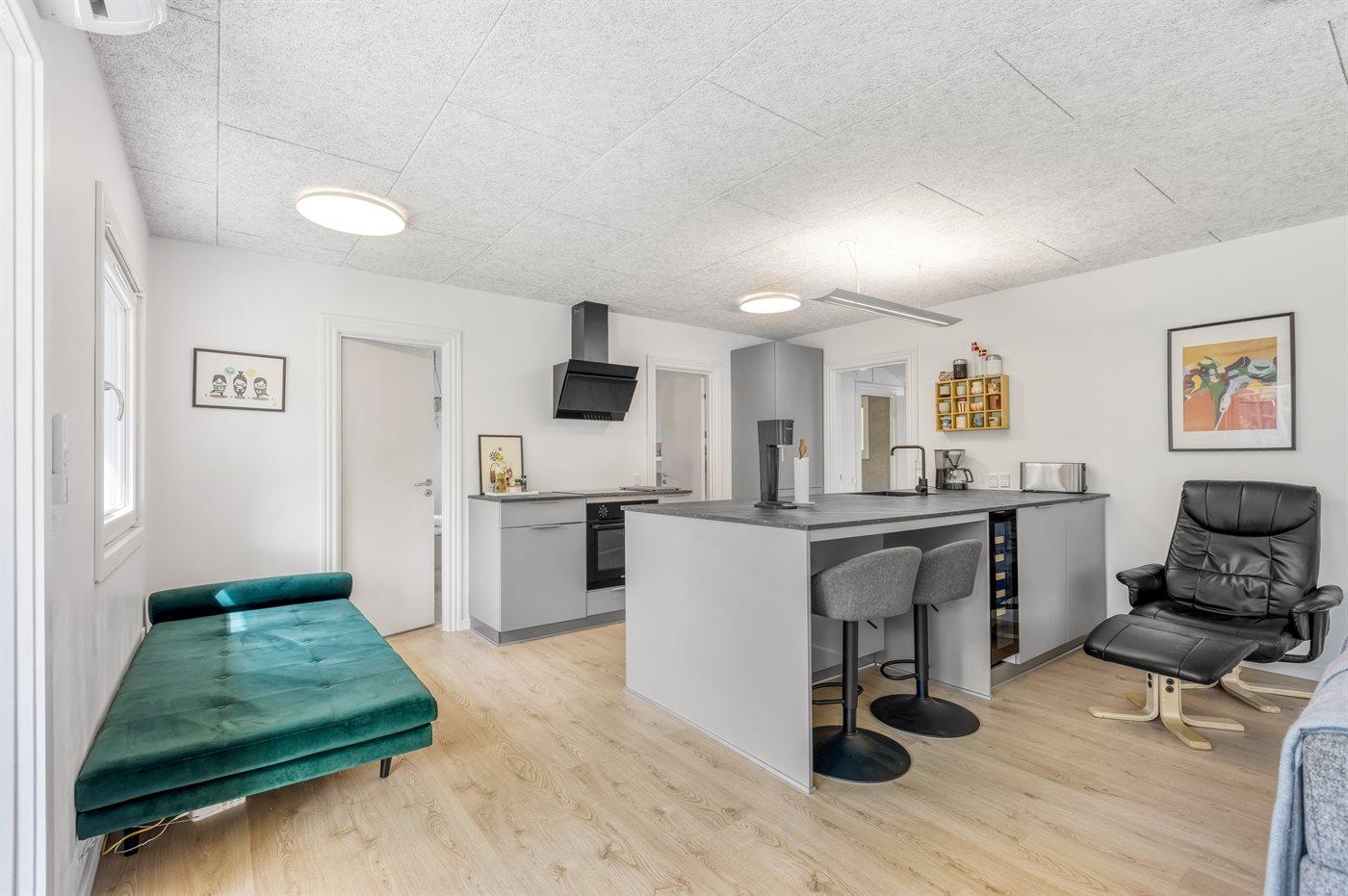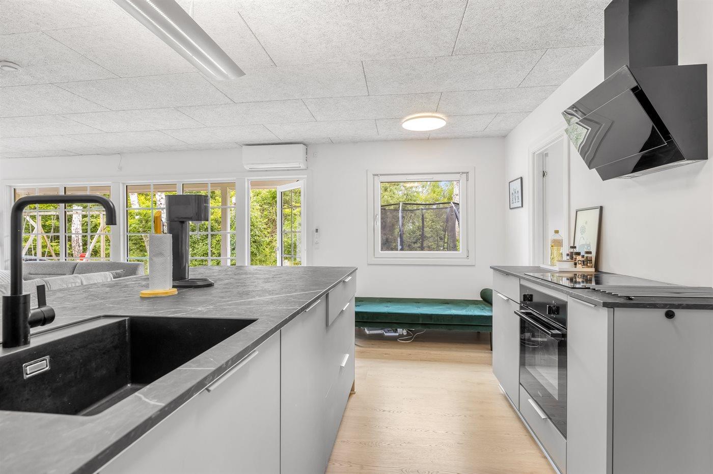 Køkkenet er udstyret med 1 køleskab. Der er 4 keramiske kogeplader, varmluftovn, mikrobølgeovn samt opvaskemaskine.