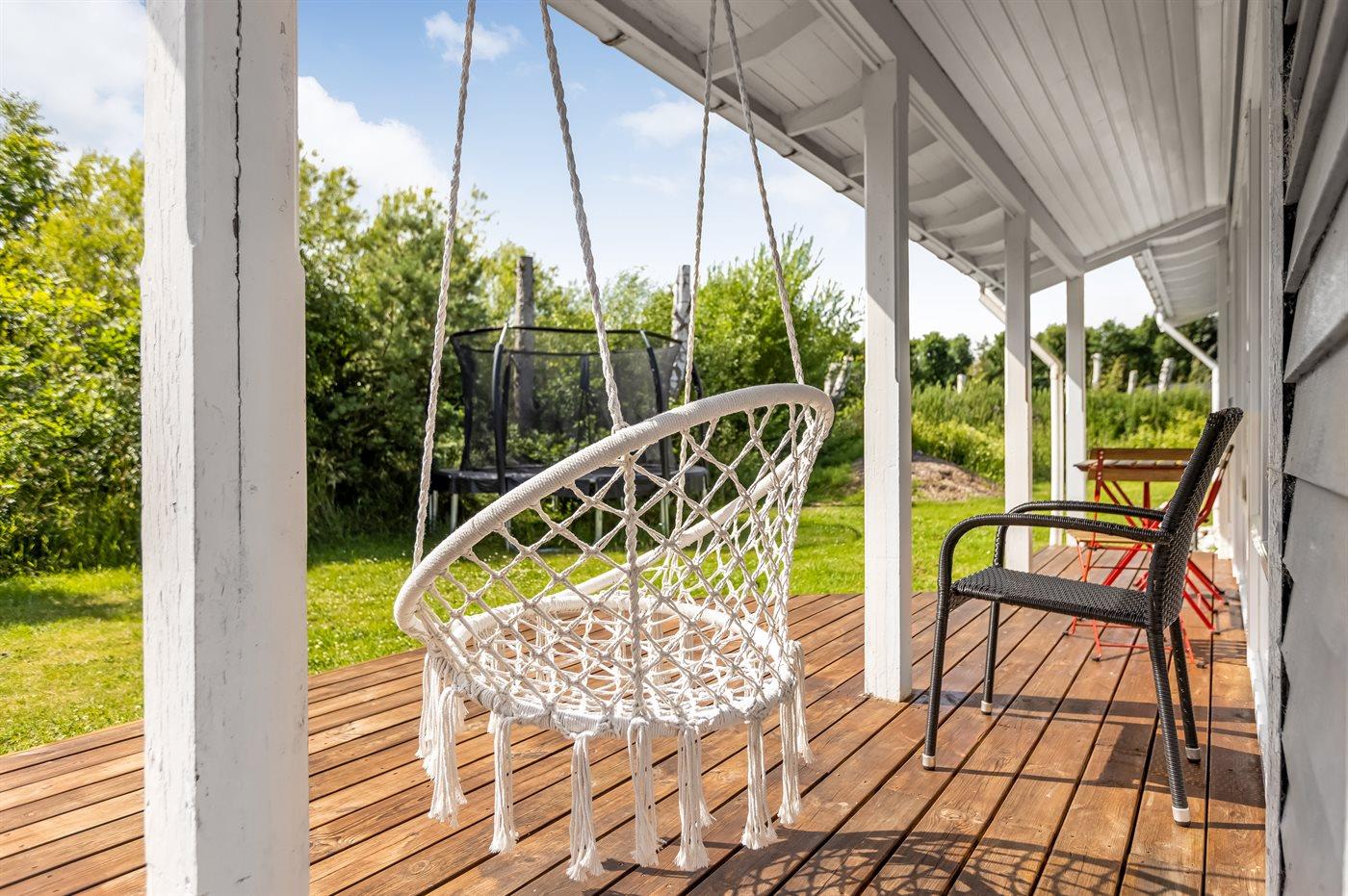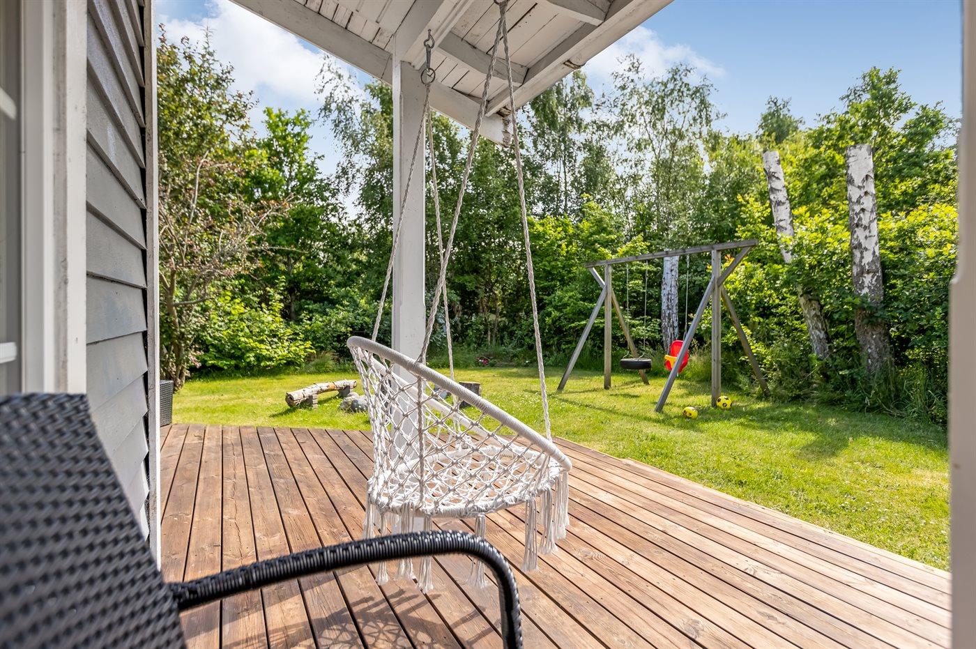 Ugenert have med gynge, trampolin, bålplads og god plads til spil og leg.