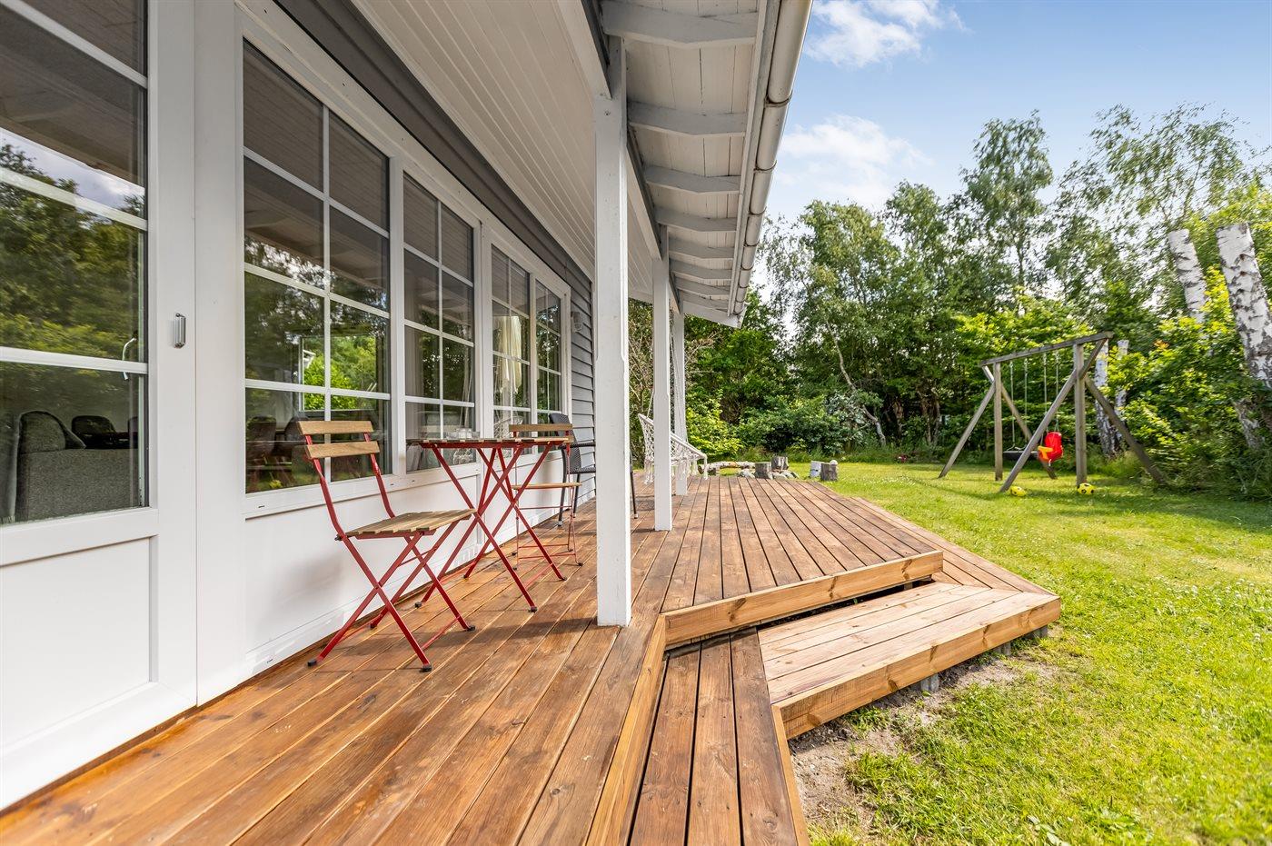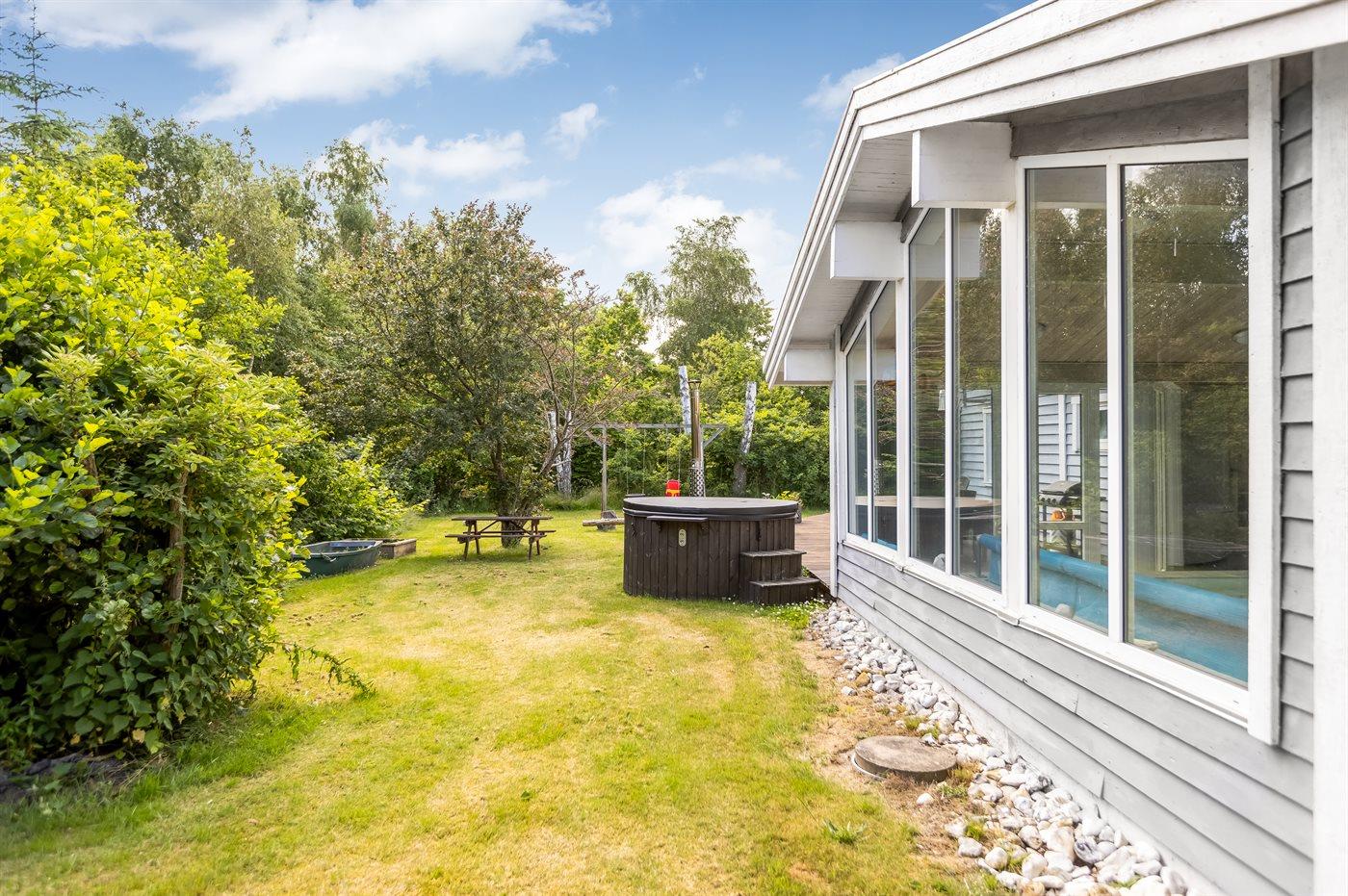 Ferieboligen er beliggende på en 1204 m² stor naturgrund. Der er 950 m til havet. Der er 2700 m til fjorden. Nærmeste forretning er beliggende i en afstand af 2800 m. Der er en golfbane i en afstand af 12700 m. Til ferieboligen hører åbent terrasseareal. Desuden er der overdækket terrasse. Gynge. Sandkasse. Trampolin. Bålsted. Grill til rådighed. Der er installeret stik til opladning af elbil. Type 2 stik. Med 11 kW ladeeffekt. Parkering ved ferieboligen.
