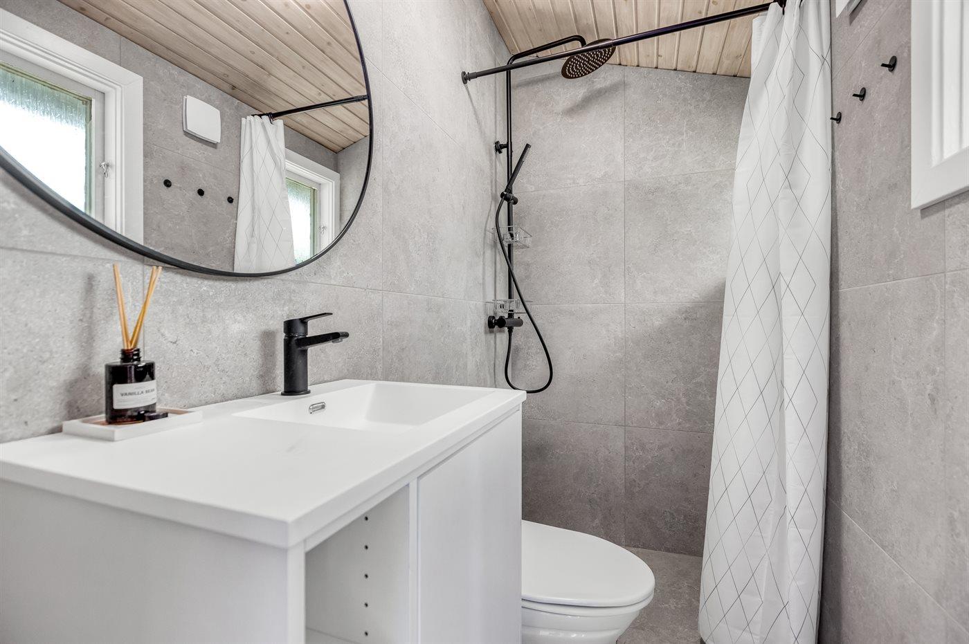 Der er 2 badeværelser med bruseniche og 2 toiletter. Der er gulvvarme på 1 badeværelse. I saunaen er der mulighed for afslapning.