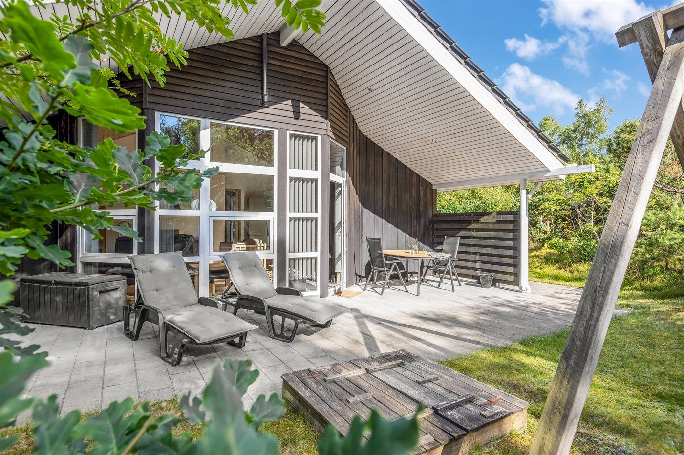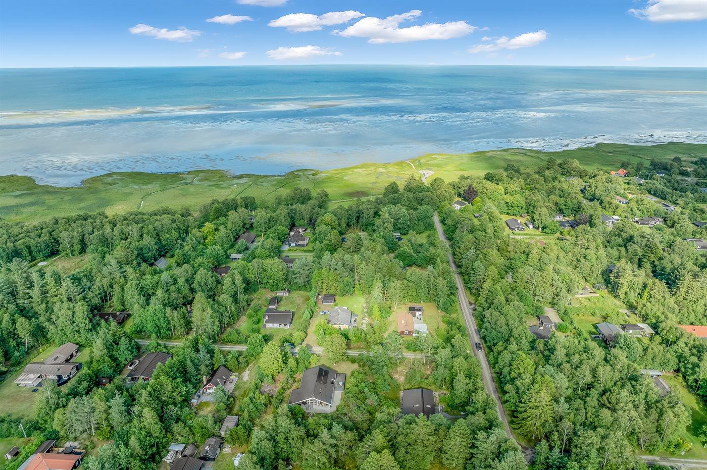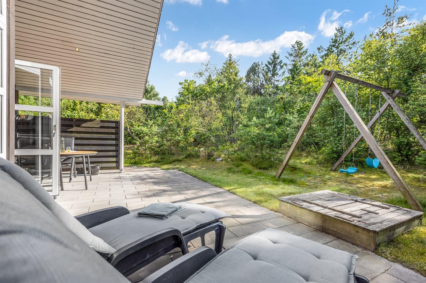 Ferieboligen er beliggende på en 1218 m² stor havegrund. Der er 350 m til havet. Nærmeste forretning er beliggende i en afstand af 2200 m. Der er en golfbane i en afstand af 13800 m. Til ferieboligen hører åbent terrasseareal. Desuden er der overdækket terrasse. Gynge. Sandkasse. Grill til rådighed. Der er installeret stik til opladning af elbil. Type 2 stik. Med 11 kW ladeeffekt. Parkering ved ferieboligen.