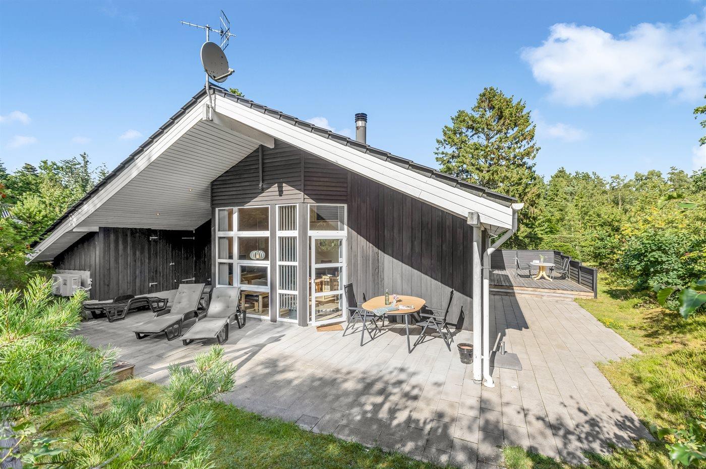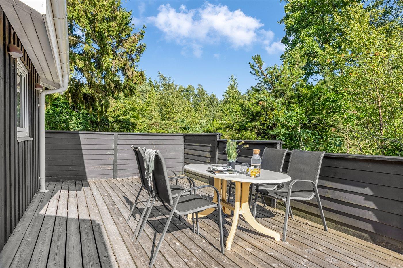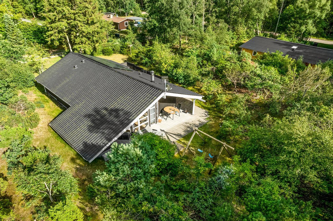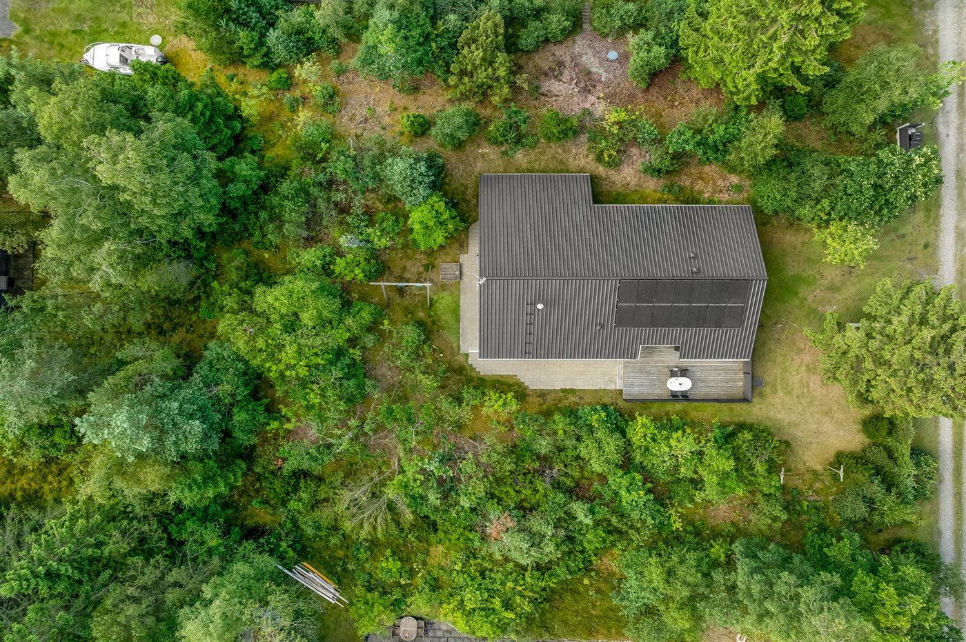 Det niveauopdelte hus ligger på en vidunderlig naturgrund midt i skoven omgivet af høje, gamle træer, hvor der dog trænger masser af sol igennem. På sommerhusets terrasser er der lagt op til timevis af solbadning, hygge, spil og naturligvis kulinariske grilleventyr.