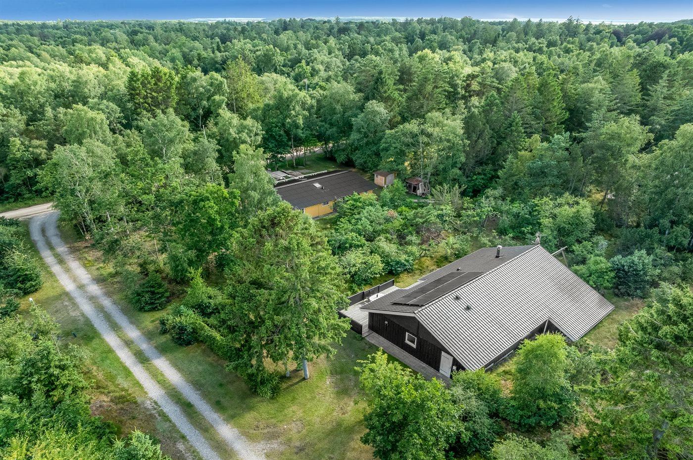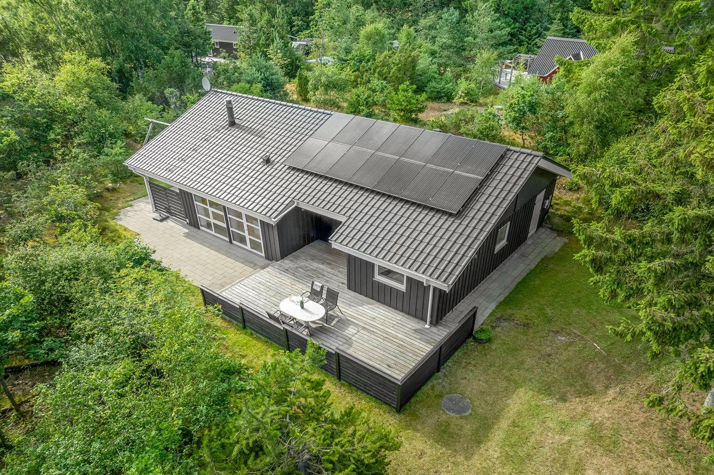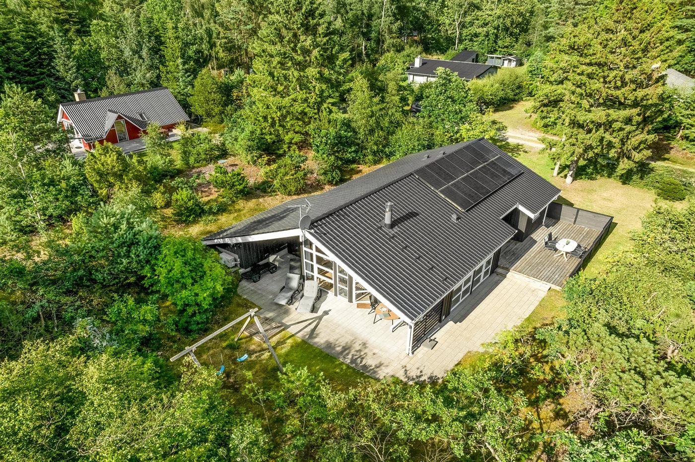 Det niveauopdelte hus ligger på en vidunderlig naturgrund midt i skoven omgivet af høje, gamle træer, hvor der dog trænger masser af sol igennem. På sommerhusets terrasser er der lagt op til timevis af solbadning, hygge, spil og naturligvis kulinariske grilleventyr.