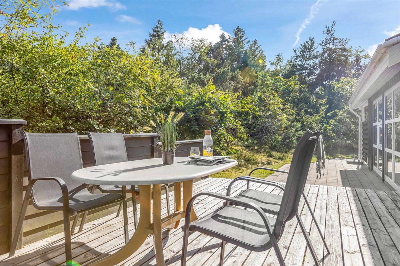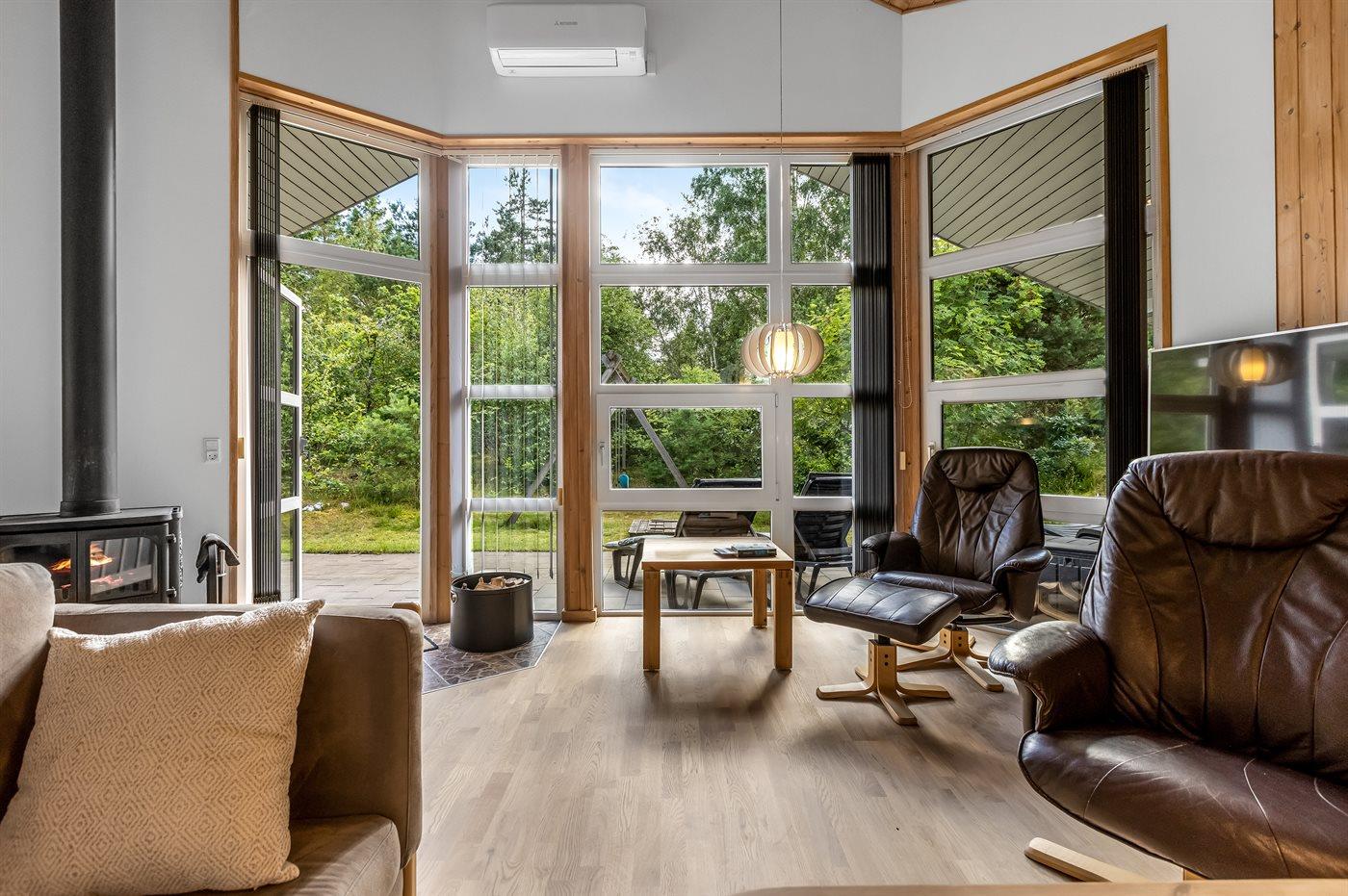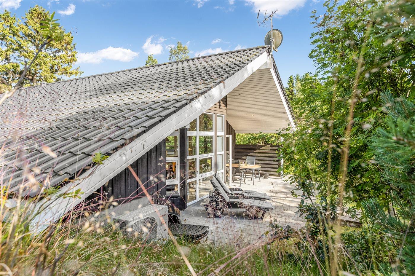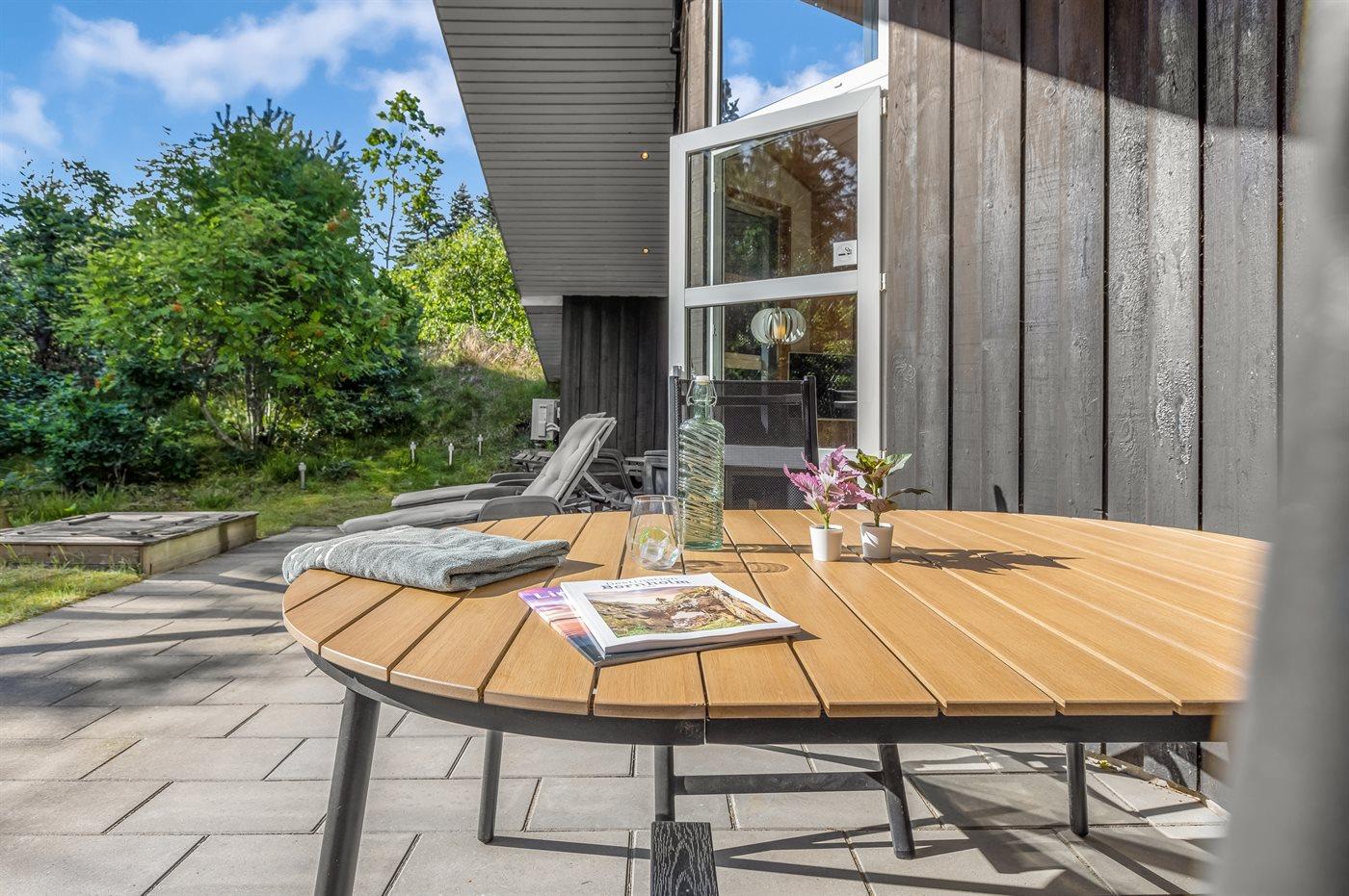 Det niveauopdelte hus ligger på en vidunderlig naturgrund midt i skoven omgivet af høje, gamle træer, hvor der dog trænger masser af sol igennem. På sommerhusets terrasser er der lagt op til timevis af solbadning, hygge, spil og naturligvis kulinariske grilleventyr.