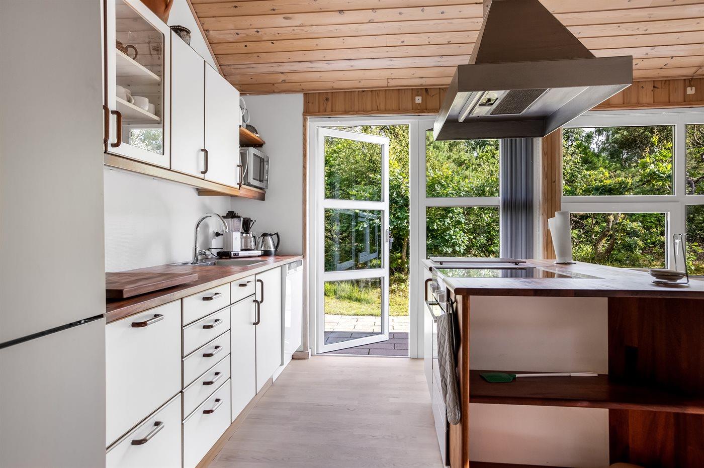 Køkkenet er udstyret med 1 køleskab. Der er 4 keramiske kogeplader, varmluftovn, mikrobølgeovn samt opvaskemaskine.