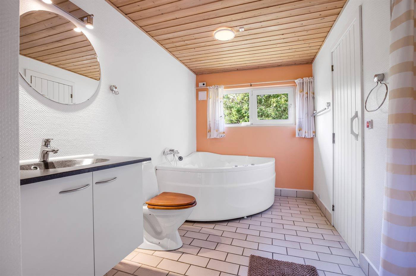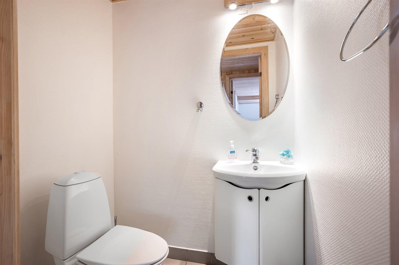 Der er 1 badeværelse med bruseniche og 2 toiletter, heraf 1 gæstetoilet. Der er gulvvarme på 1 badeværelse. I saunaen er der mulighed for afslapning.