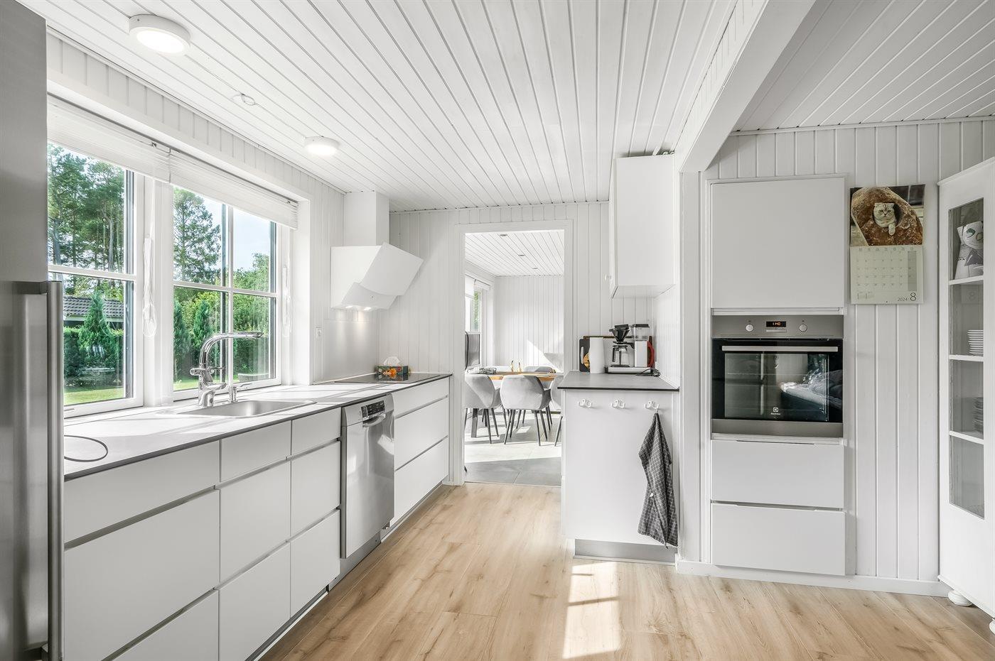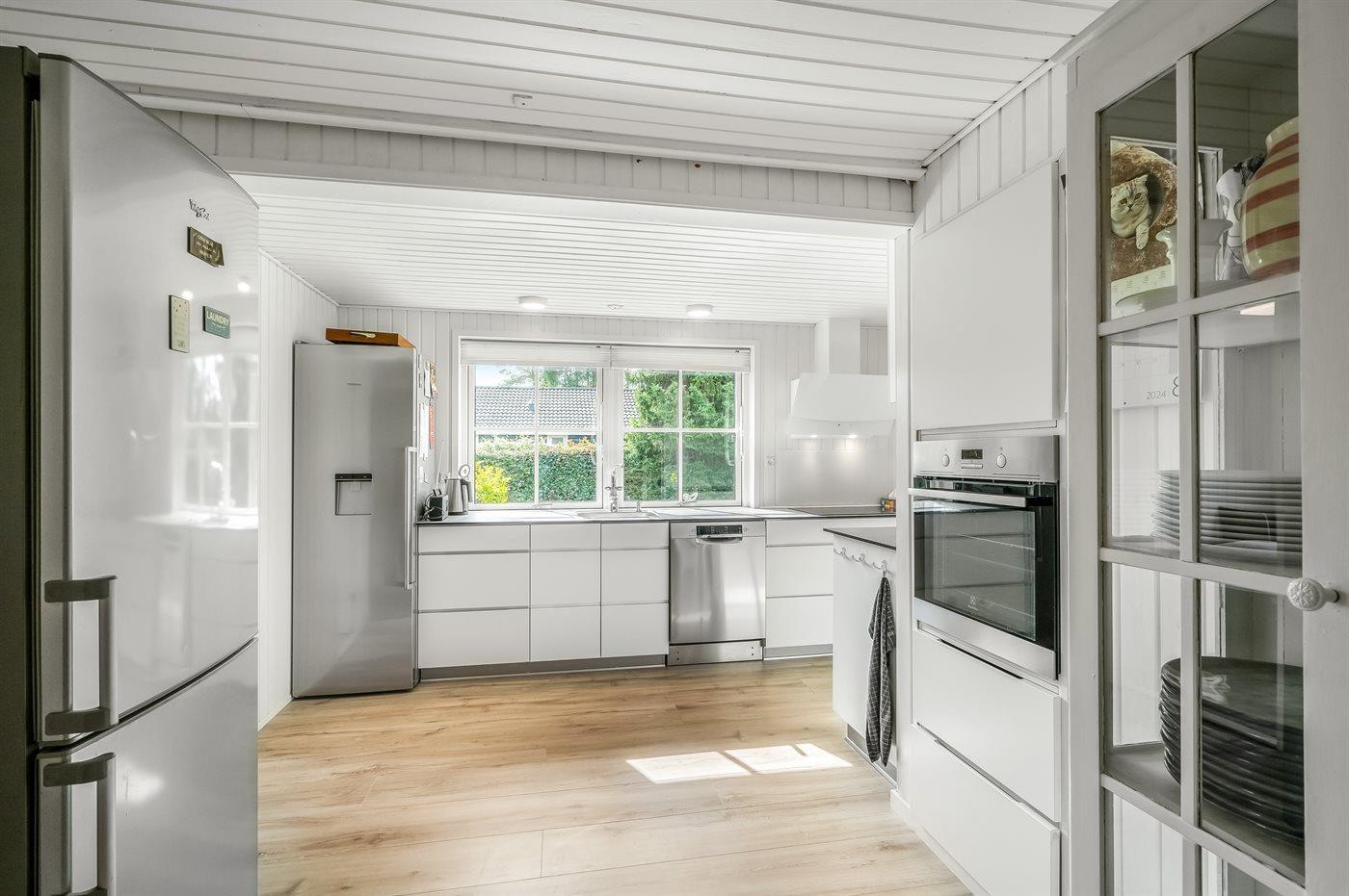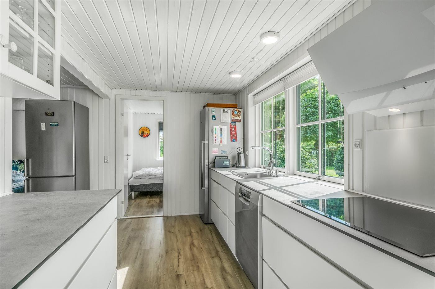 Køkkenet er udstyret med 1 køleskab og 1 køle/-fryseskab. Der er 4 keramiske kogeplader, varmluftovn, mikrobølgeovn samt opvaskemaskine.