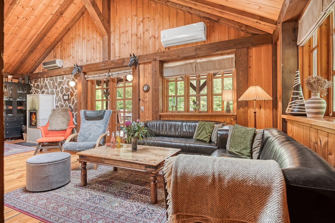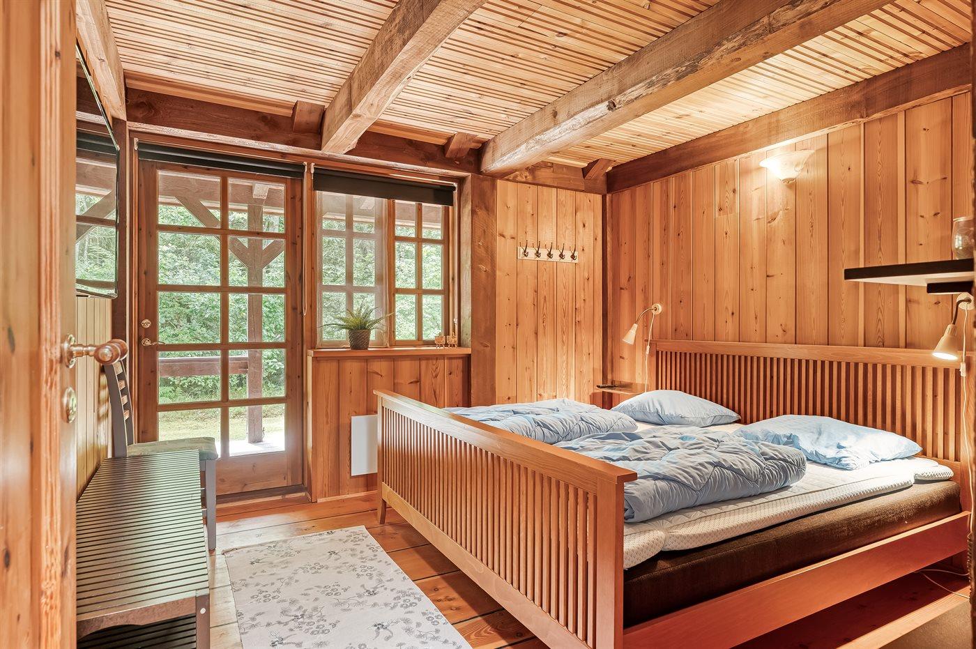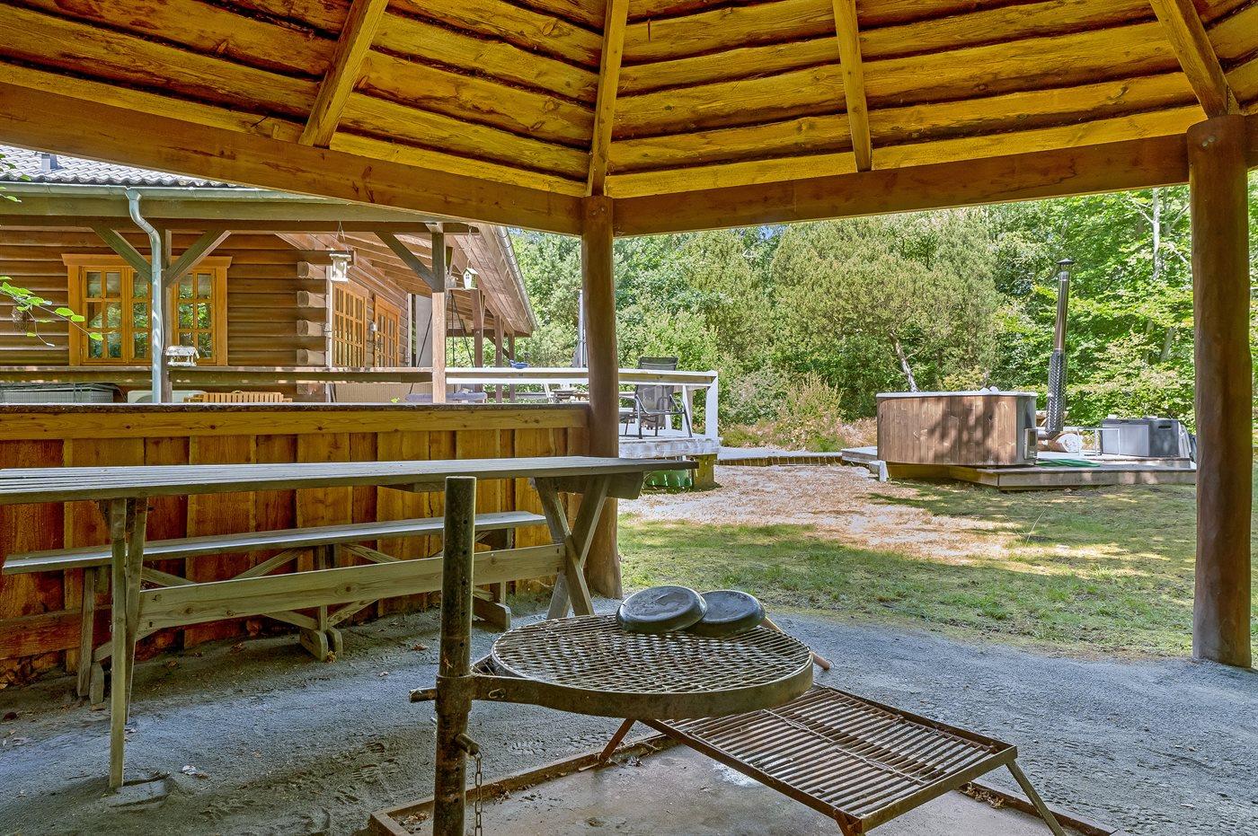 Fantastisk bjælke-sommerhus med spa, vildmarkskar og privat skovgrund nær havet.