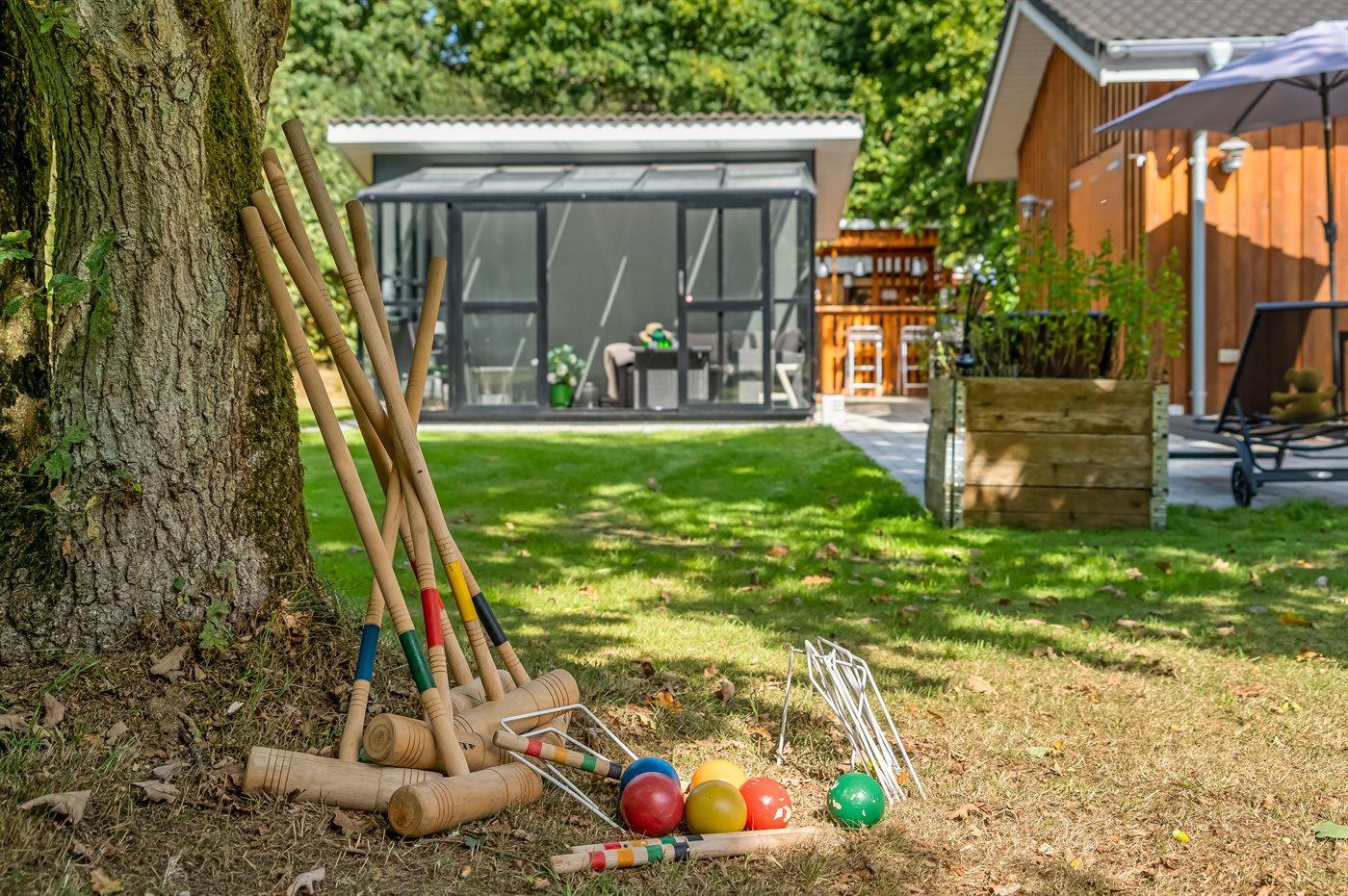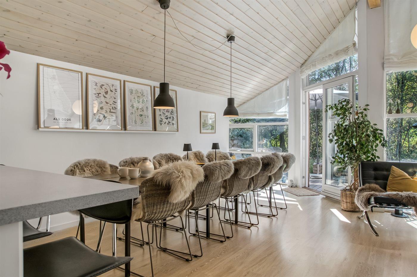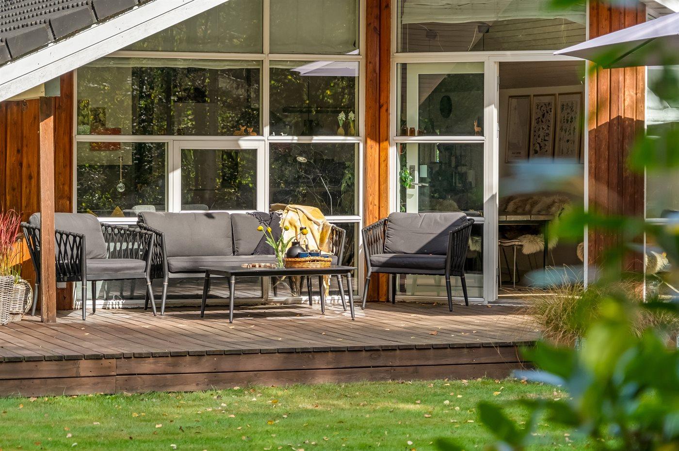Huset ligger på en stor grund med gynge, bålplads og rigeligt med plads til leg og boldspil. De mange terrasser gør det muligt at følge solen hele dagen – og om aftenen kan I samle jer til hyggelige grillaftener i fredelige omgivelser.