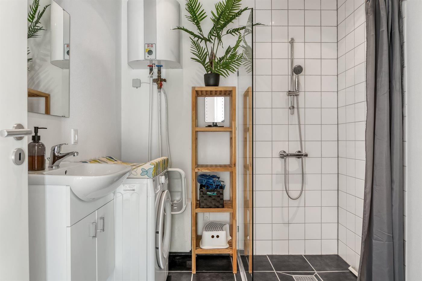 Der er 2 badeværelser med bruseniche og 2 toiletter. Der er gulvvarme på 2 badeværelser. I saunaen er der mulighed for afslapning.