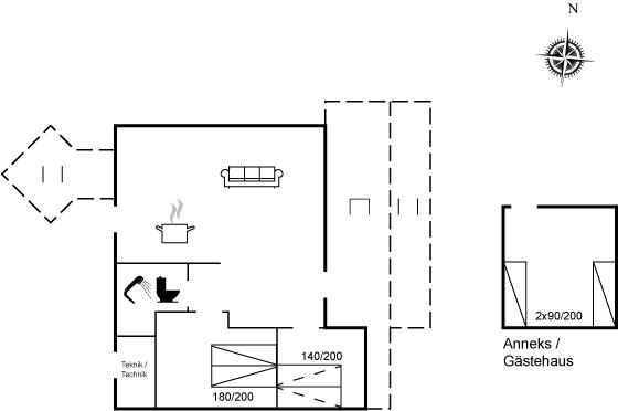 Der er i alt 3 soveværelser. Sovepladserne fordeler sig på: 2 sovepladser i dobbeltseng. 2 sovepladser i enkeltsenge. 2 sovepladser i sovesofa (dobbelt). 2 af disse sovepladser befinder sig i anneks.