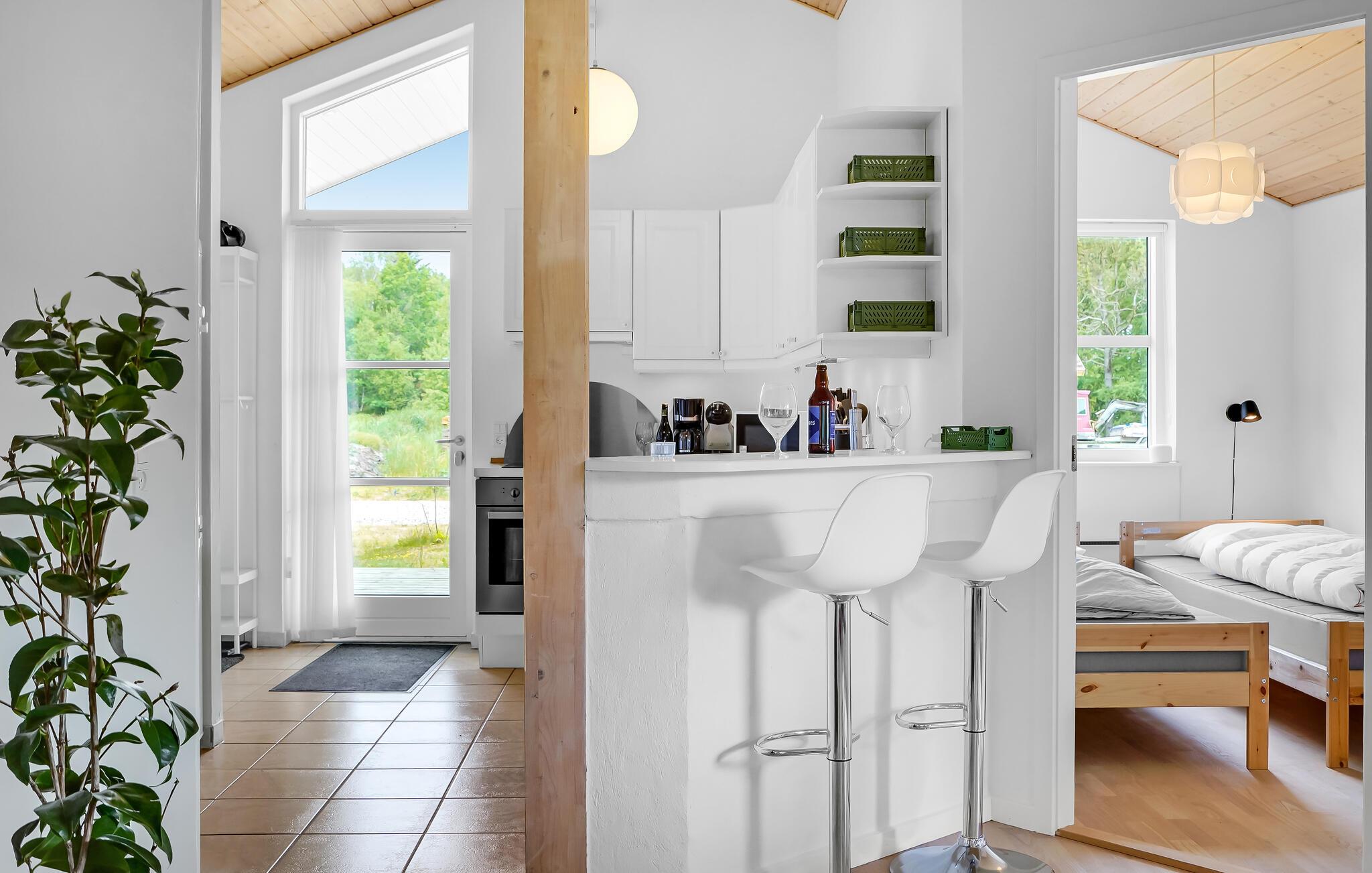 Huset er smagsfuldt indrettet med stilfulde og behagelige møbler, der skaber de bedste betingelser for en skøn og totalt afslappende ferie. Brændeovnen i stuen skaber komfort og hyggestemning på de køligere dage. Der er også en alkove i stuen, hvor I kan slappe af, mens I læser en bog eller bare dagdrømmer.