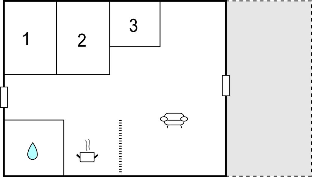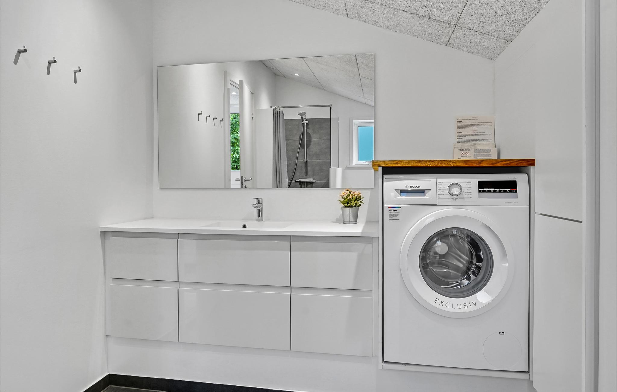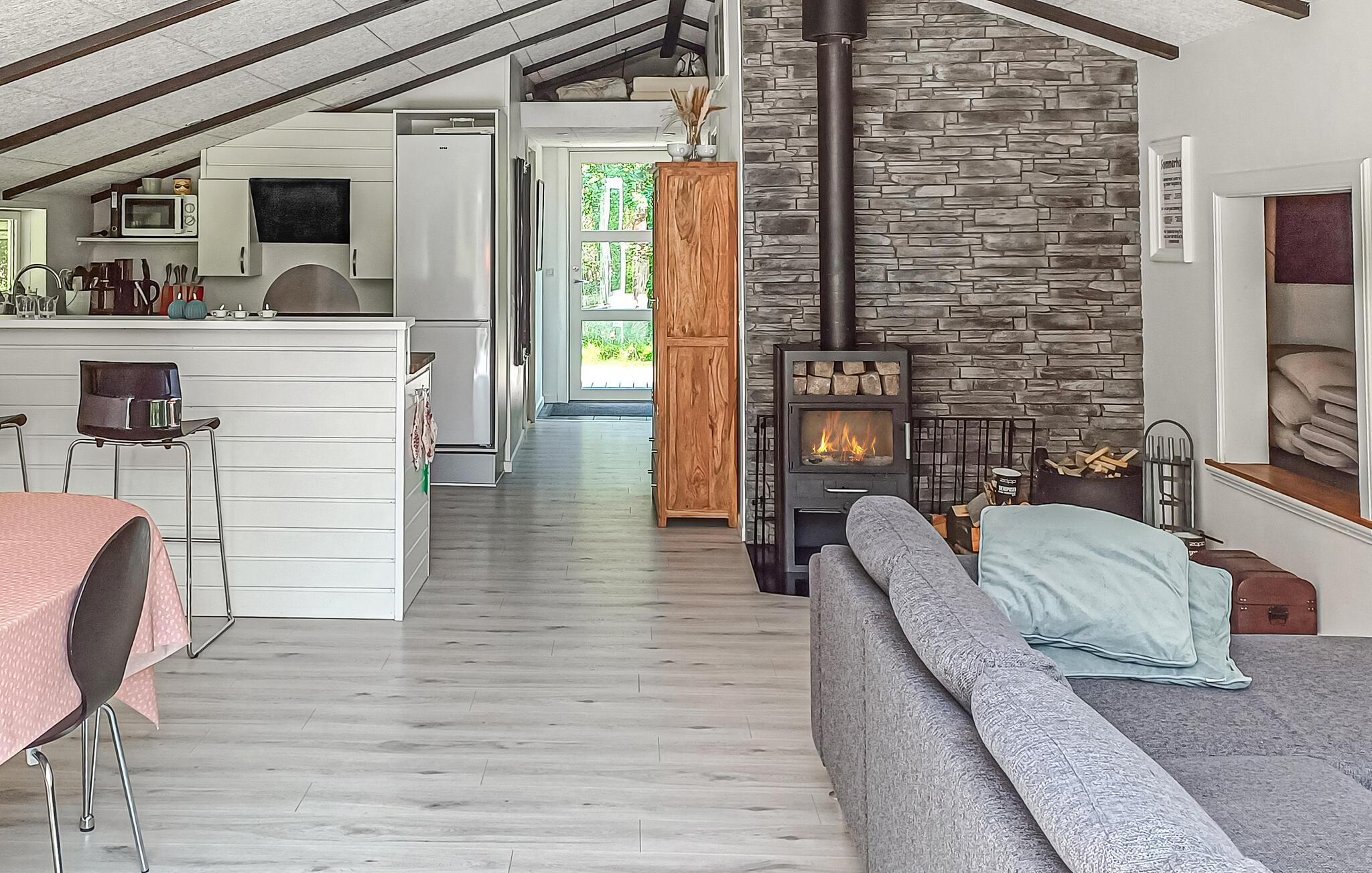 Husets hjerte er den store stue med en åben forbindelse til køkkenet, hvorfra man har adgang til terrassen med det smukke vildmarksbad. Huset er lyst og pænt dekoreret og takket være de store vinduer i stuen kan I nyde naturen selv når I er inde i huset. På dage, hvor vejret driller, kan I tilbringe tiden med en knitrende ild brændeovnen.