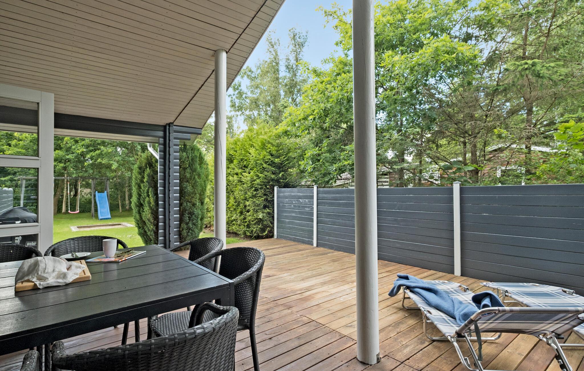 På den delvist overdækkede terrasse kan I nyde den friske luft og lade blikkene vandre ud over den velholdte have, hvor børnene kan løbe rundt og brænde lidt energi af, inden I tager på tur.