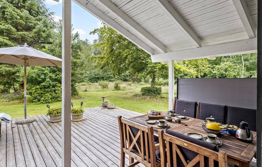 Gå også ud på træterrassen, der omgiver huset, og nyd en god kop kaffe om morgenen. Den overdækkede terrasse giver jer skygge og en hyggelig plads til fælles måltider i det fri. Sol jer på liggestolene, og se børnene lege i haven.