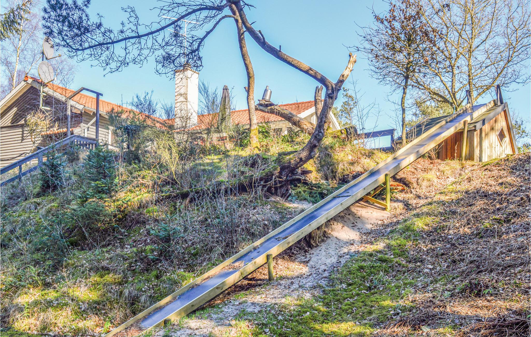Dette skønne sommerhus ligger på en dejlig grund i det naturskønne Helberskov. Huset er praktisk indrettet og udstyret med komfortable møbler. Fra stuen er der udgang til dejlige terrasser, hvor I rigtig kan slappe af og nyde ferien. Den store grund er særdeles børnevenlig, her findes foruden bålplads, gynge og sandkasse, en meget lang rutsjebane, der går fra taget af legehuset ned i den lavere liggende del af haven. Der er desuden fine muligheder for udeliv og aktiviteter hele dagen.