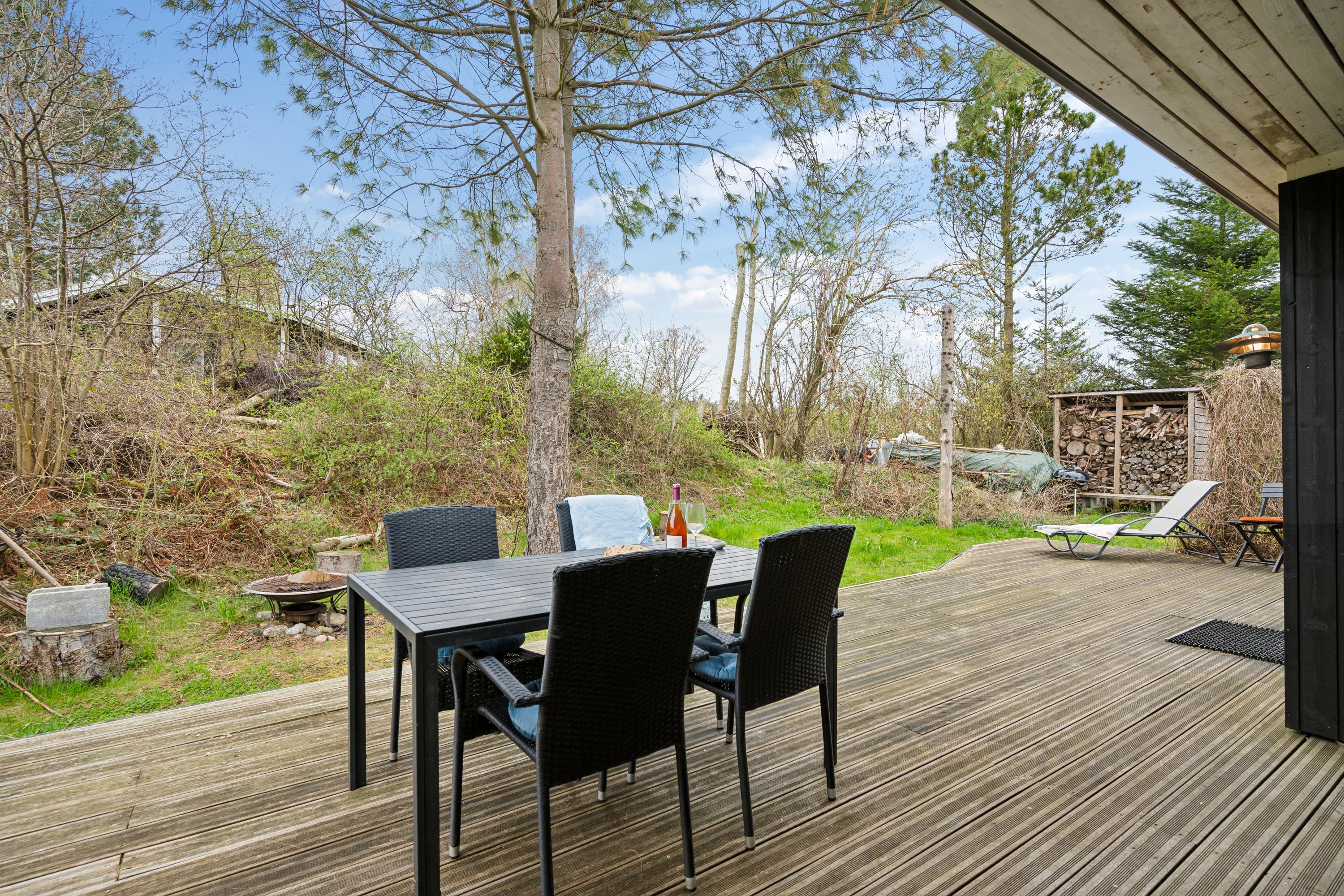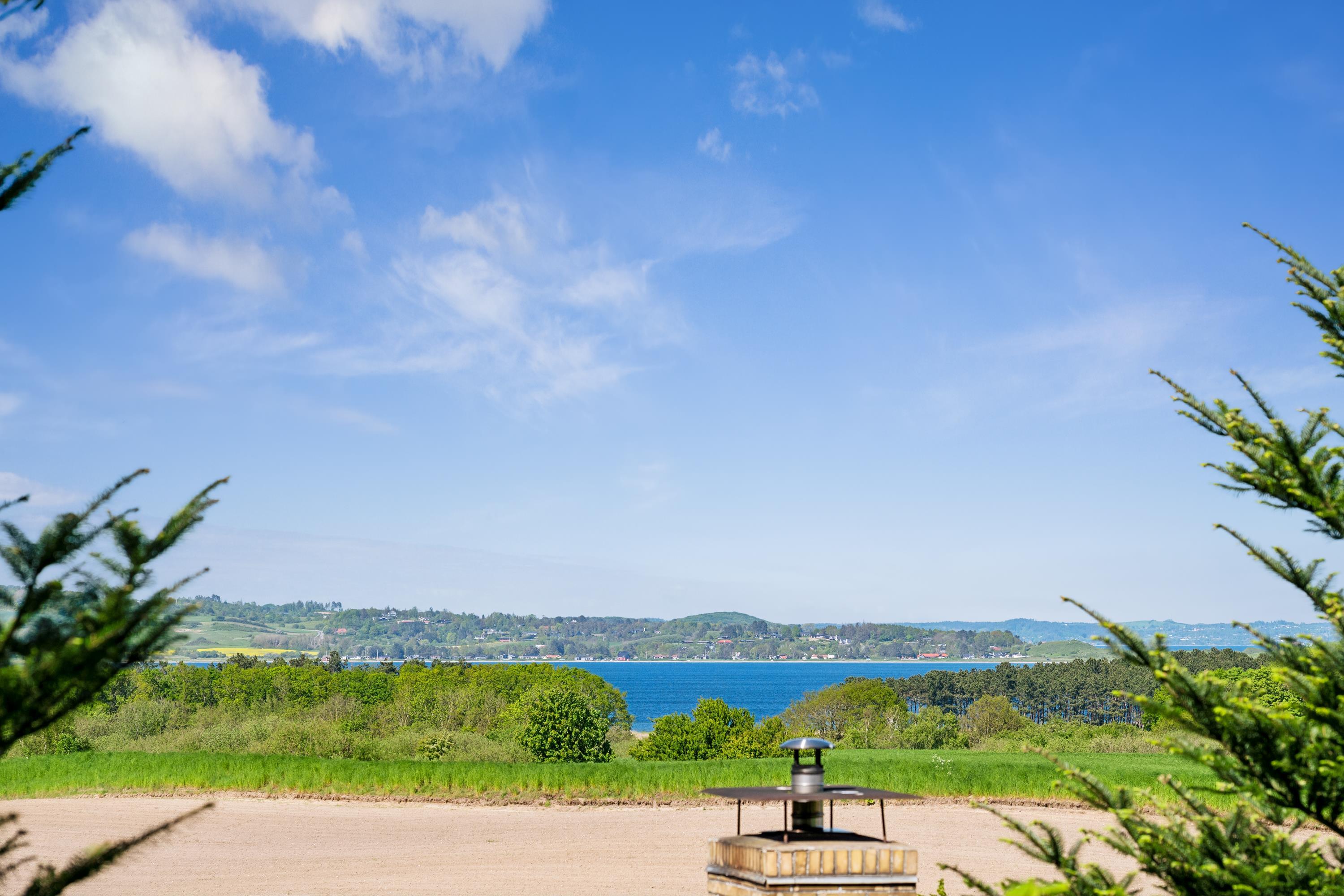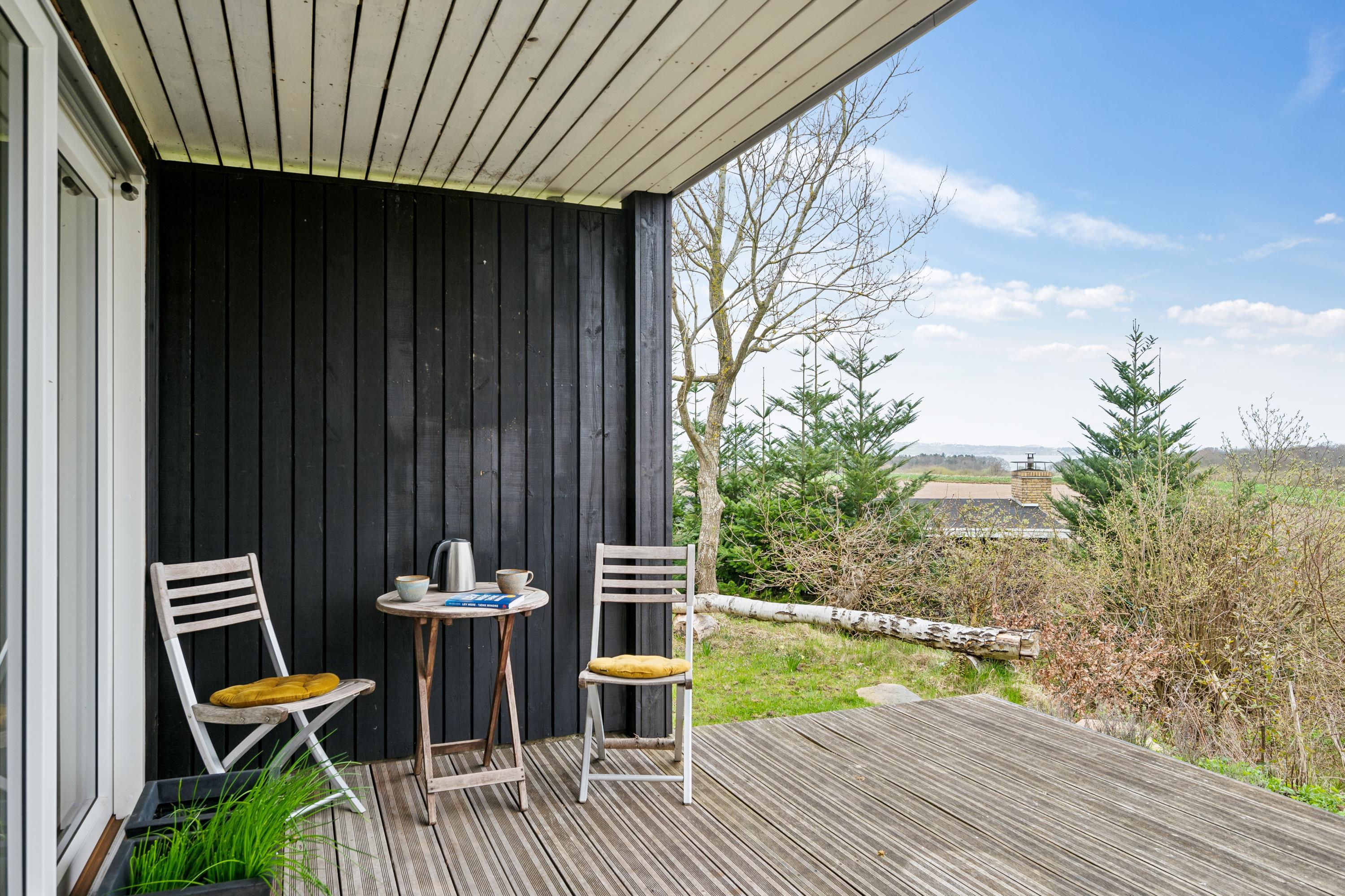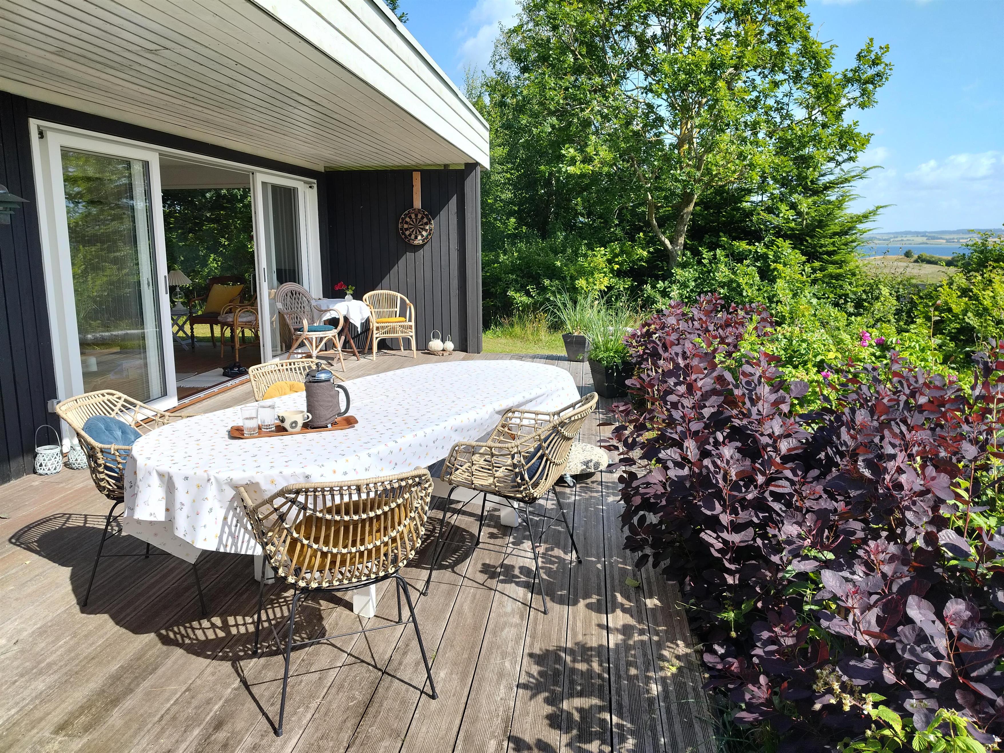 Hyggeligt feriehus på Mols med stor terrasse, bålplads og smuk udsigt over vand og landskab.