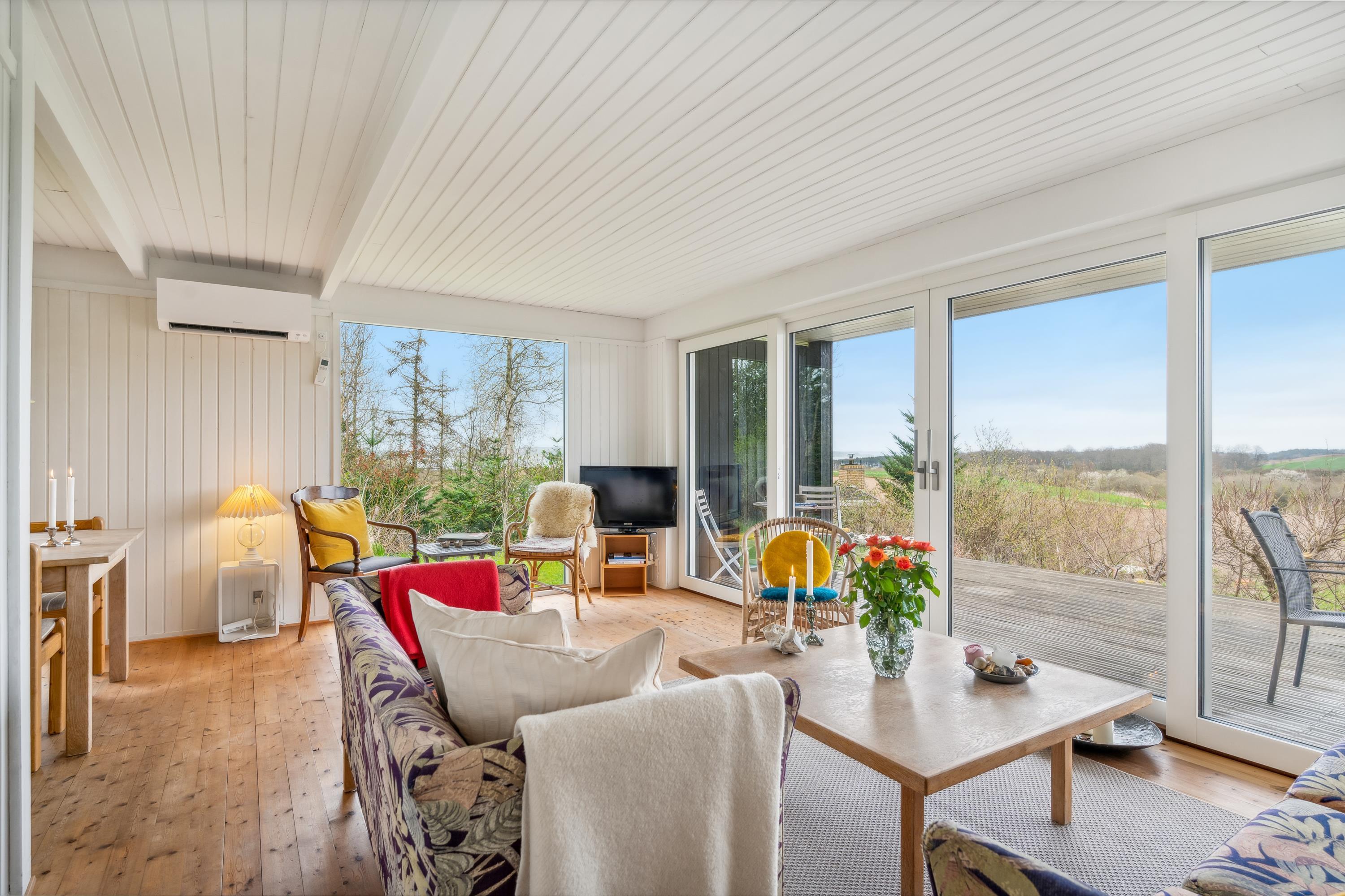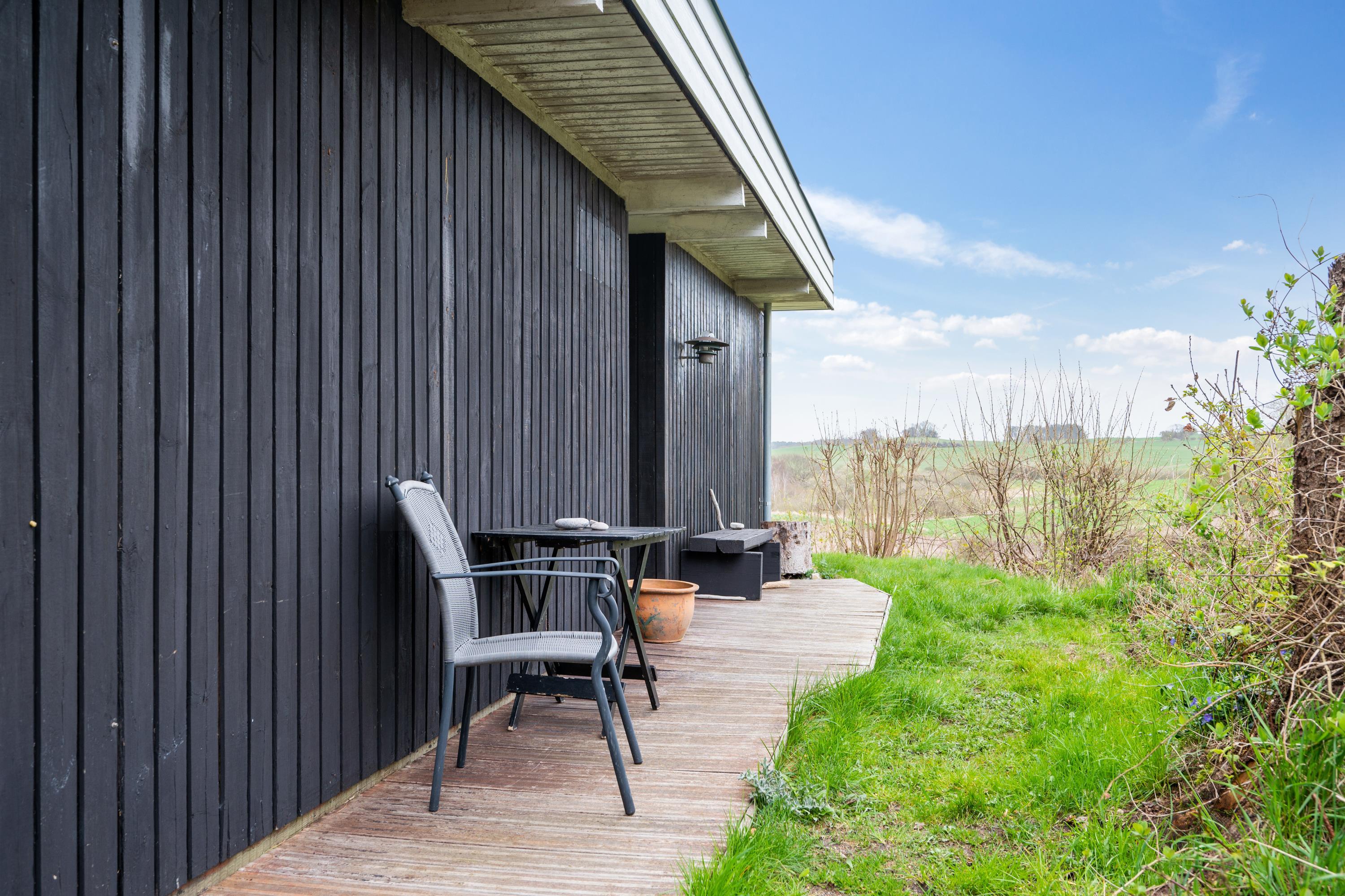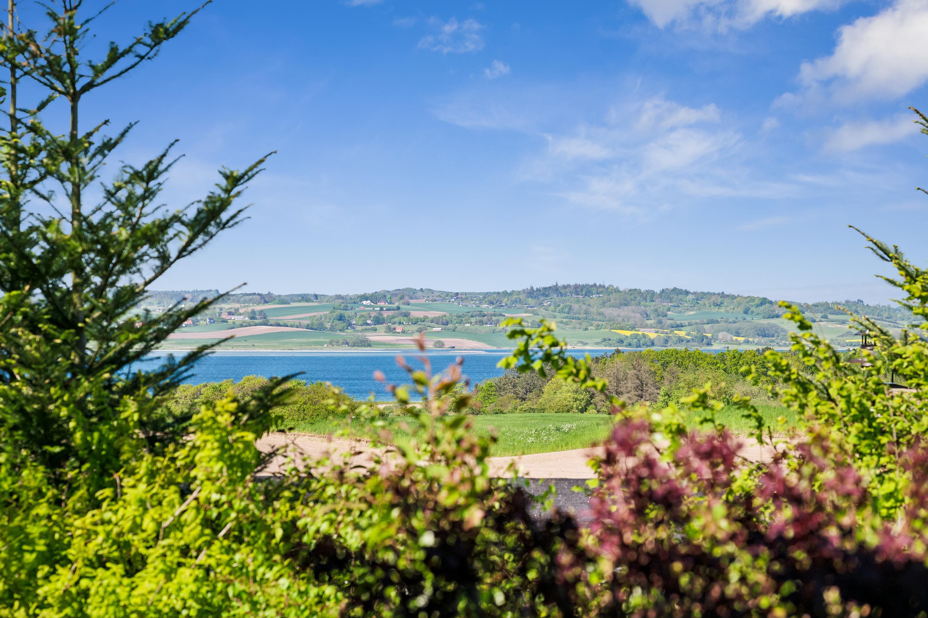 Hyggeligt feriehus på Mols med stor terrasse, bålplads og smuk udsigt over vand og landskab.