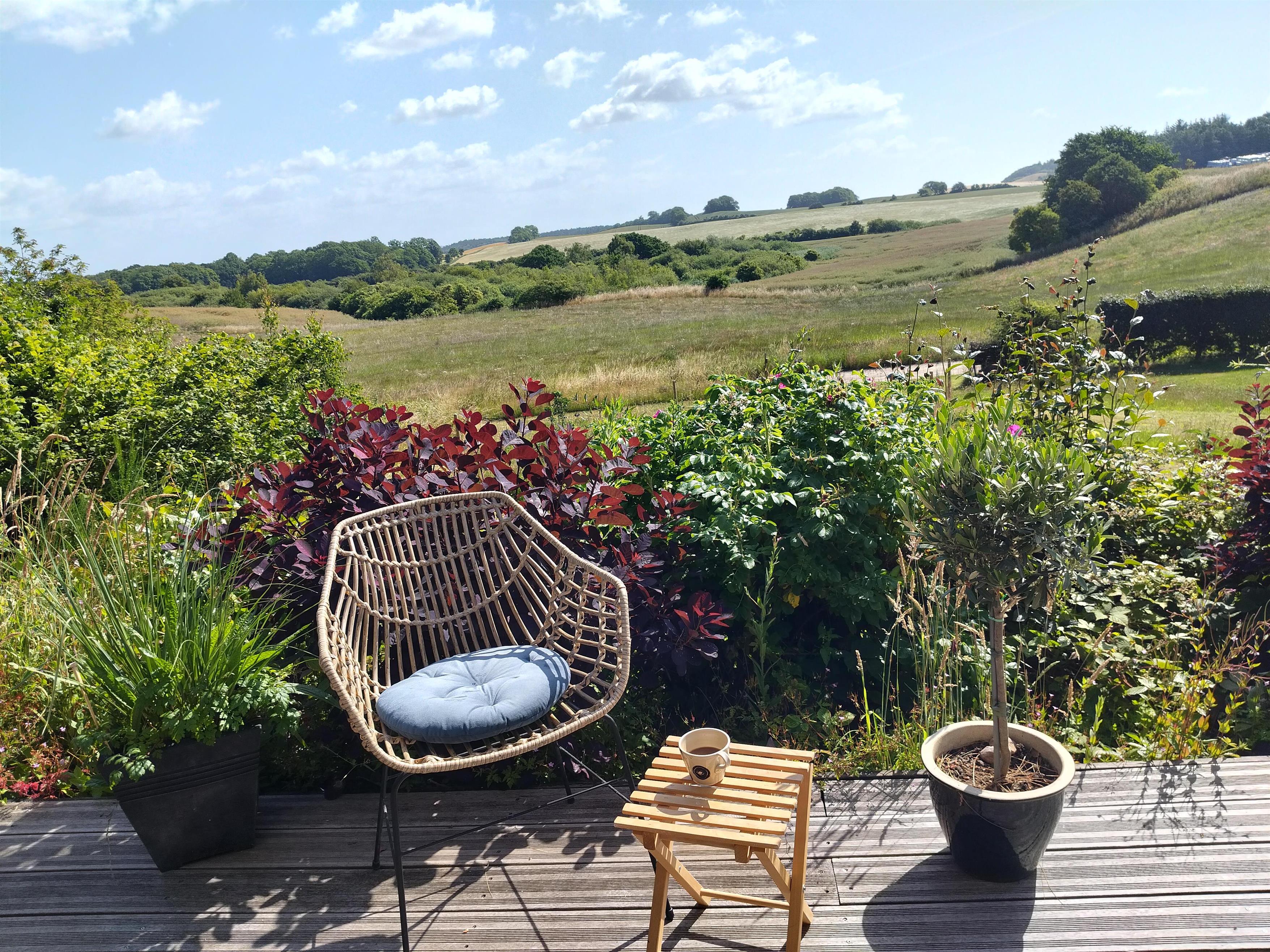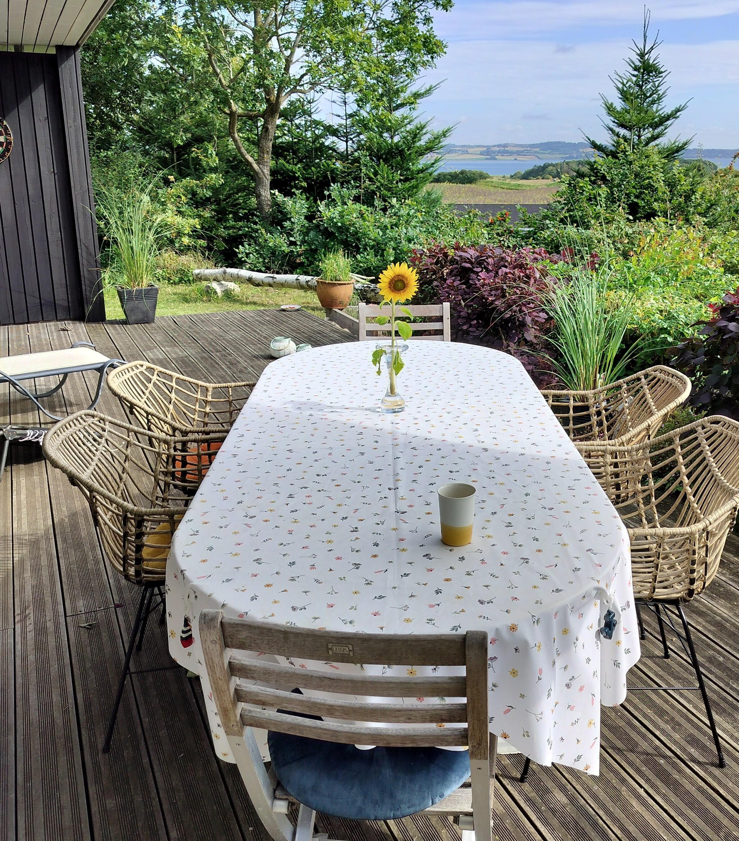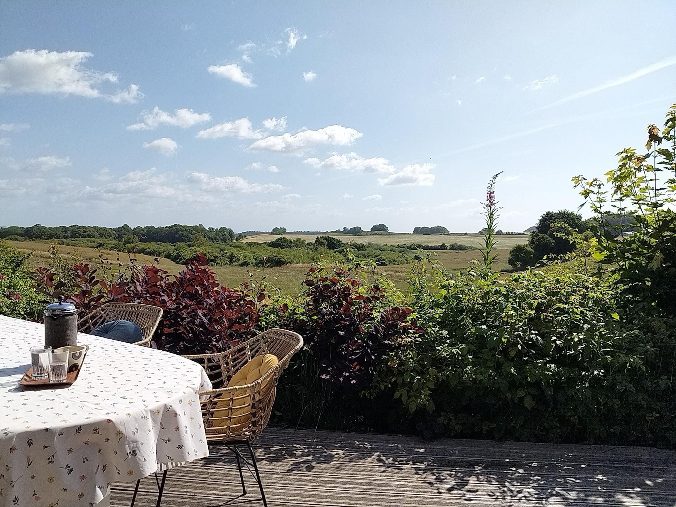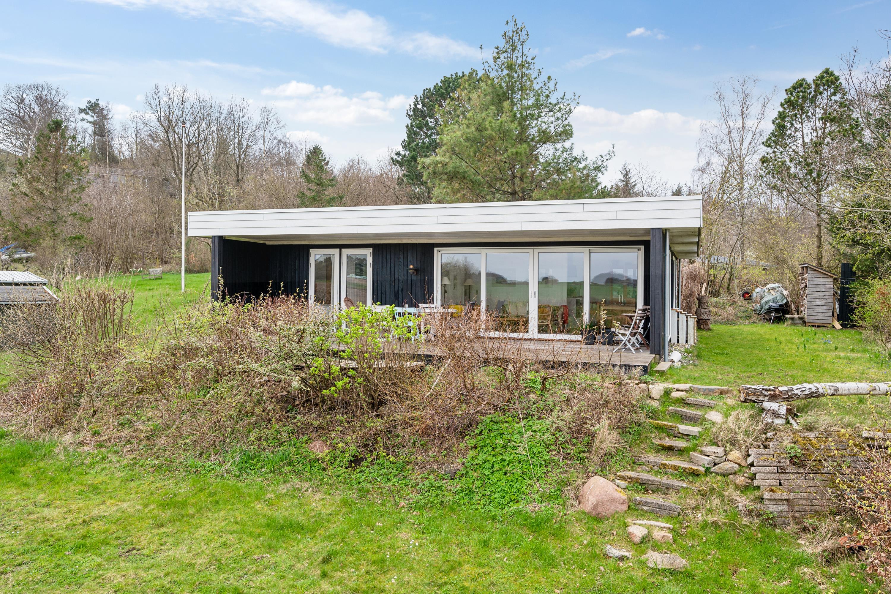Hyggeligt feriehus på Mols med stor terrasse, bålplads og smuk udsigt over vand og landskab.