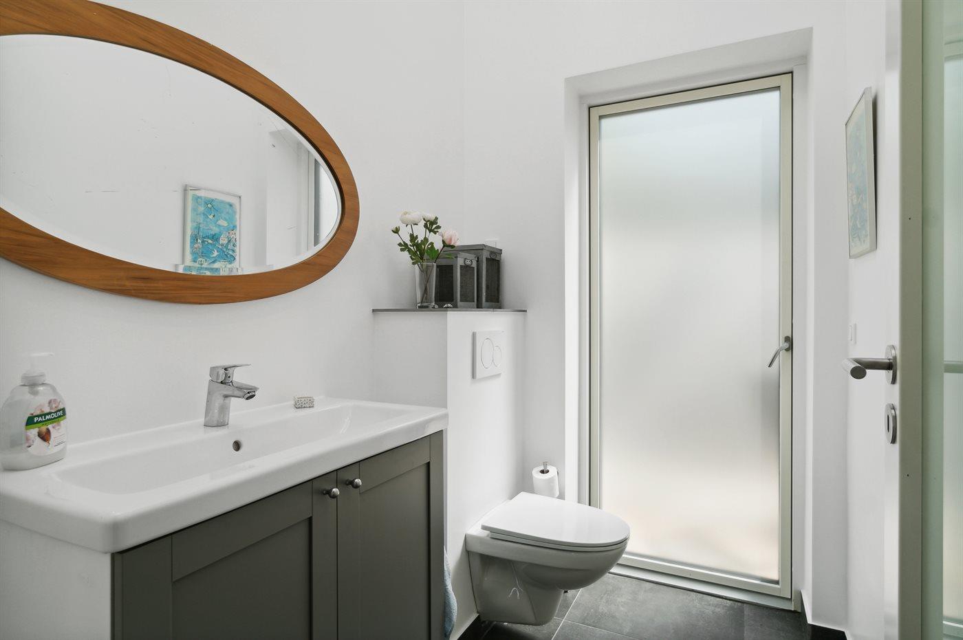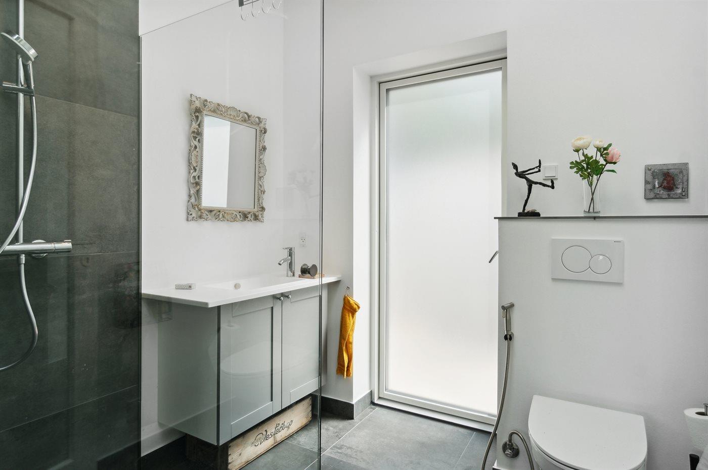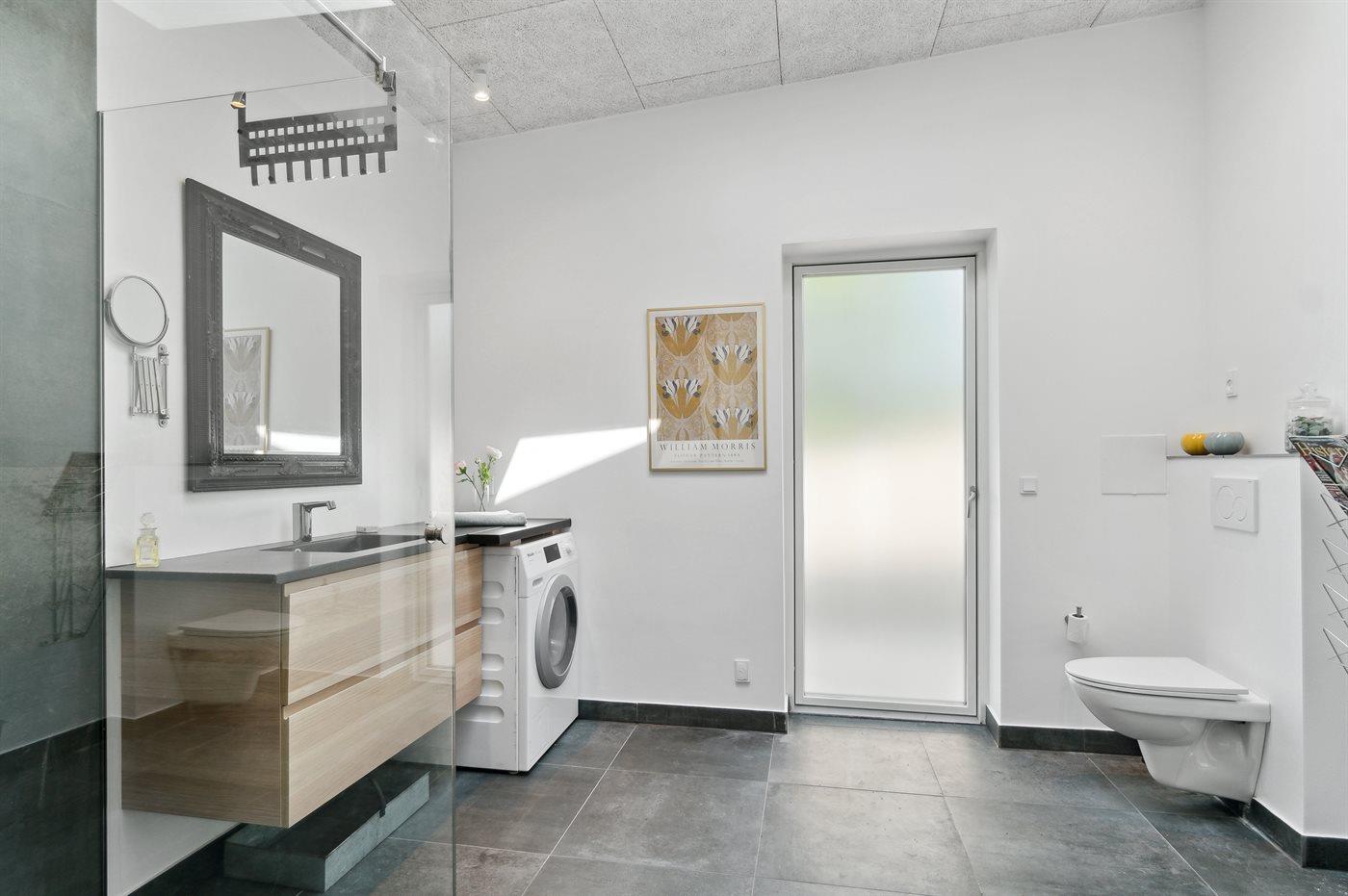 Der er 2 badeværelser med bruseniche og 3 toiletter, heraf 1 gæstetoilet. Der er gulvvarme på 1 badeværelse. Der er gulvvarme på gæstetoilettet.