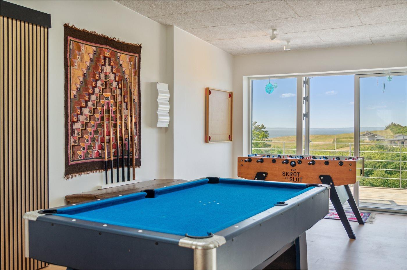 Dette sommerhus er mere end blot enestående beliggenhed og imponerende arkitektur. Det er også en legeplads for sjælen og kan rumme op til 12 mennesker uden at give afkald på komfort og rummelighed. Det imponerende aktivitetsrum er hjertet af huset, der vil henrykke både børn og barnlige sjæle. Her findes alt, hvad man kunne ønske sig af underholdning, herunder et poolbord, bordtennis, bordfodbold, dart og bobspil. Uanset om man er til konkurrence eller bare ønsker at have det sjovt og skabe uforglemmelige minder, vil dette rum være en kilde til glæde og latter.