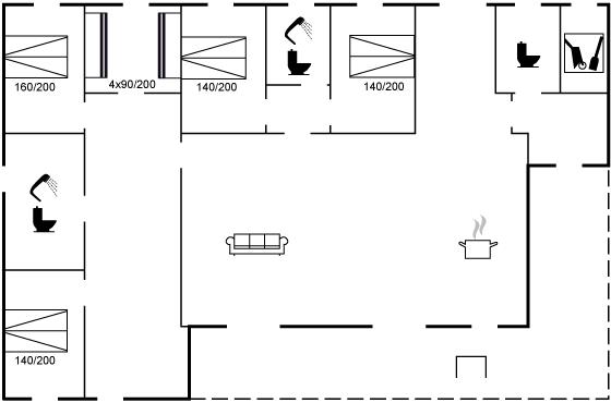 Der er i alt 5 soveværelser. Sovepladserne fordeler sig på: 8 sovepladser i dobbeltsenge. 4 sovepladser i køjesenge. Derudover er der 1 stk. barneseng.