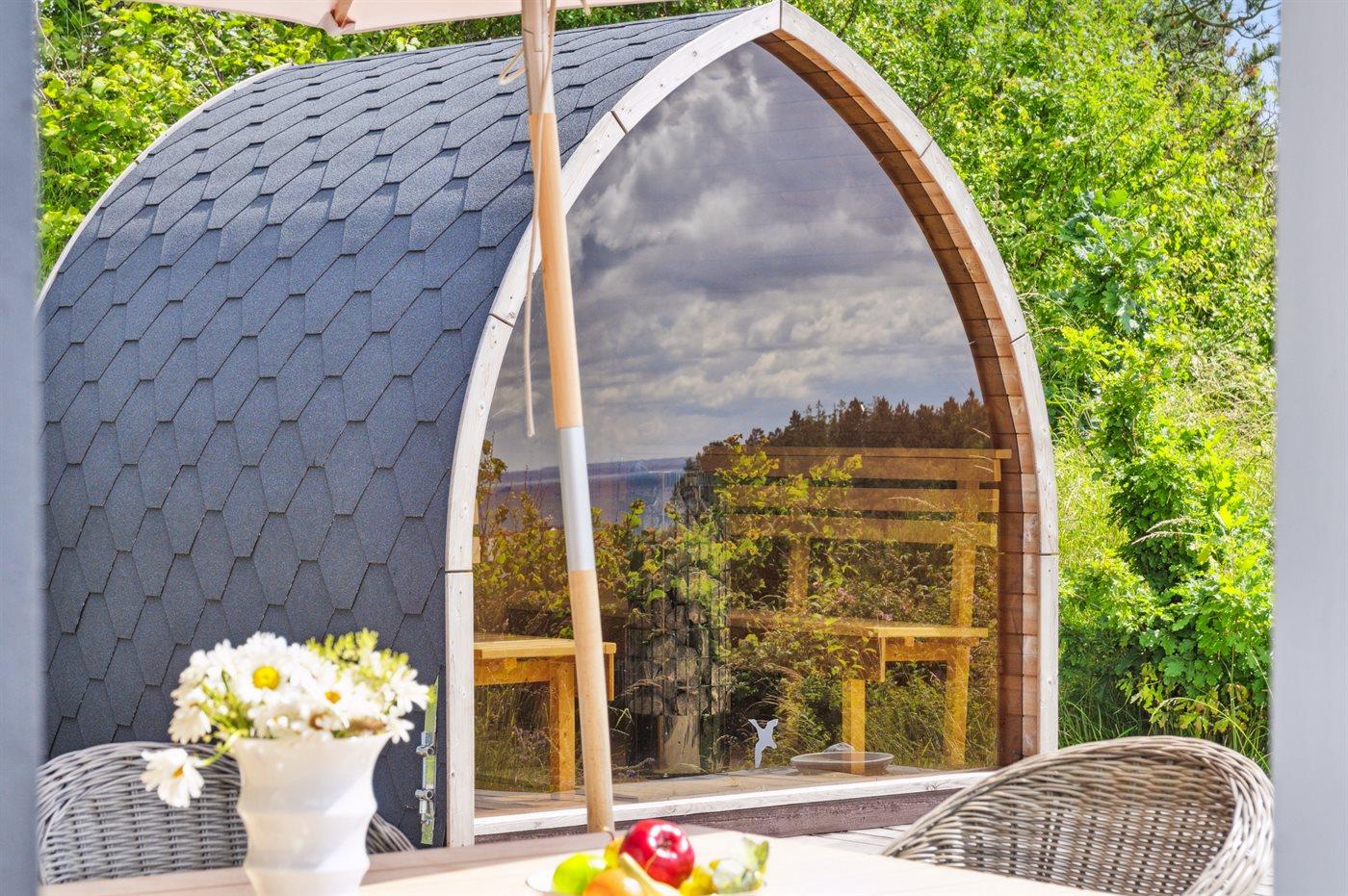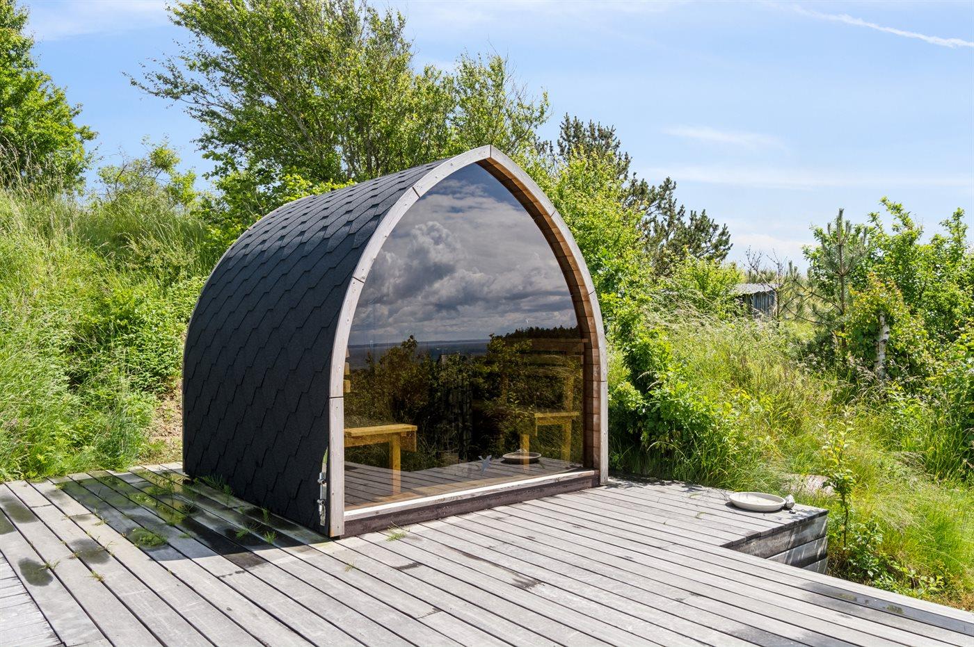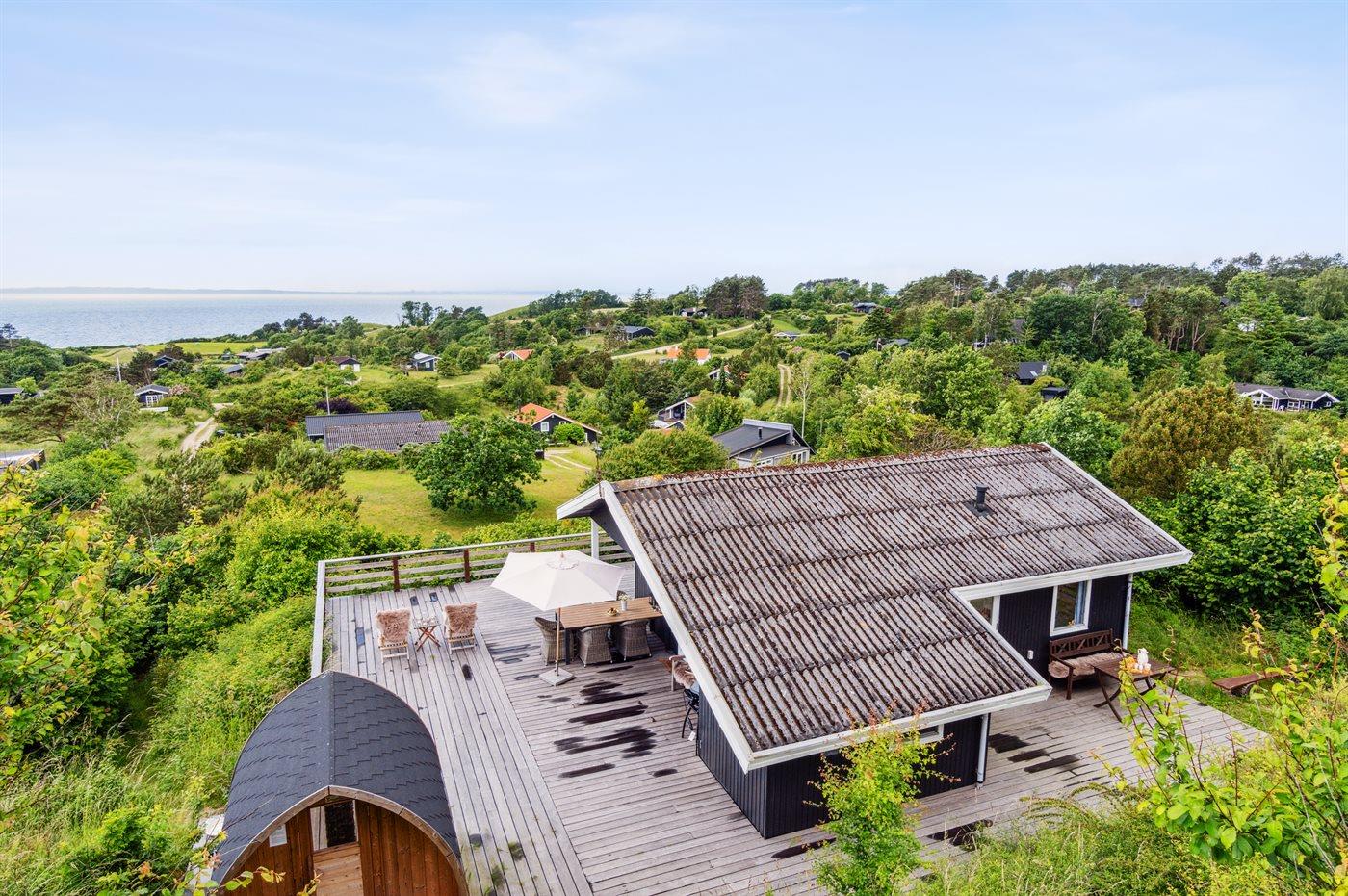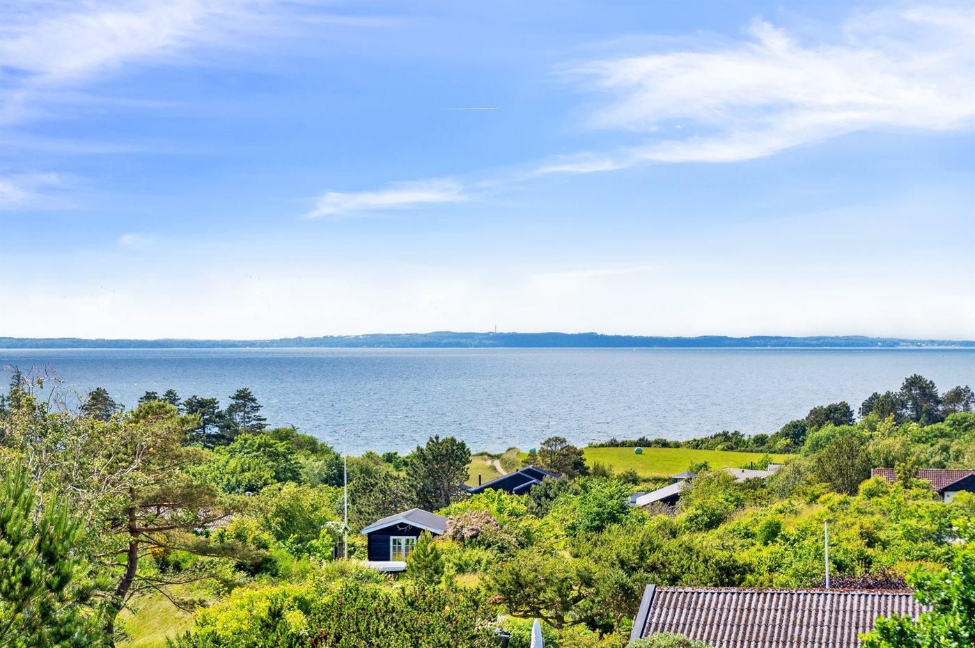 Dette skønne og velholdte sommerhus er beliggende i særdeles naturskønne og rolige omgivelser på Helgenæs, som ligger på spidsen af dejlige Djursland. Sommerhusets beliggenhed i det bakkede terræn er ganske sublimt med en utrolig flot og varierende udsigt over ikke mindst havet, men i høj grad også de omkringliggende sommerhuse og naturen som helhed. Fra den store og indbydende terrasse kan solen og udsigten nydes, og på klare dage kan Aarhus ses på den anden side af havet. Ydermere står der en stor udendørs sauna på terrassen med et stort glasparti, som er rettet imod udsigten. Her er det helt oplagt at nyde udsigten på kolde vinterdage, eller når turen går hjem fra stranden.