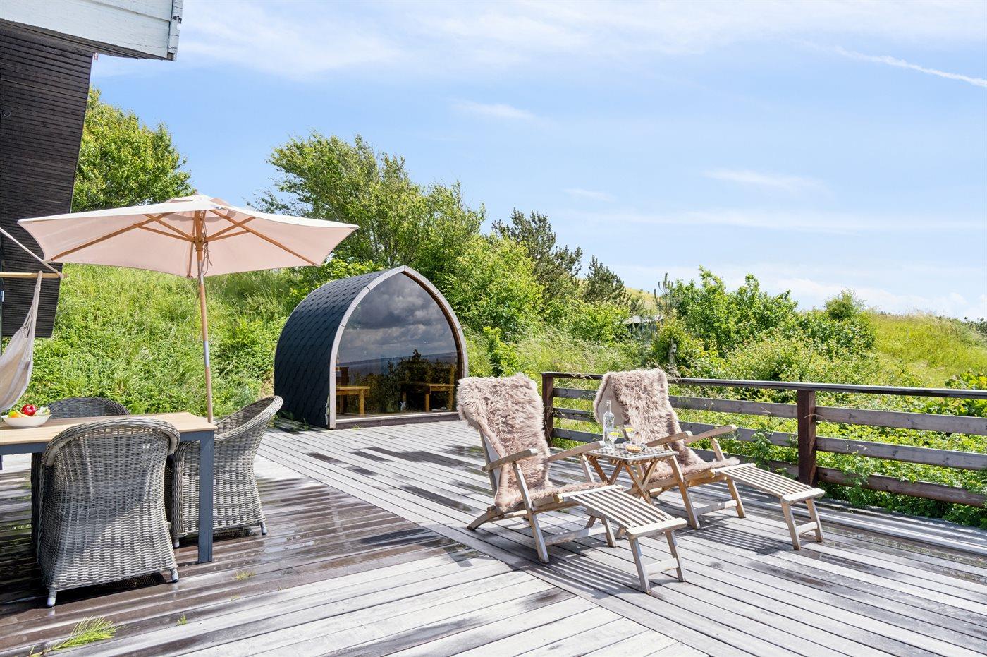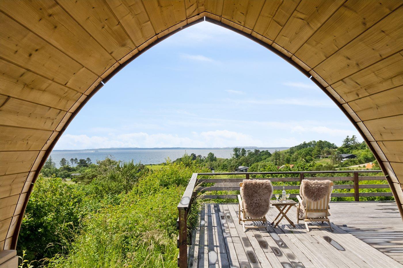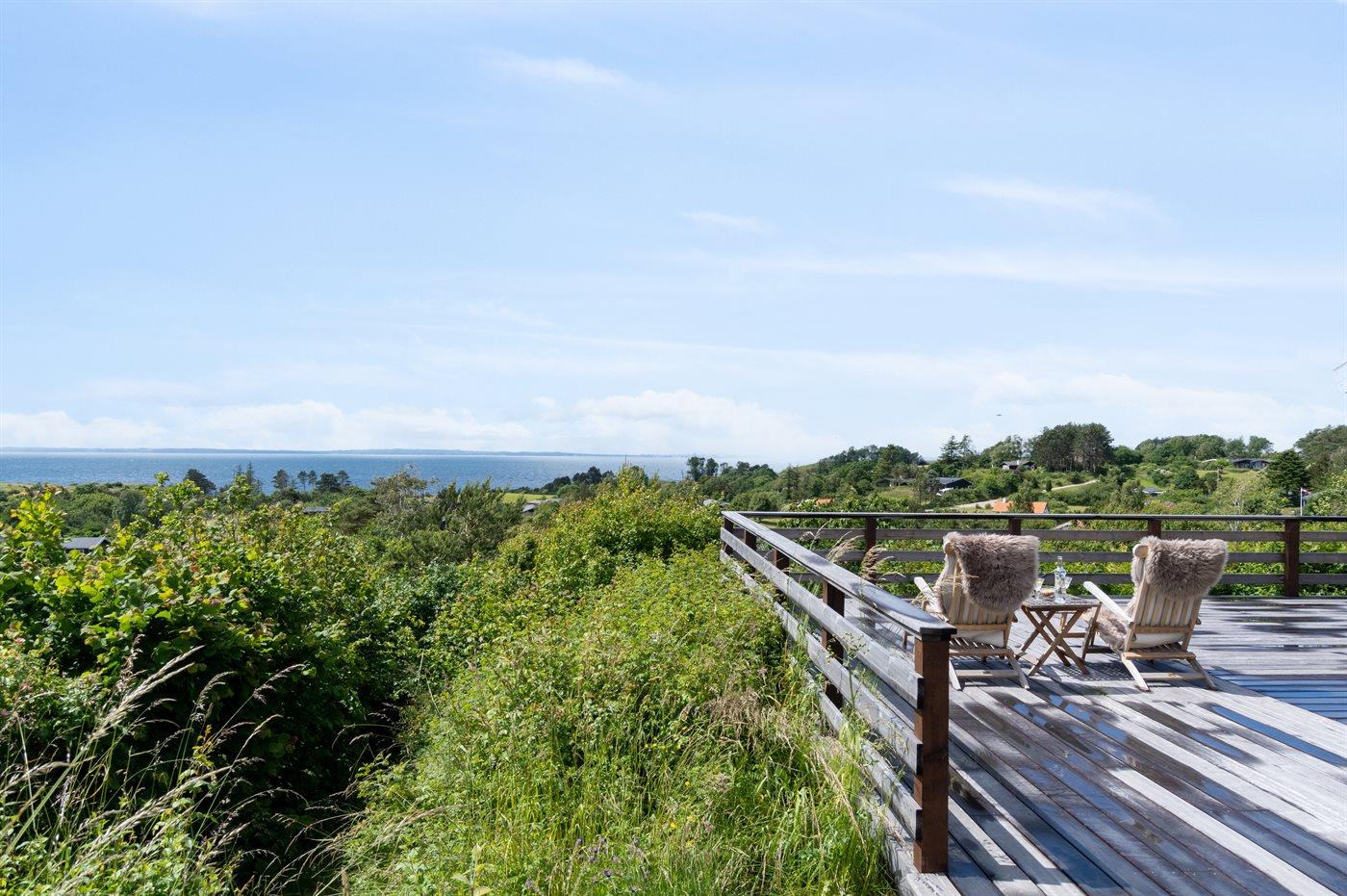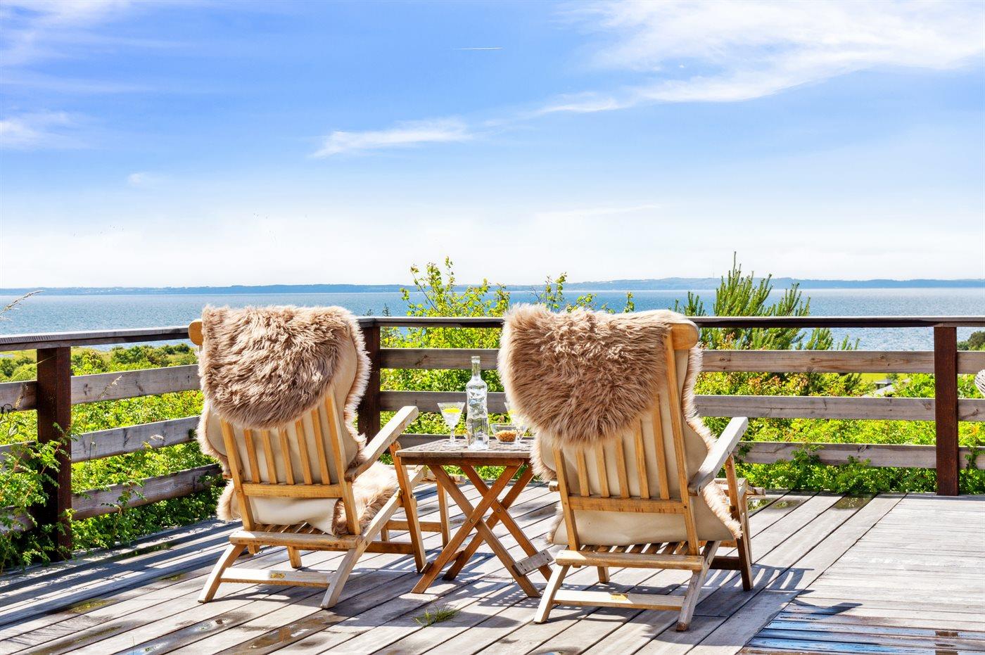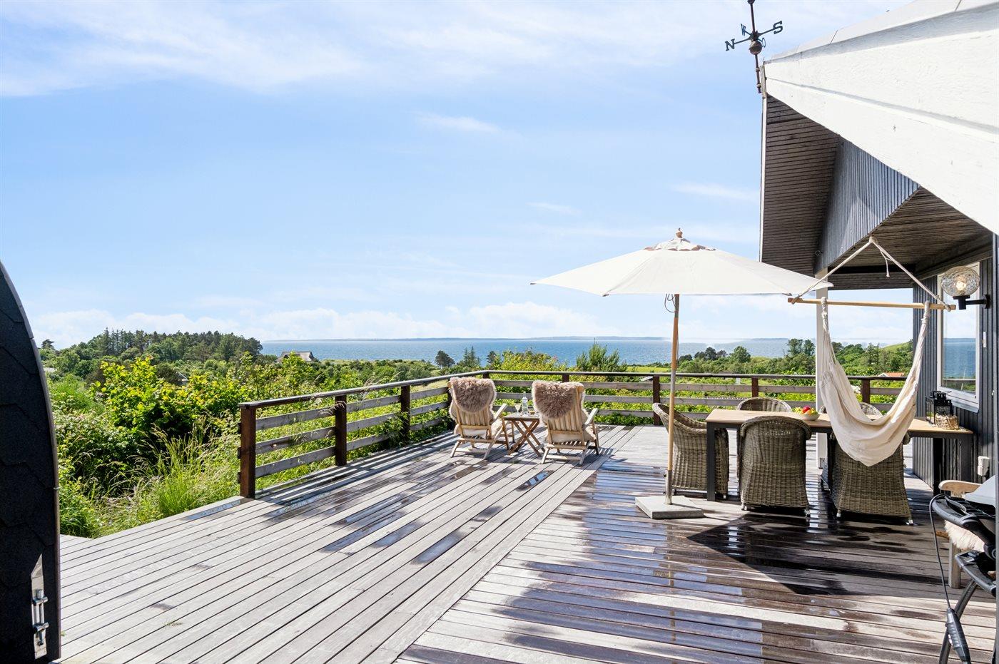 Skønt sommerhus på Helgenæs med fantastisk havudsigt og stor terrasse med udendørs sauna.